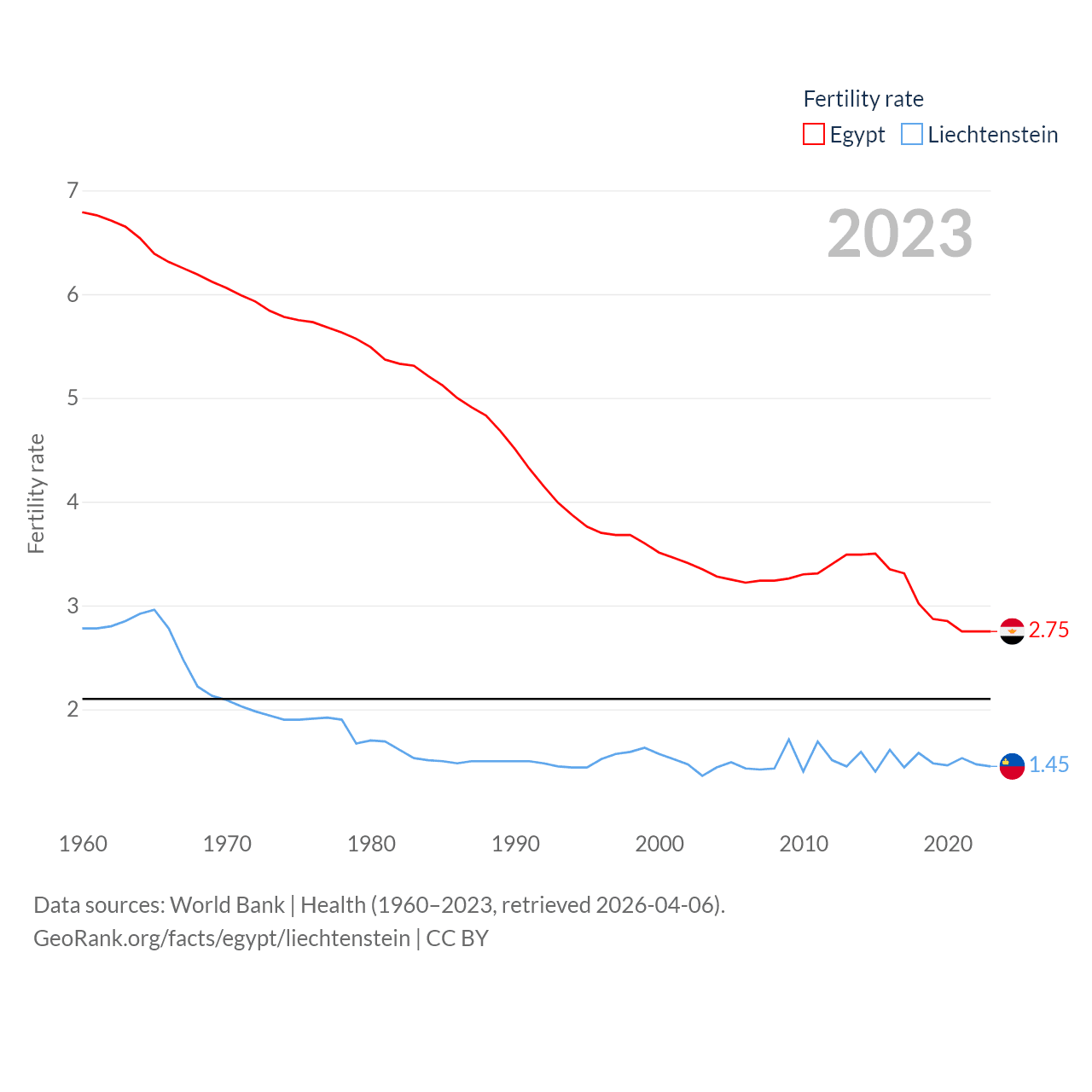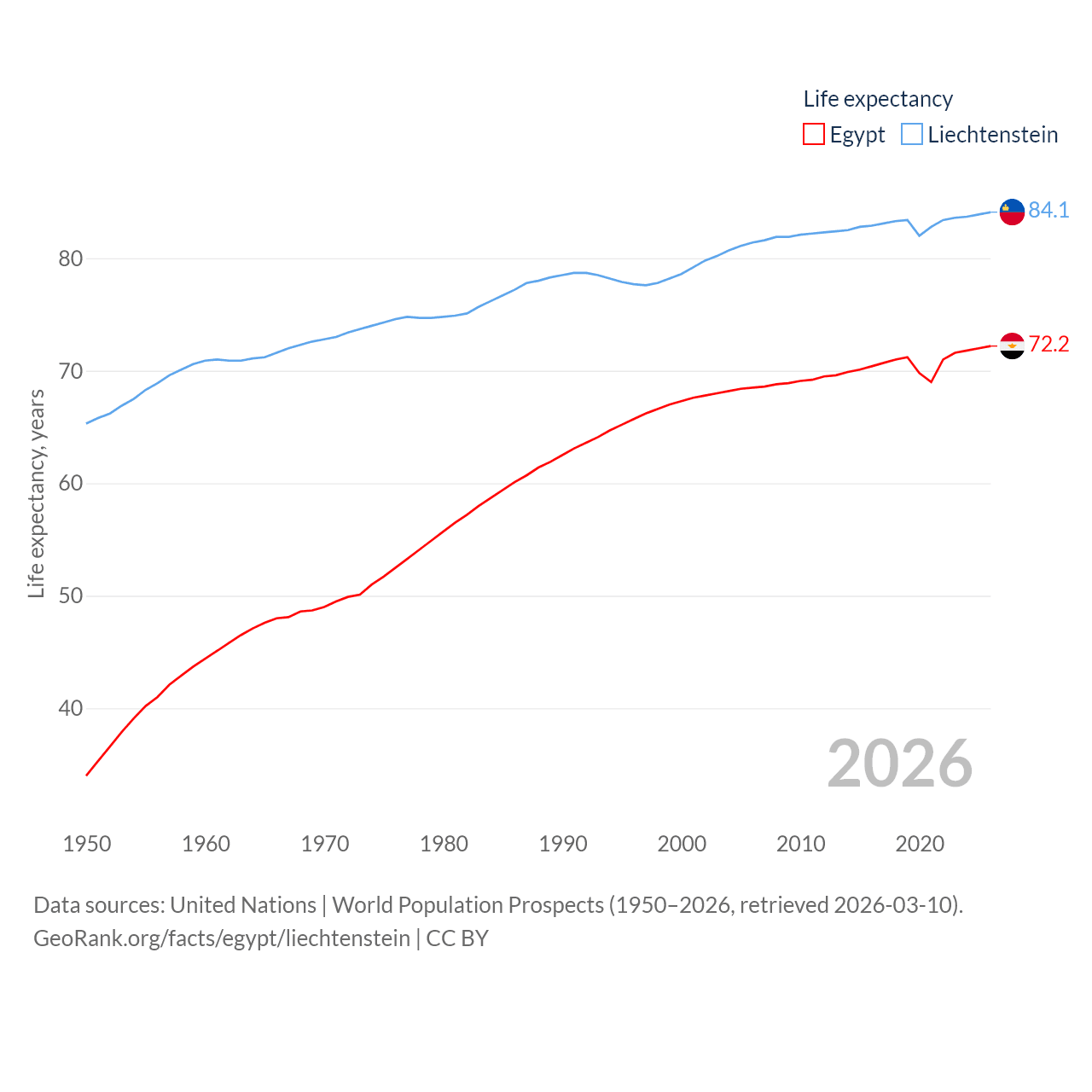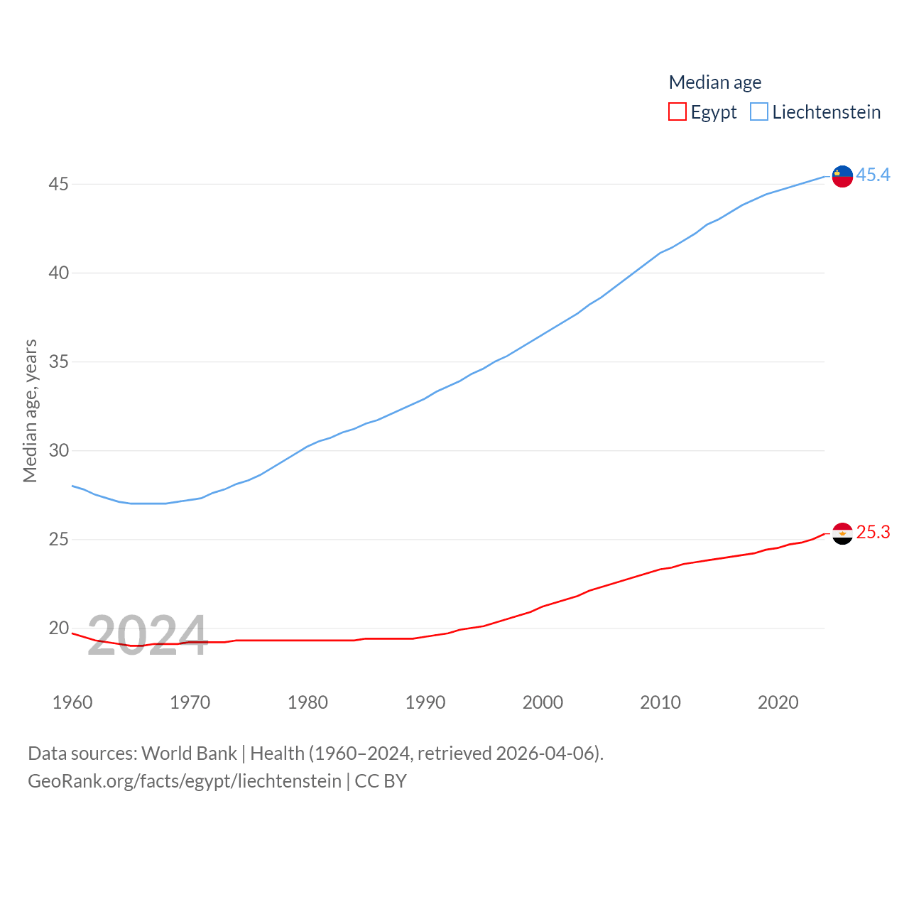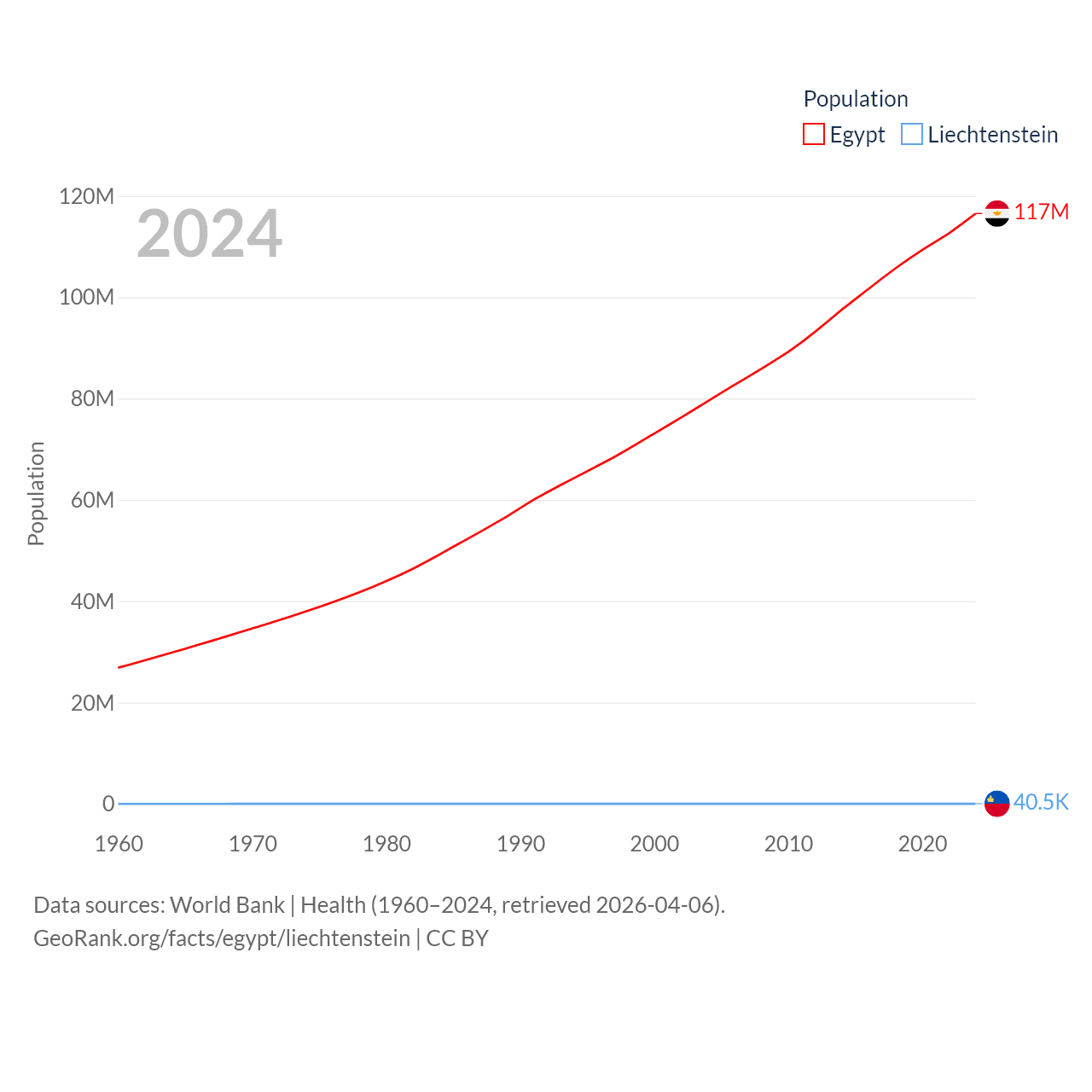 Egypt has a population of 117M (ranked 13/197), compared with 40.4K in Liechtenstein (ranked 190/197). Egypt's land area is 384,345 sq mi versus 61.8 sq mi for Liechtenstein (ranked 29th vs. 192nd).
