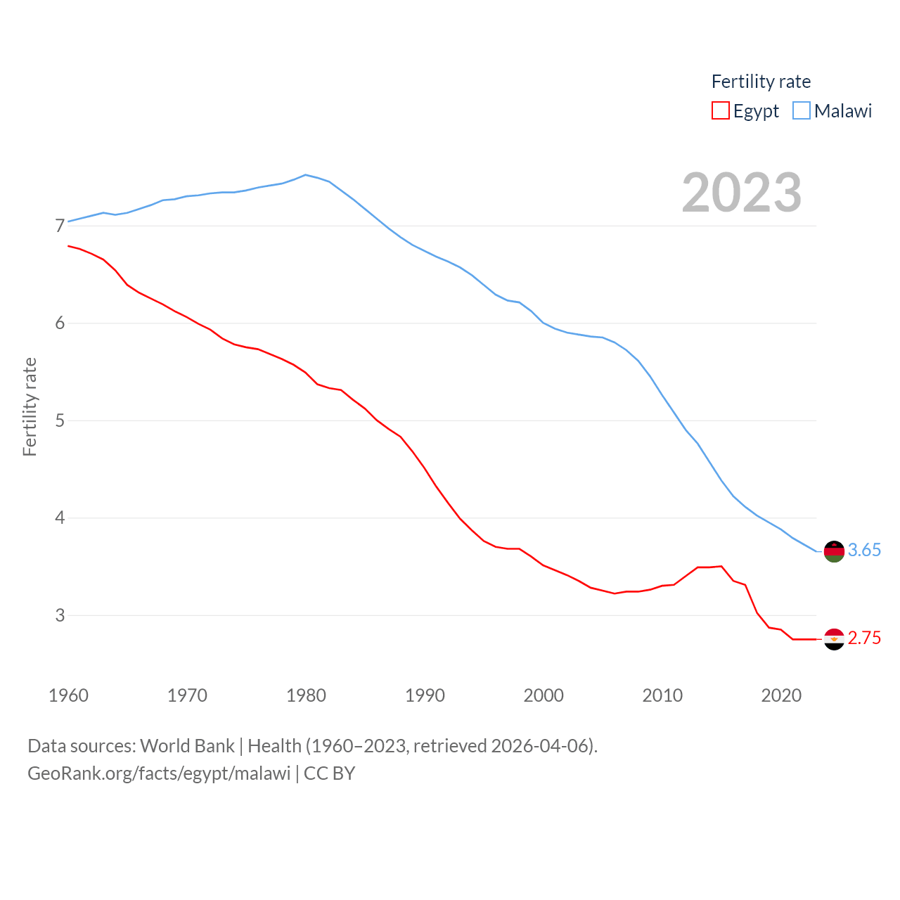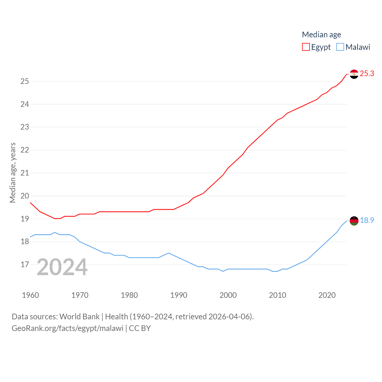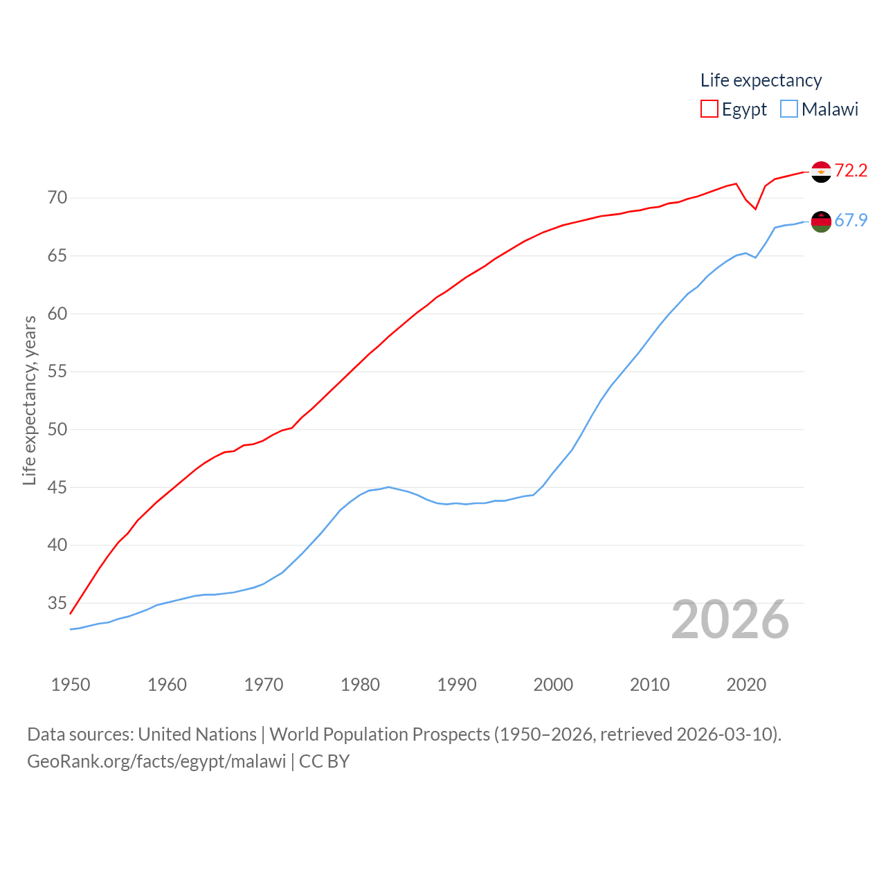 Egypt has a population of 117M (ranked 13/197), compared with 21.7M in Malawi (ranked 62/197). Egypt's land area is 384,345 sq mi versus 36,402 sq mi for Malawi (ranked 29th vs. 107th).