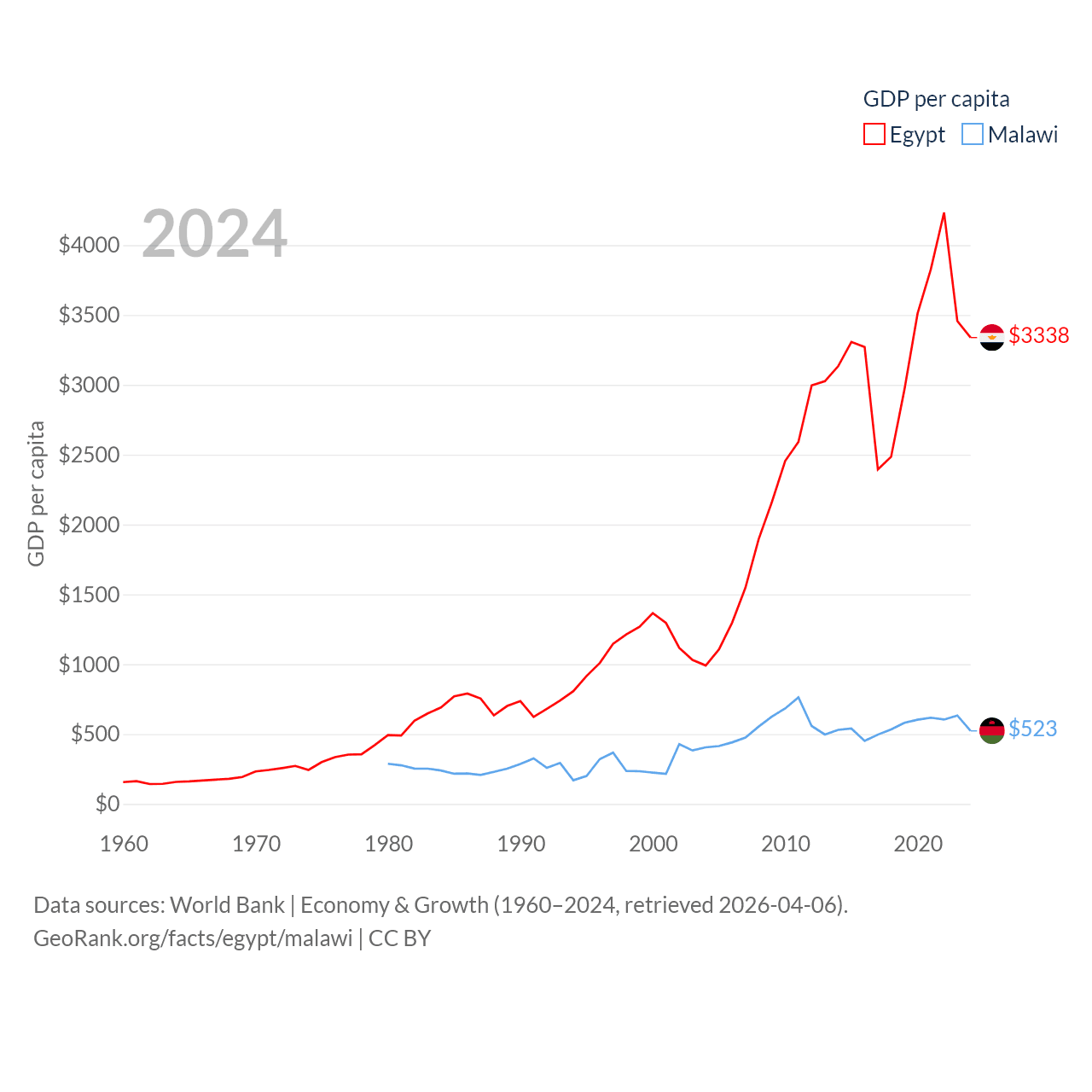 By GDP, Egypt ranks 41/197 ($389B) and Malawi ranks 151/197 ($11.3B). By GDP per capita, Egypt ranks 138/197 ($3,338), while Malawi ranks 194/197 ($523).