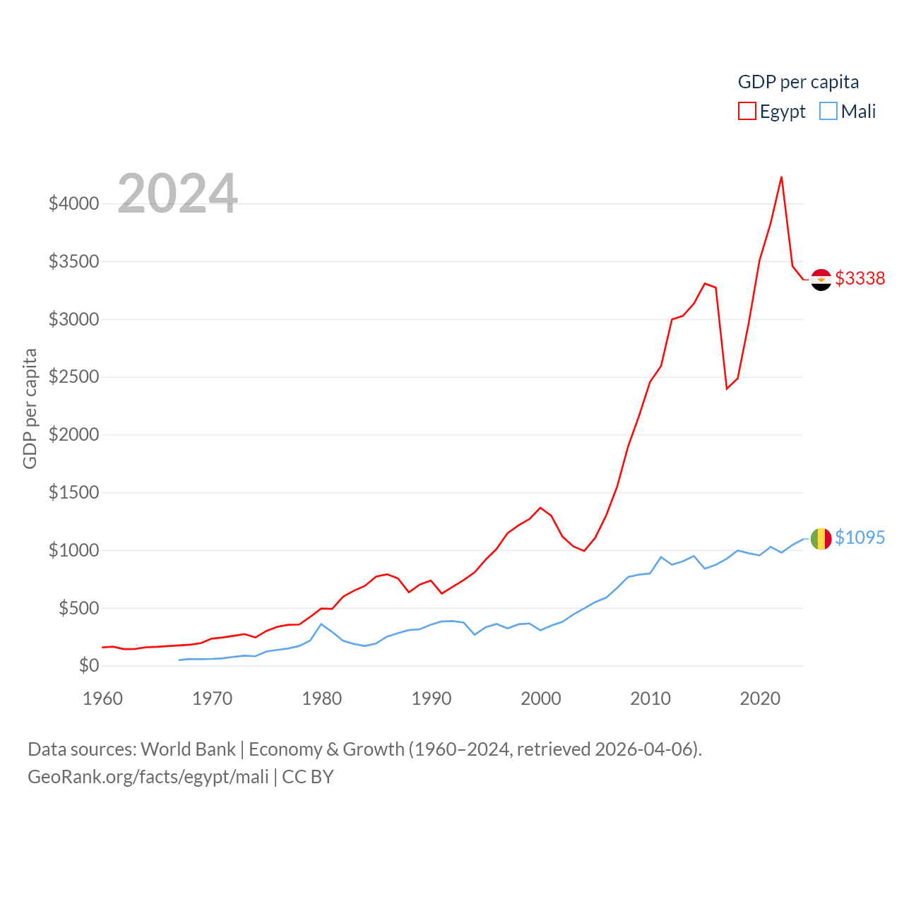By GDP, Egypt ranks 41/197 ($389B) and Mali ranks 113/197 ($26.8B). By GDP per capita, Egypt ranks 138/197 ($3,338), while Mali ranks 173/197 ($1,095).