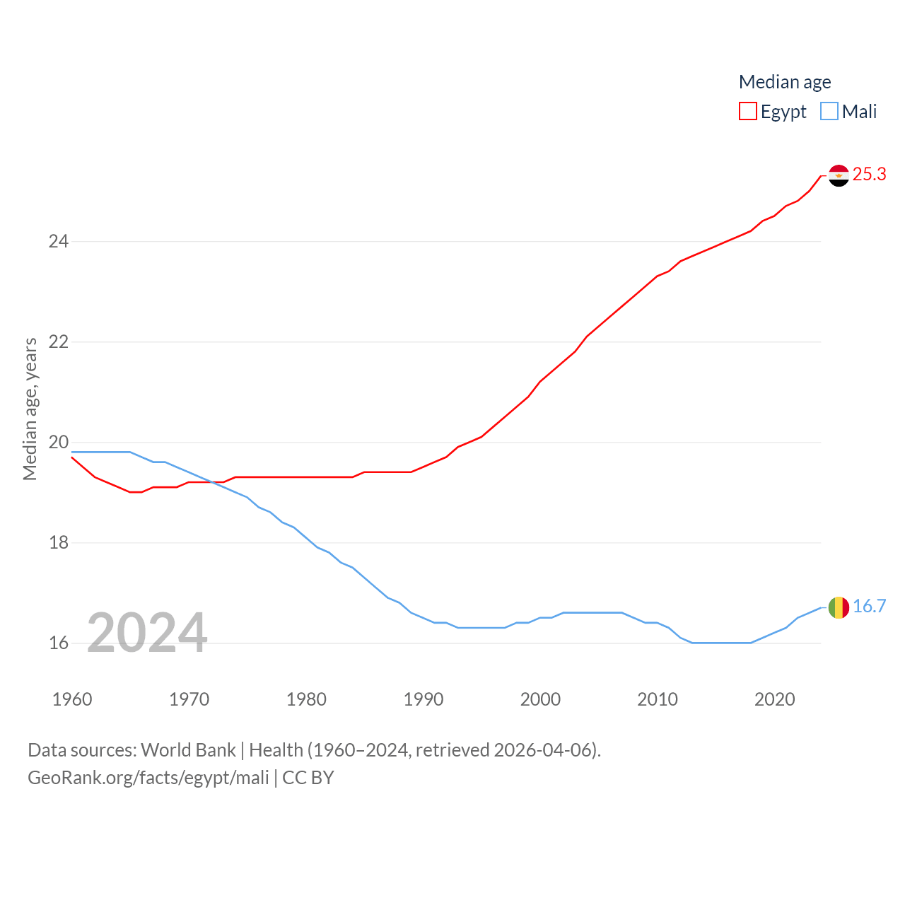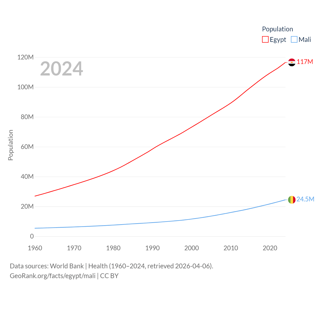 Egypt has a population of 117M (ranked 13/197), compared with 24.5M in Mali (ranked 58/197). Egypt's land area is 384,345 sq mi versus 471,118 sq mi for Mali (ranked 29th vs. 23rd).