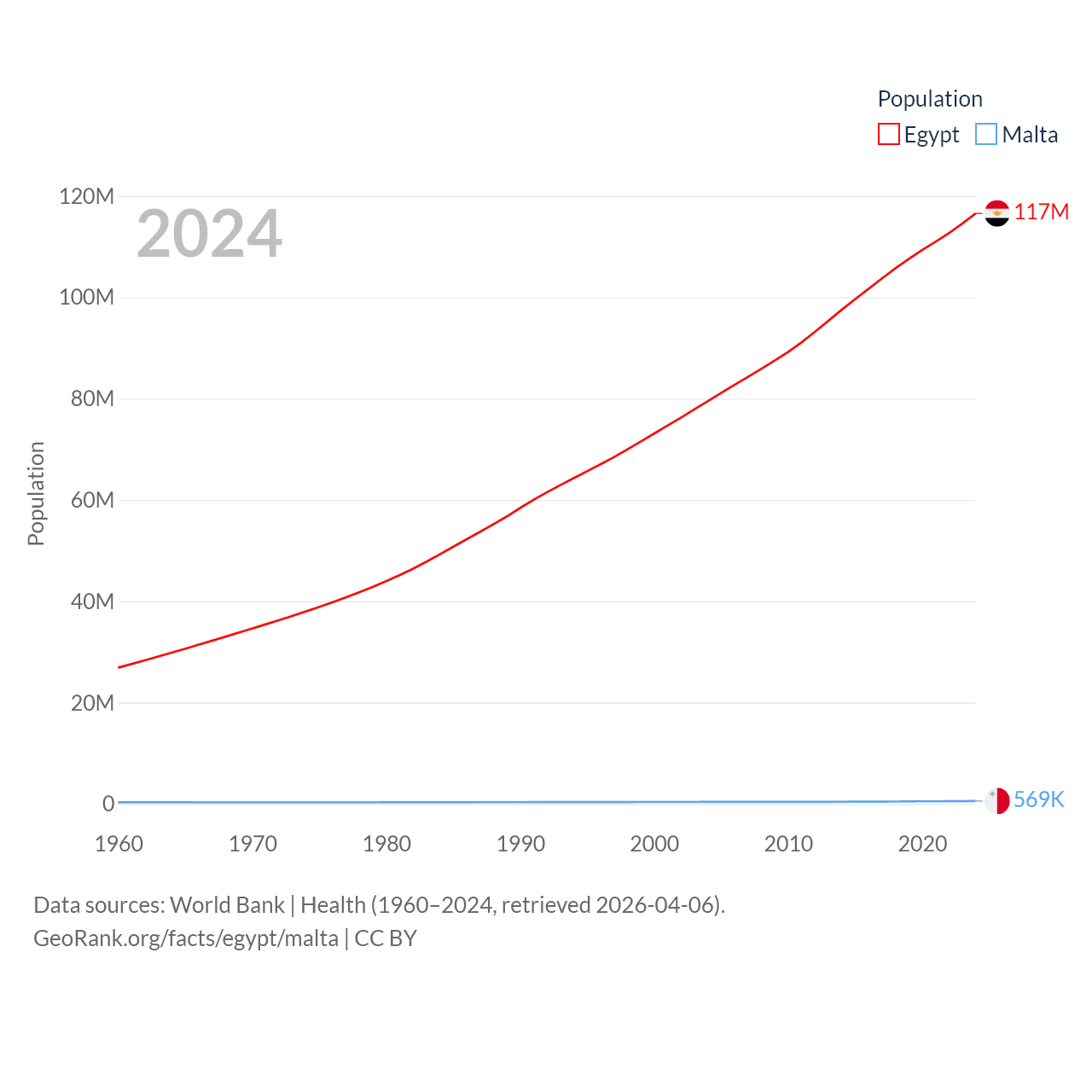Egypt has a population of 117M (ranked 13/197), compared with 569K in Malta (ranked 167/197). Egypt's land area is 384,345 sq mi versus 123.6 sq mi for Malta (ranked 29th vs. 187th).