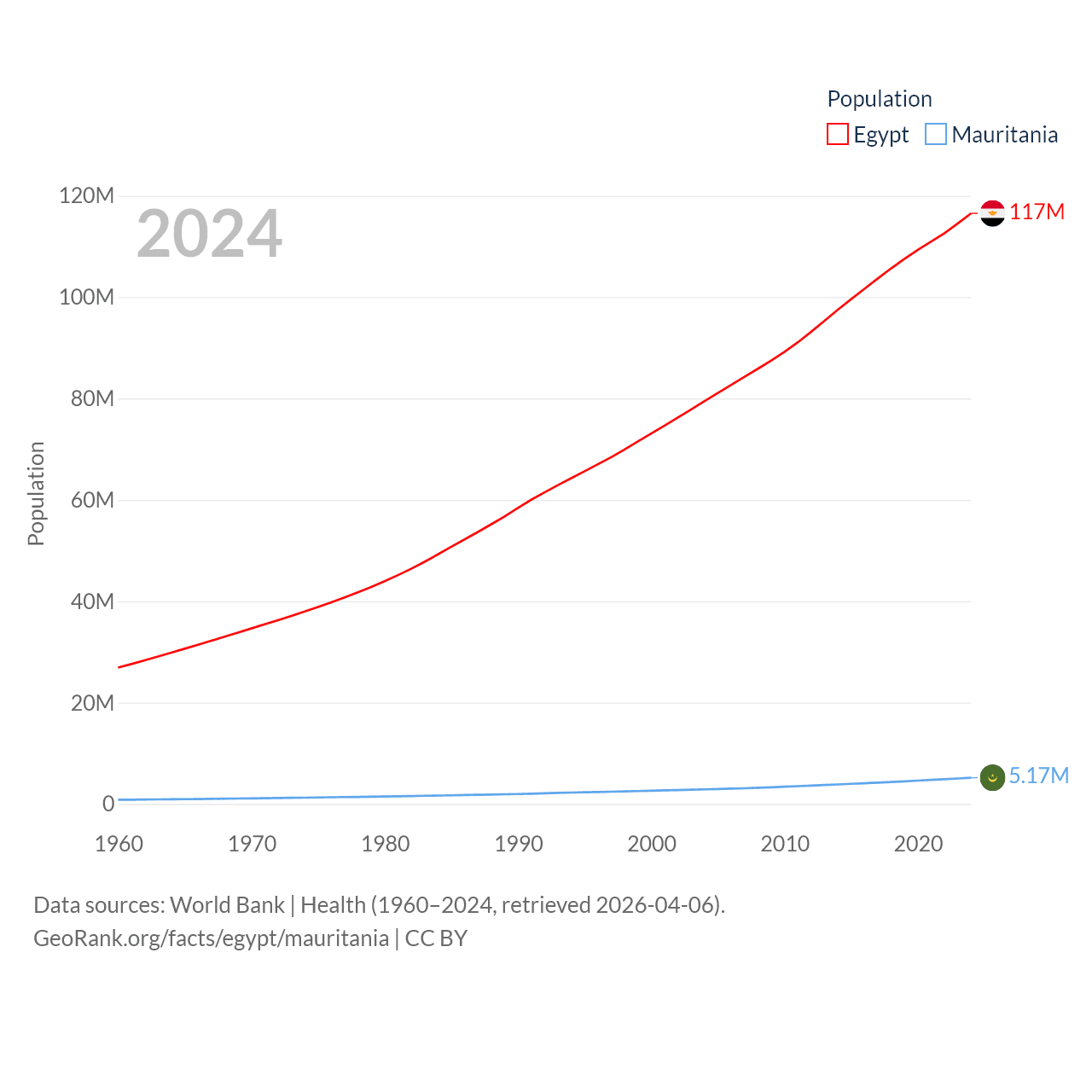Egypt has a population of 117M (ranked 13/197), compared with 5.17M in Mauritania (ranked 125/197). Egypt's land area is 384,345 sq mi versus 397,955 sq mi for Mauritania (ranked 29th vs. 28th).