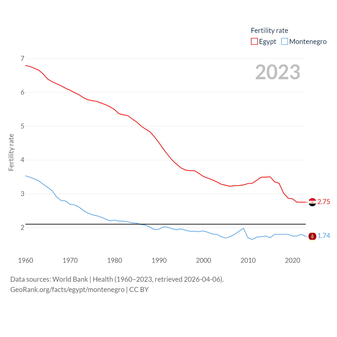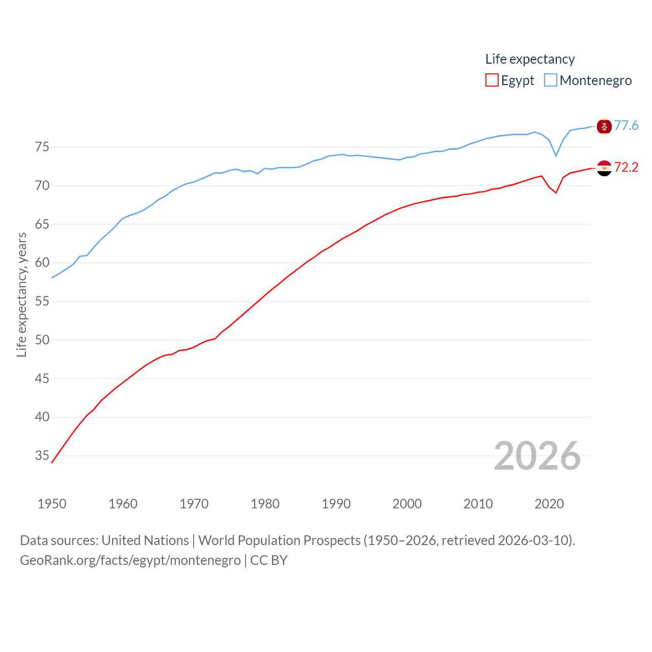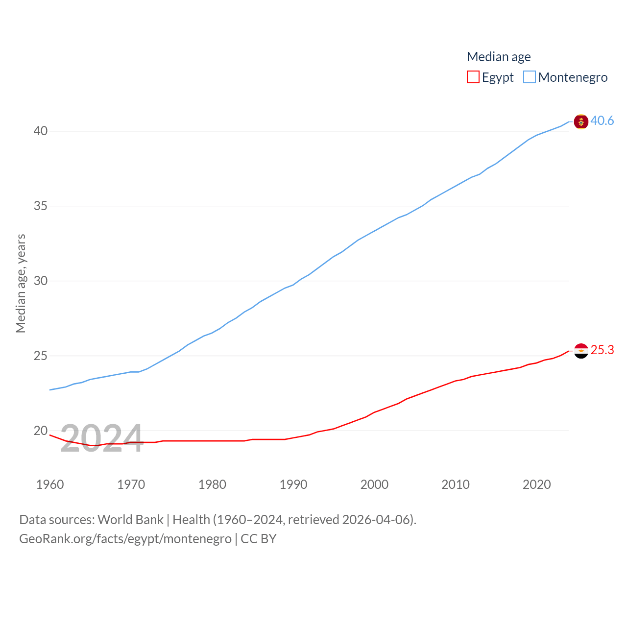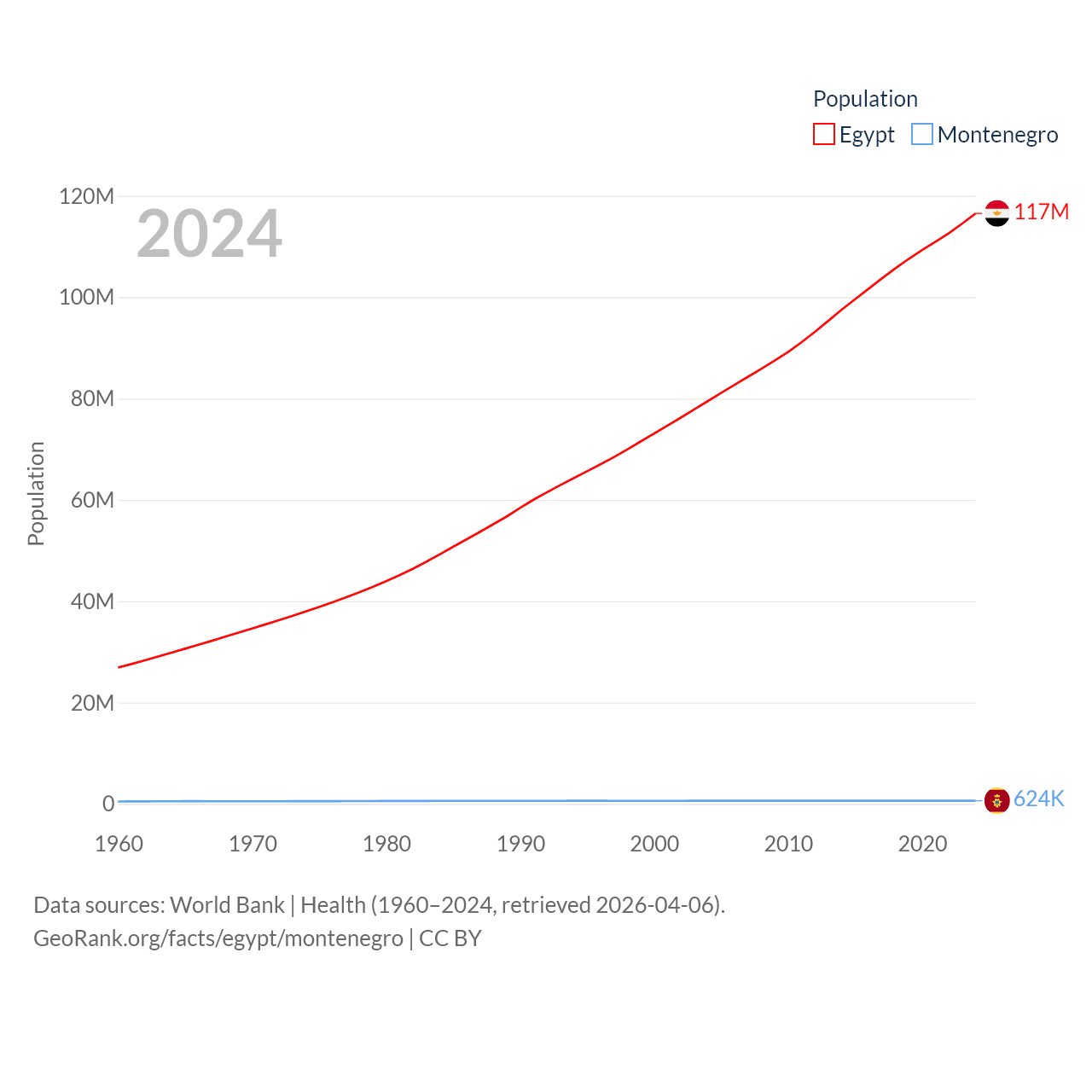 Egypt has a population of 117M (ranked 13/197), compared with 624K in Montenegro (ranked 166/197). Egypt's land area is 384,345 sq mi versus 5,193 sq mi for Montenegro (ranked 29th vs. 156th).