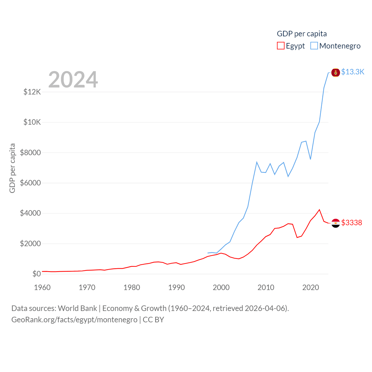 By GDP, Egypt ranks 41/197 ($389B) and Montenegro ranks 155/197 ($8.27B). By GDP per capita, Egypt ranks 138/197 ($3,338), while Montenegro ranks 77/197 ($13,263).
