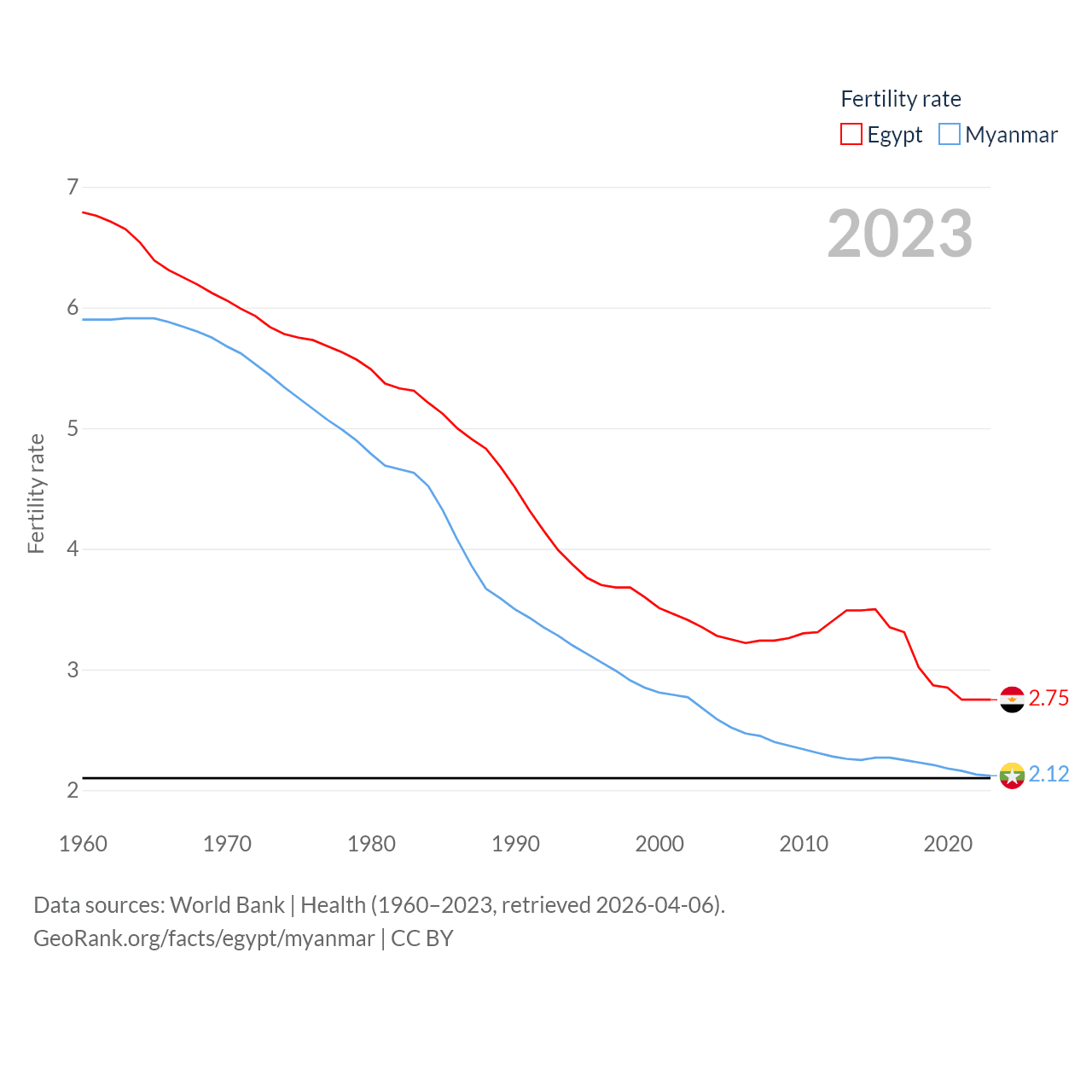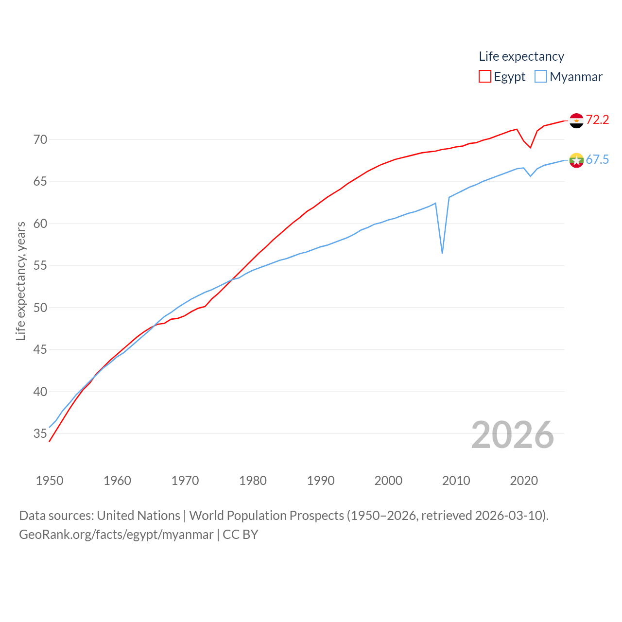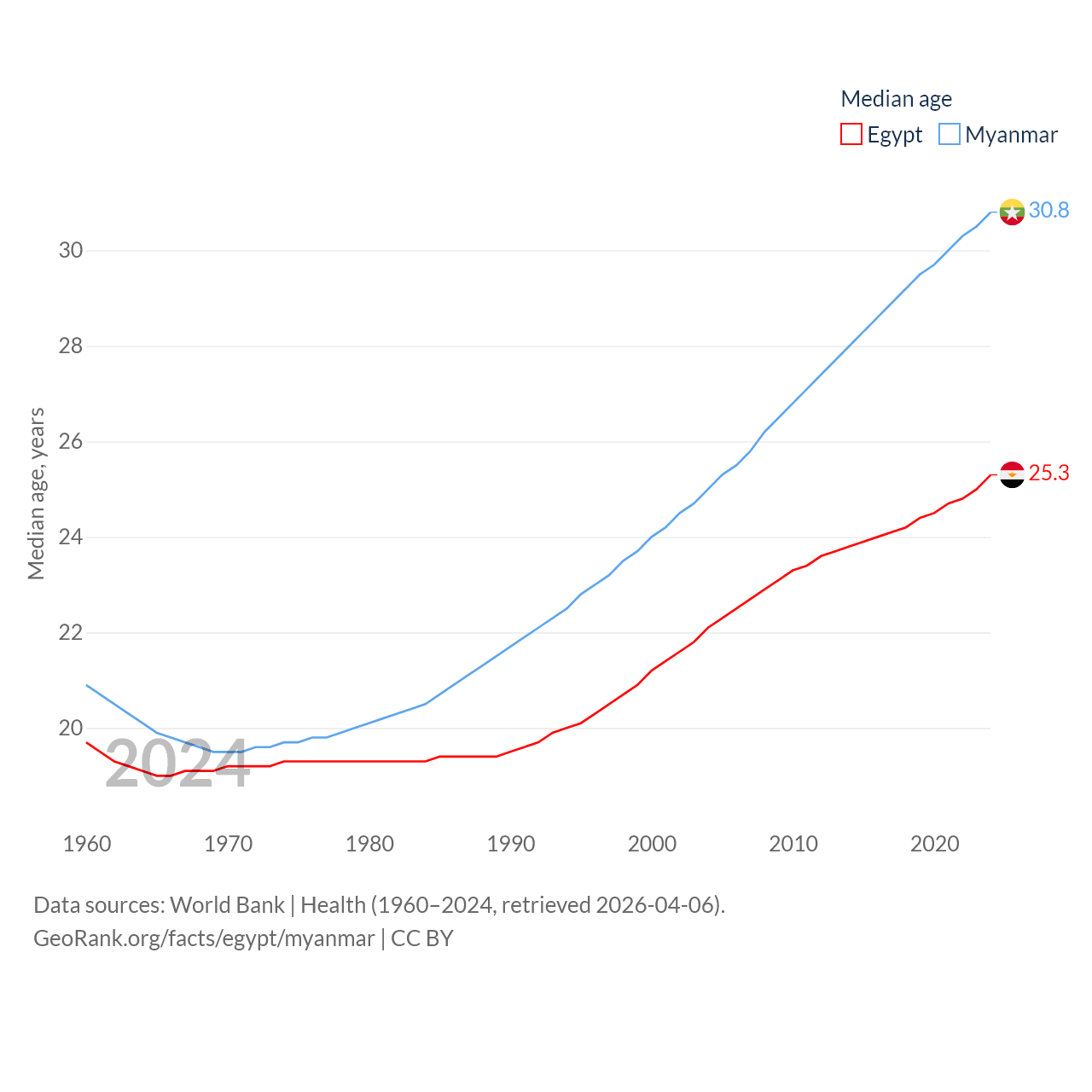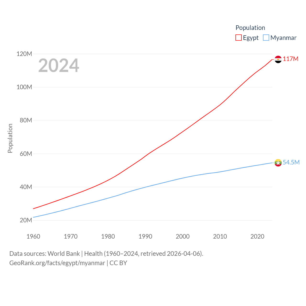 Egypt has a population of 117M (ranked 13/197), compared with 54.5M in Myanmar (ranked 27/197). Egypt's land area is 384,345 sq mi versus 251,997 sq mi for Myanmar (ranked 29th vs. 39th).