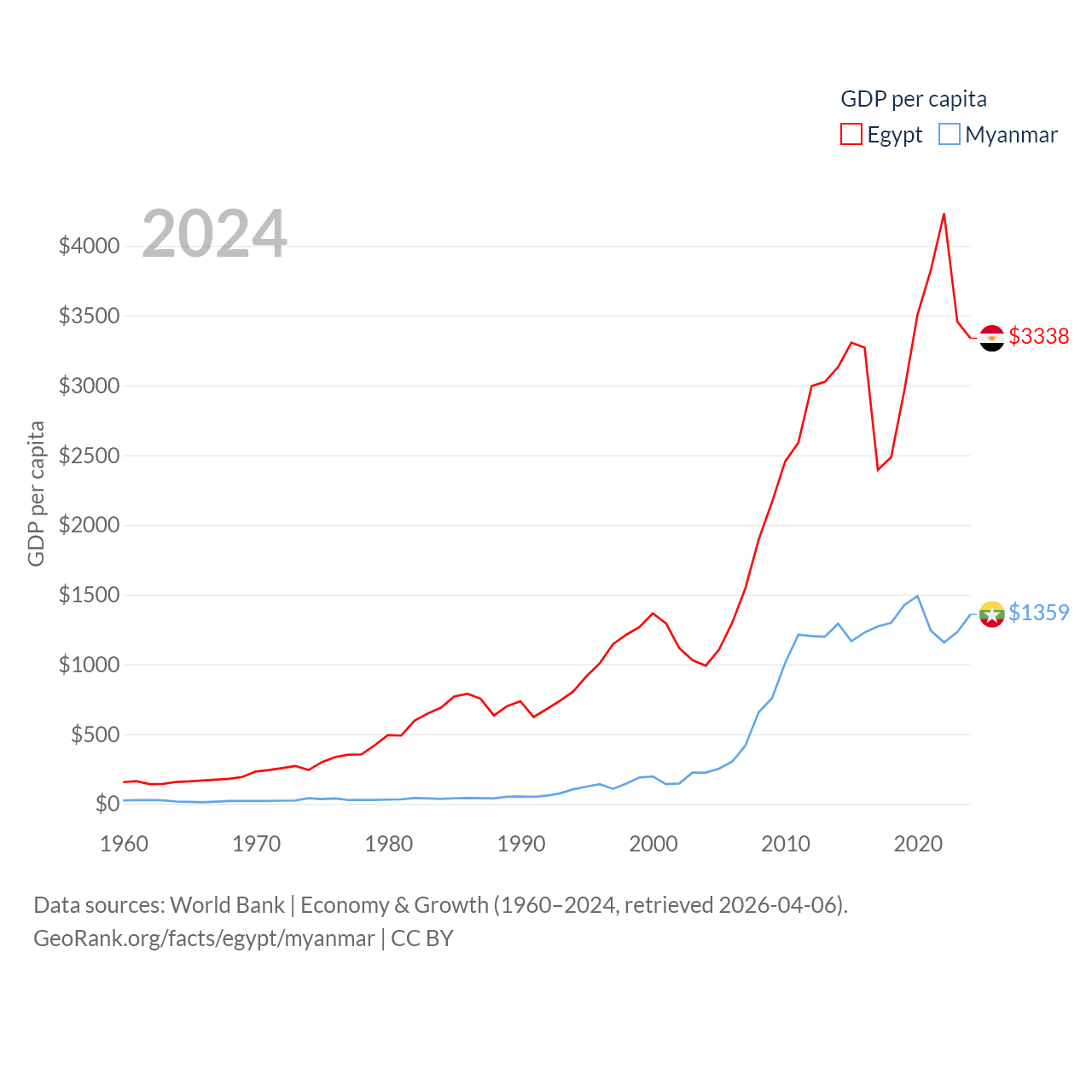 By GDP, Egypt ranks 41/197 ($389B) and Myanmar ranks 85/197 ($74.1B). By GDP per capita, Egypt ranks 138/197 ($3,338), while Myanmar ranks 165/197 ($1,359).