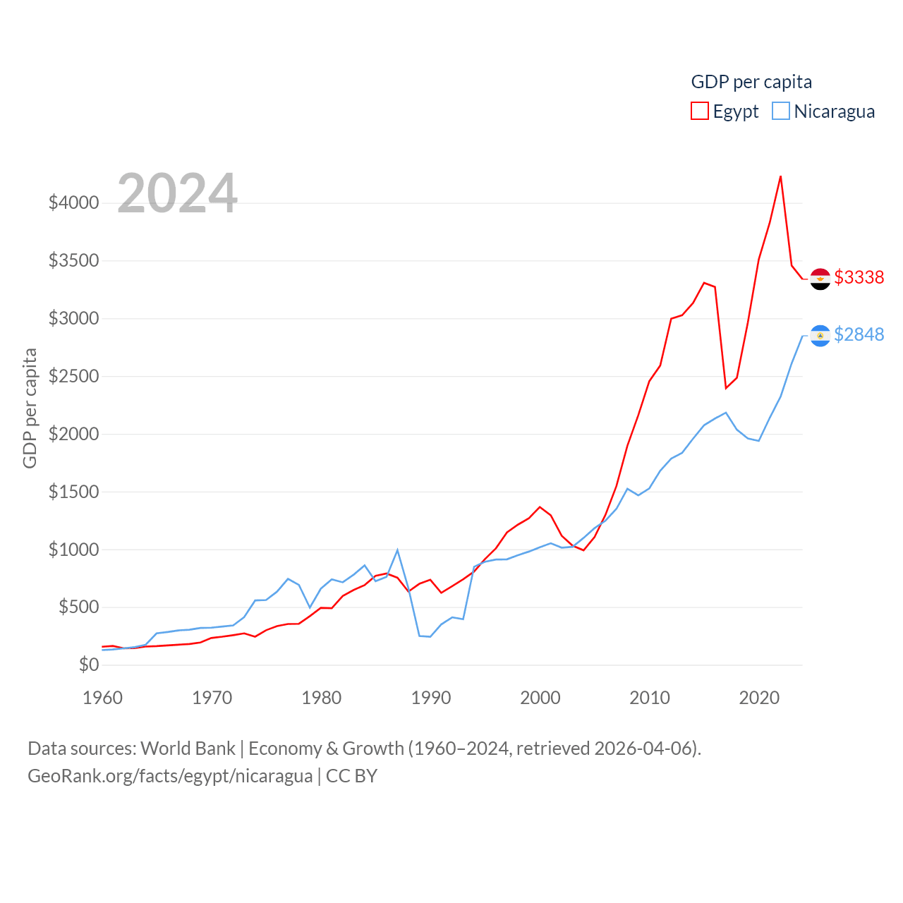 By GDP, Egypt ranks 41/197 ($389B) and Nicaragua ranks 131/197 ($19.7B). By GDP per capita, Egypt ranks 138/197 ($3,338), while Nicaragua ranks 141/197 ($2,848).
