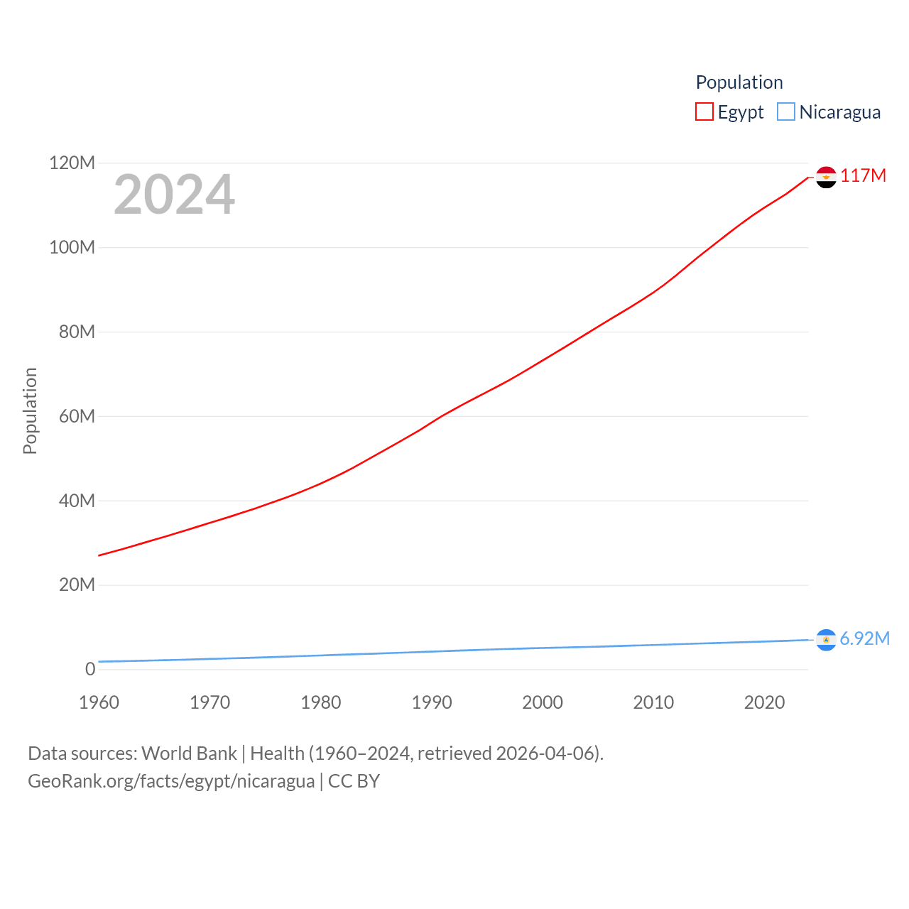Egypt has a population of 117M (ranked 13/197), compared with 6.92M in Nicaragua (ranked 108/197). Egypt's land area is 384,345 sq mi versus 46,464 sq mi for Nicaragua (ranked 29th vs. 98th).