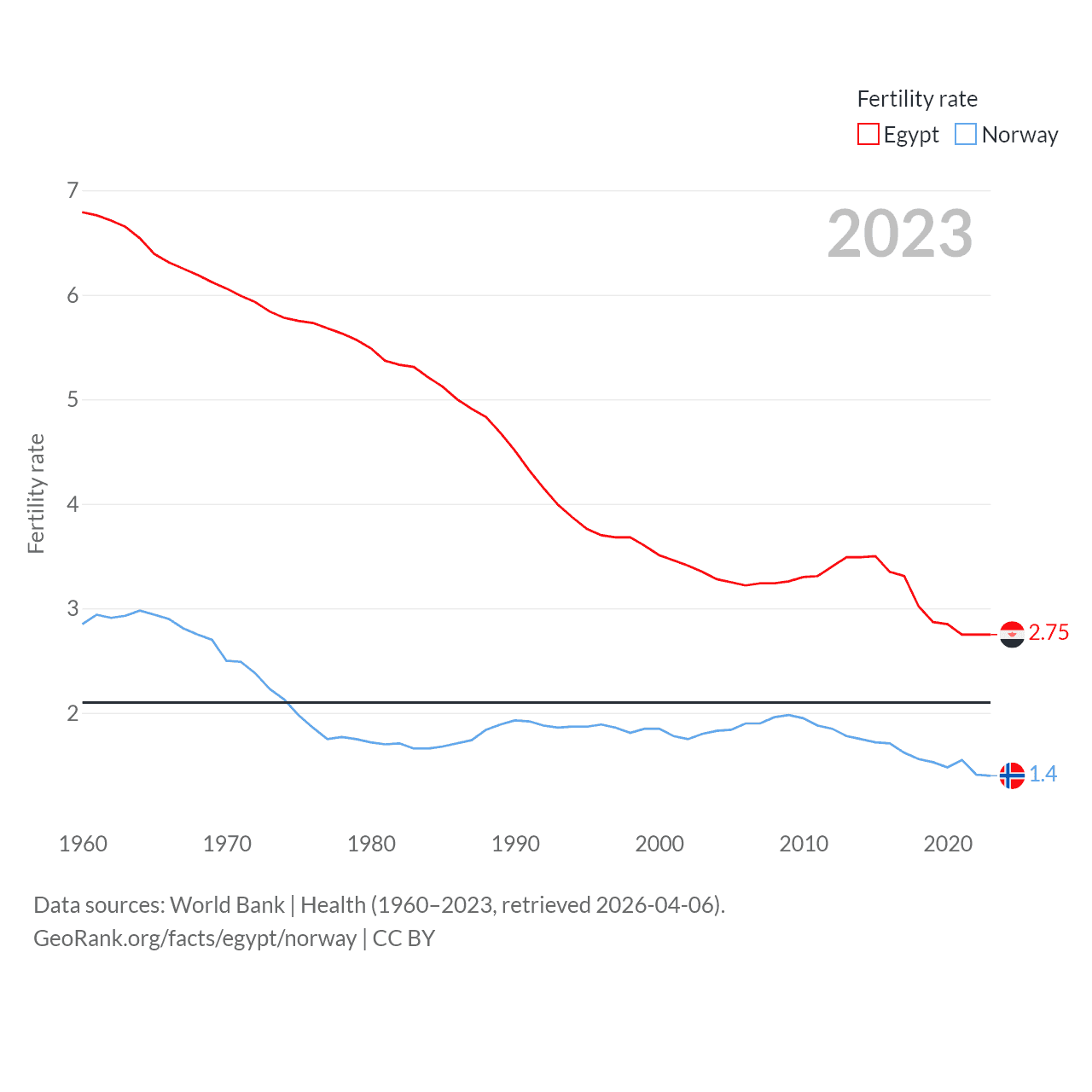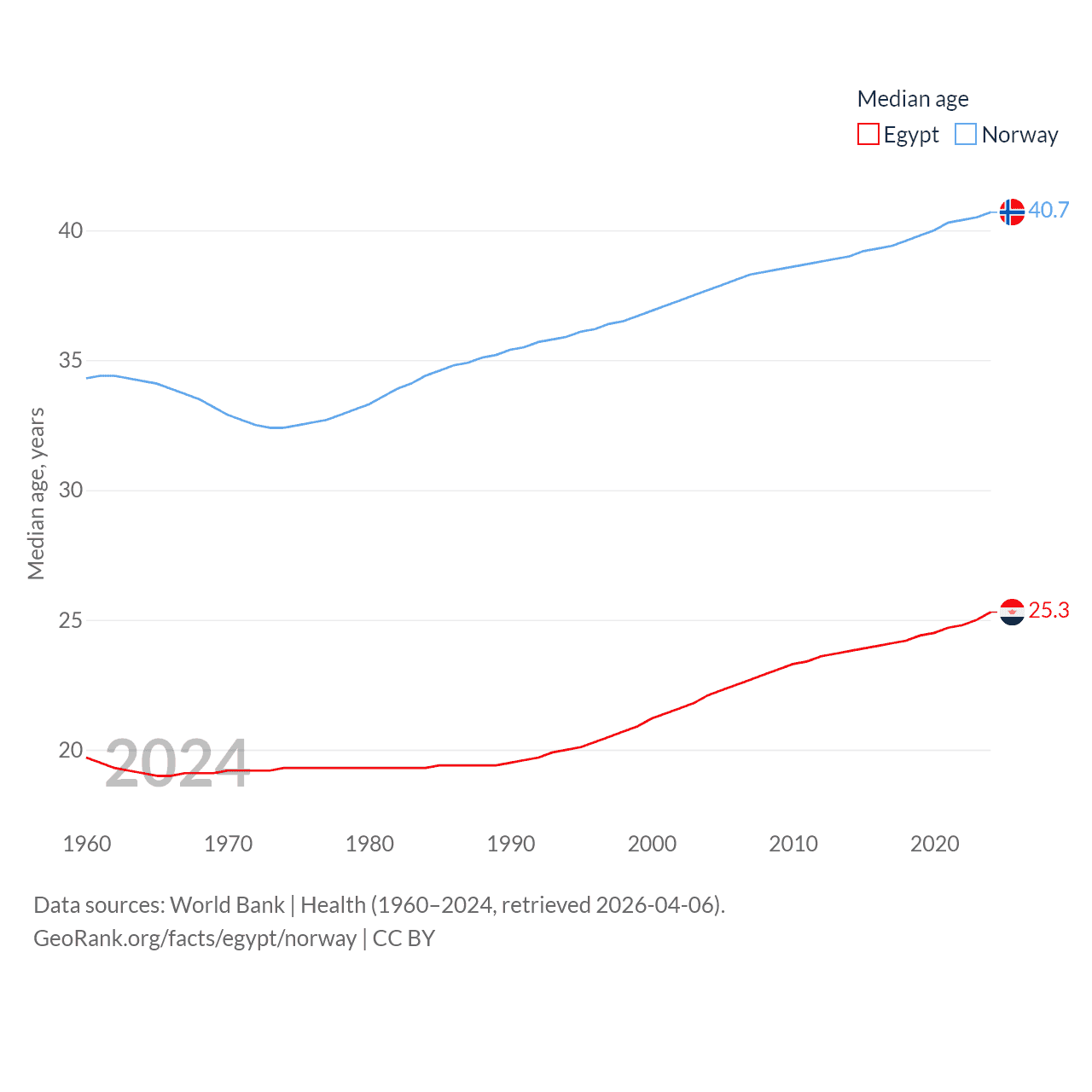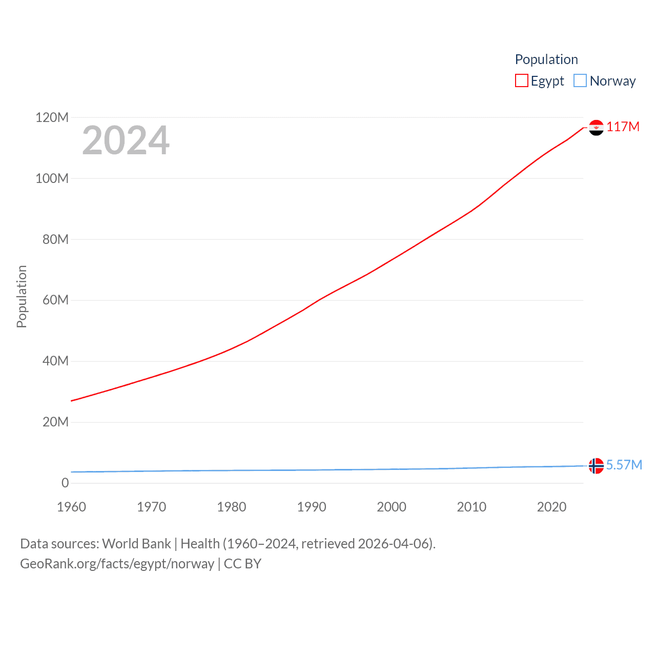 Egypt has a population of 117M (ranked 13/197), compared with 5.57M in Norway (ranked 118/197). Egypt's land area is 384,345 sq mi versus 140,645 sq mi for Norway (ranked 29th vs. 62nd).