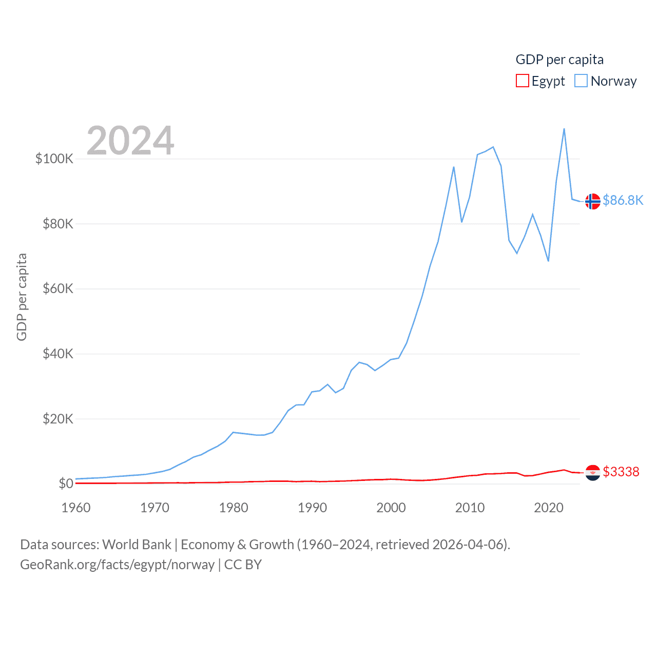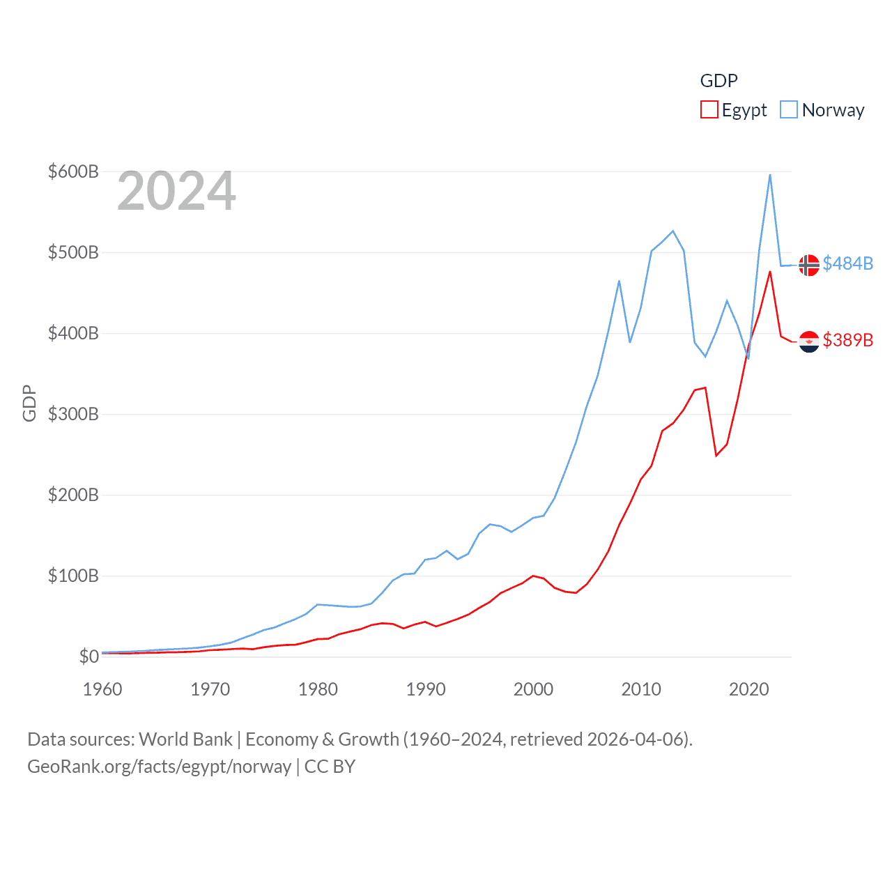 By GDP, Egypt ranks 41/197 ($389B) and Norway ranks 32/197 ($484B). By GDP per capita, Egypt ranks 138/197 ($3,338), while Norway ranks 8/197 ($86,785).