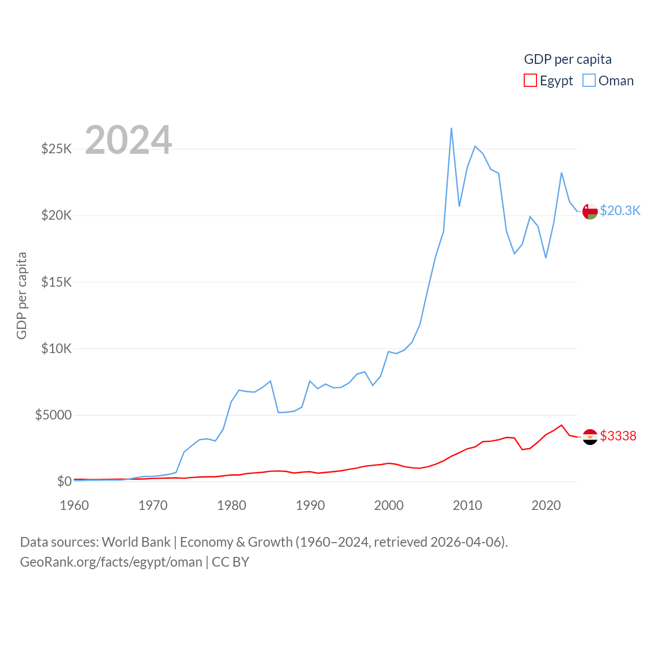 By GDP, Egypt ranks 41/197 ($389B) and Oman ranks 70/197 ($107B). By GDP per capita, Egypt ranks 138/197 ($3,338), while Oman ranks 57/197 ($20,285).