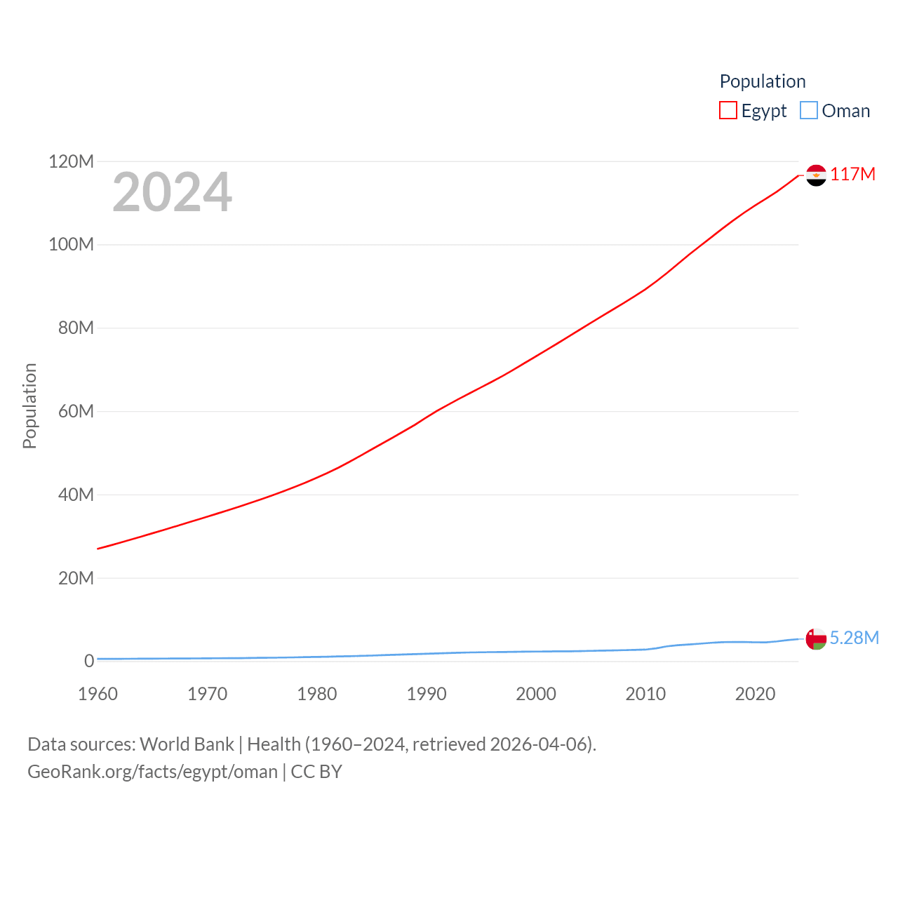 Egypt has a population of 117M (ranked 13/197), compared with 5.28M in Oman (ranked 124/197). Egypt's land area is 384,345 sq mi versus 119,499 sq mi for Oman (ranked 29th vs. 68th).