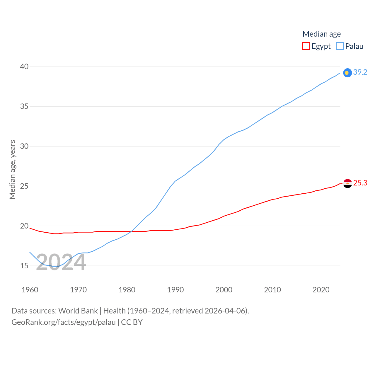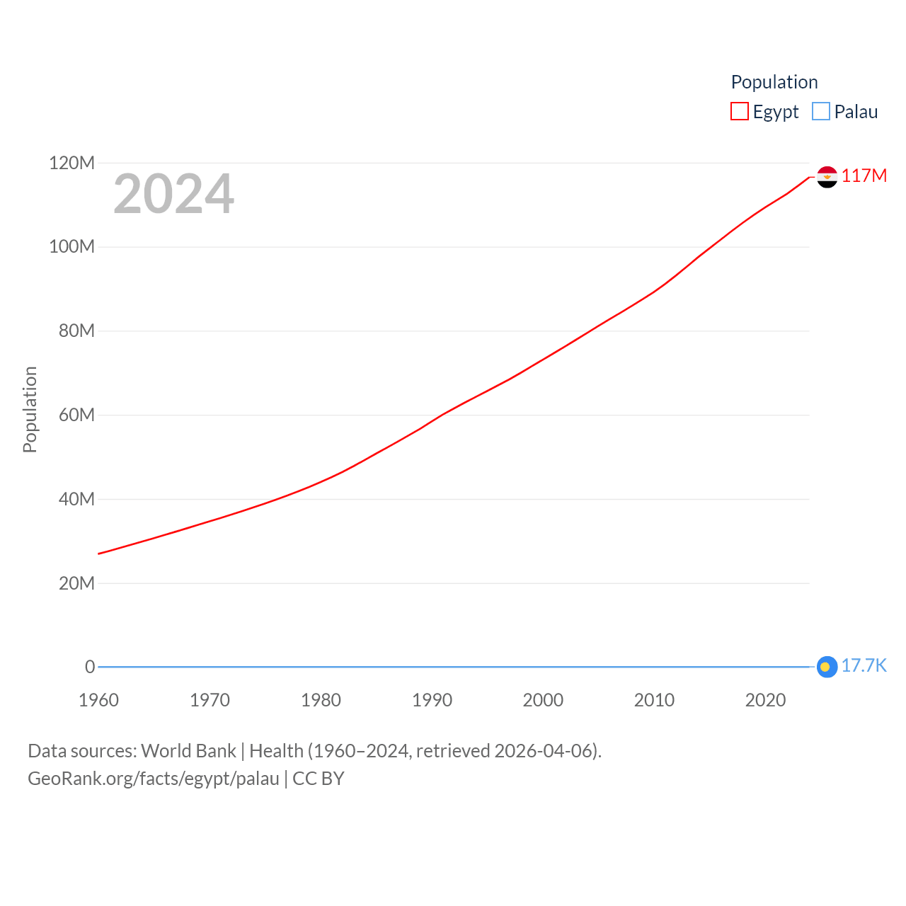 Egypt has a population of 117M (ranked 13/197), compared with 17.7K in Palau (ranked 194/197). Egypt's land area is 384,345 sq mi versus 177.6 sq mi for Palau (ranked 29th vs. 180th).
