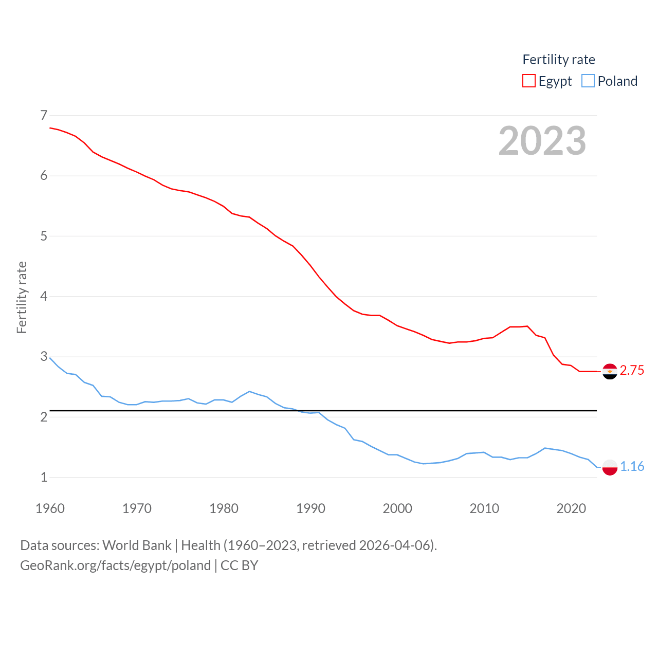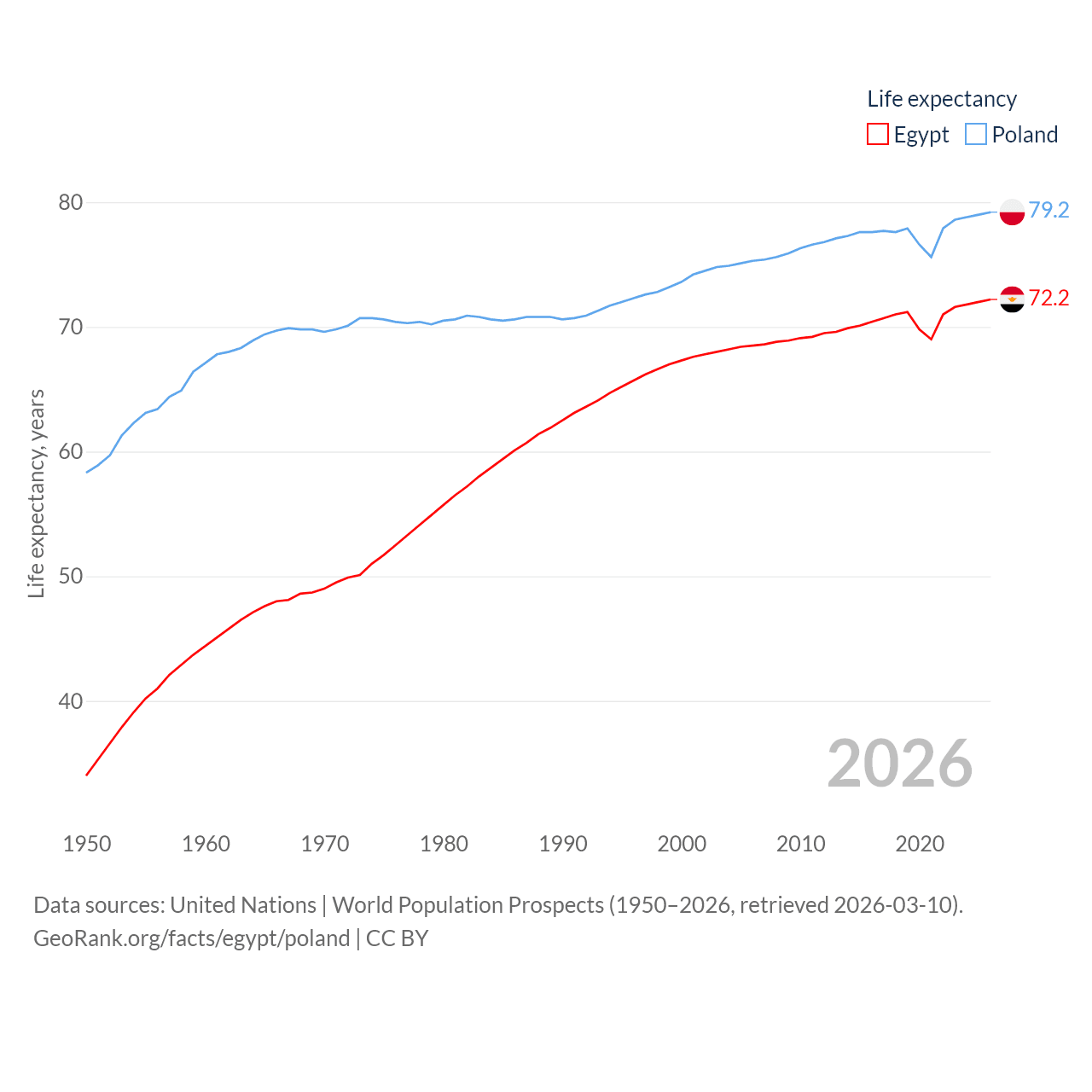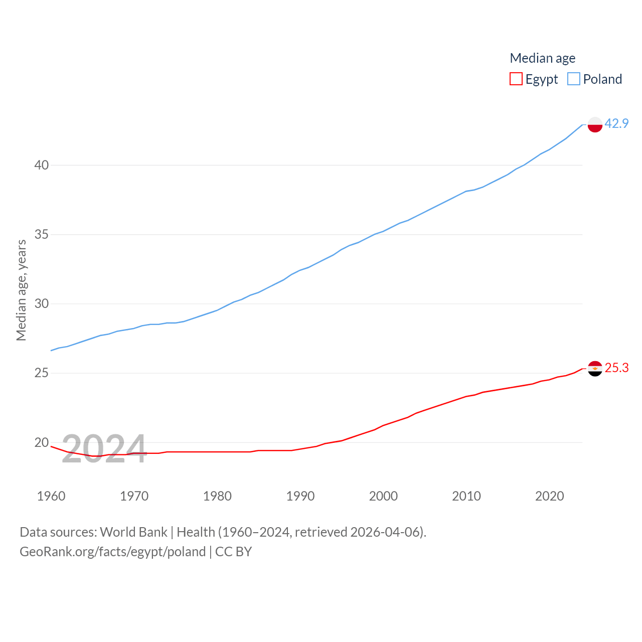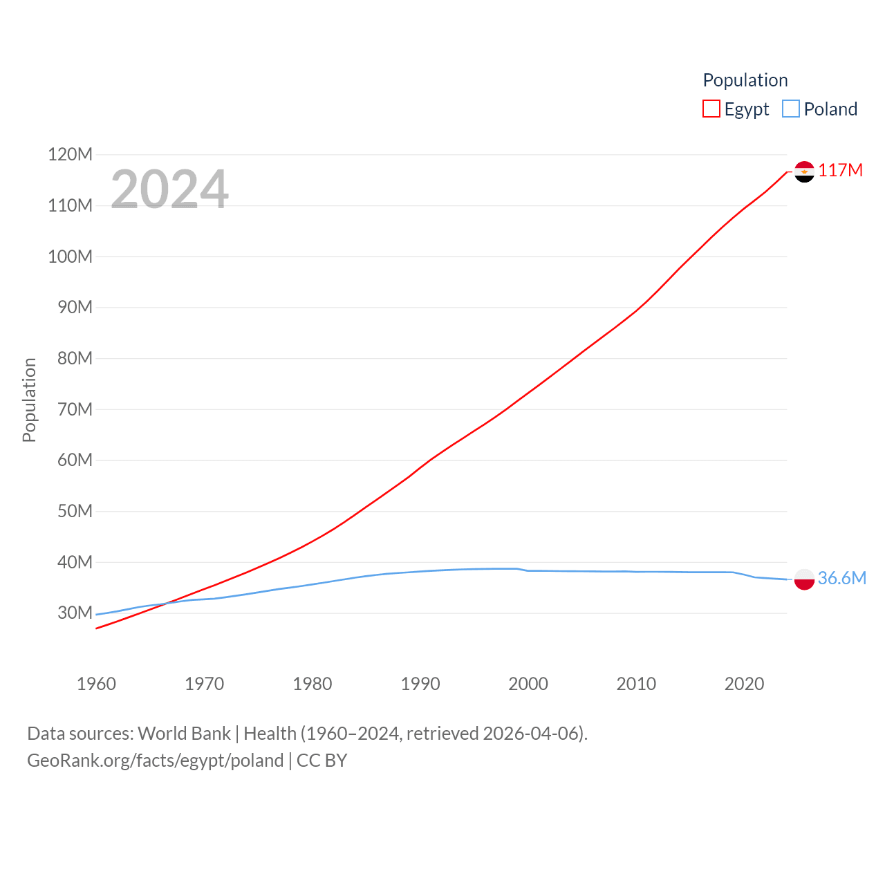 Egypt has a population of 117M (ranked 13/197), compared with 36.6M in Poland (ranked 42/197). Egypt's land area is 384,345 sq mi versus 118,252 sq mi for Poland (ranked 29th vs. 69th).