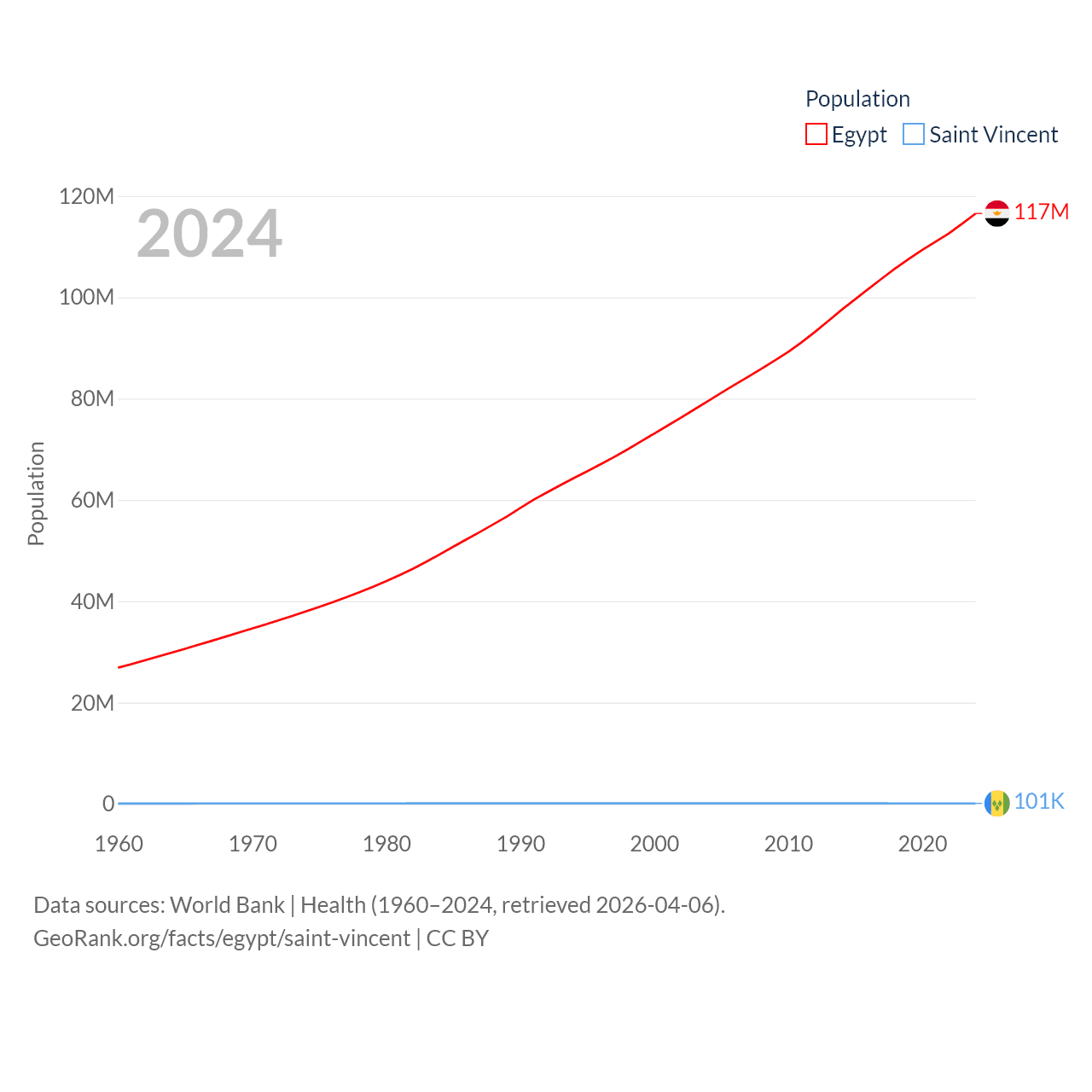 Egypt has a population of 117M (ranked 13/197), compared with 101K in Saint Vincent (ranked 184/197). Egypt's land area is 384,345 sq mi versus 150.6 sq mi for Saint Vincent (ranked 29th vs. 185th).