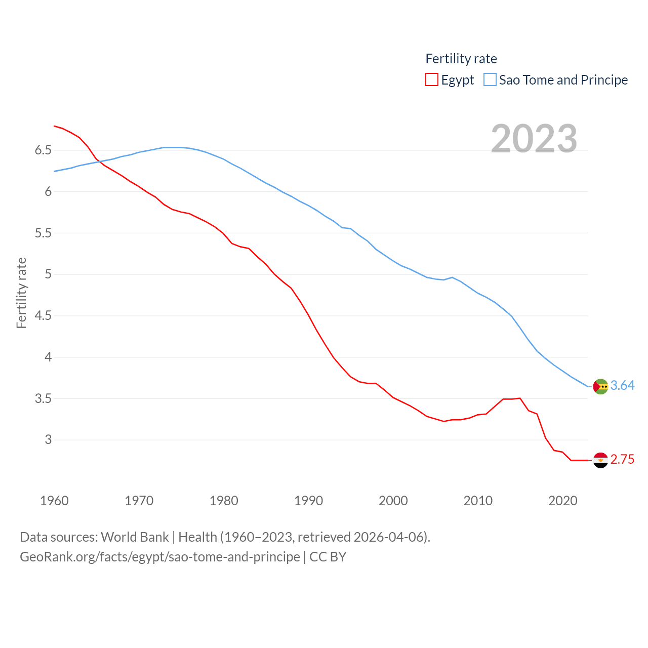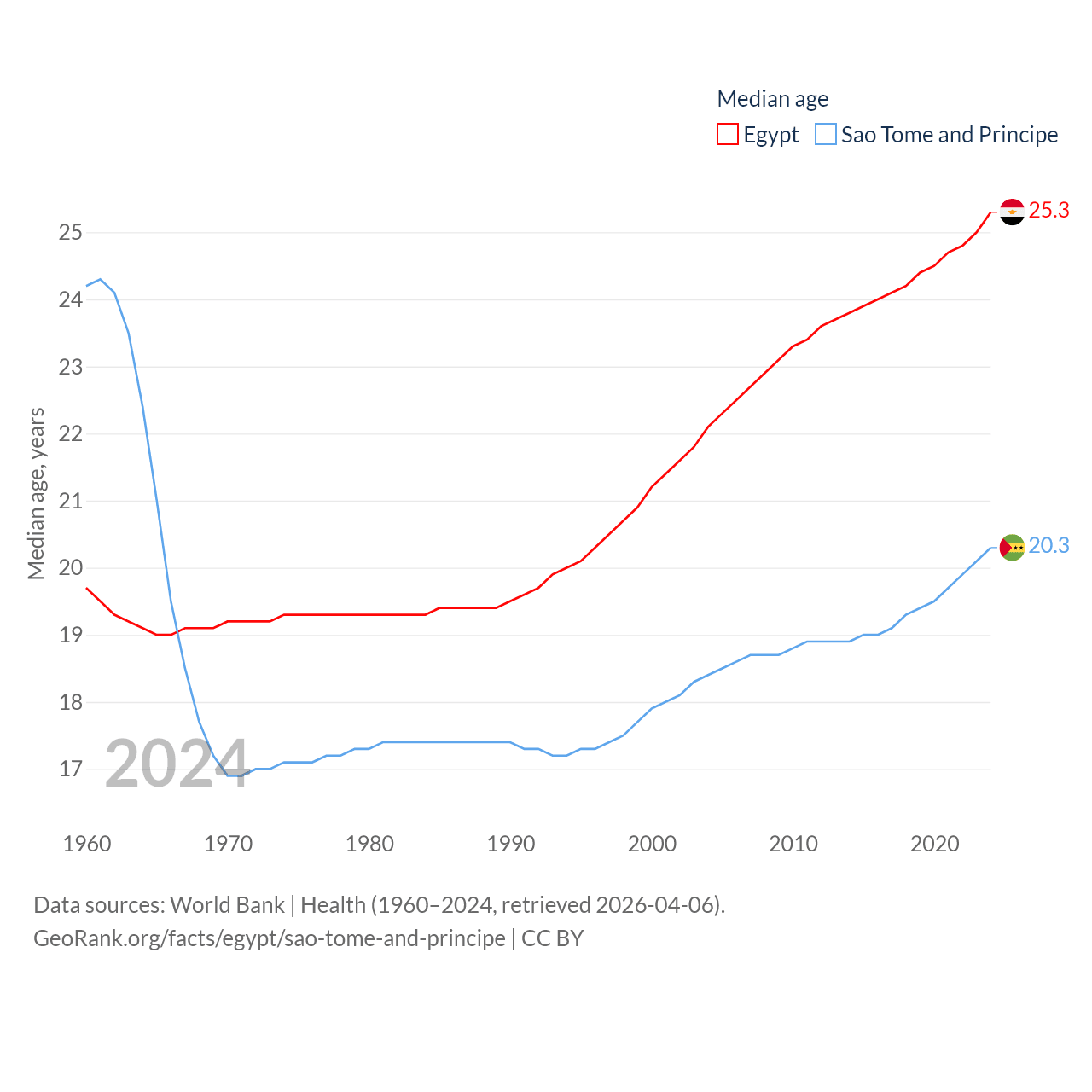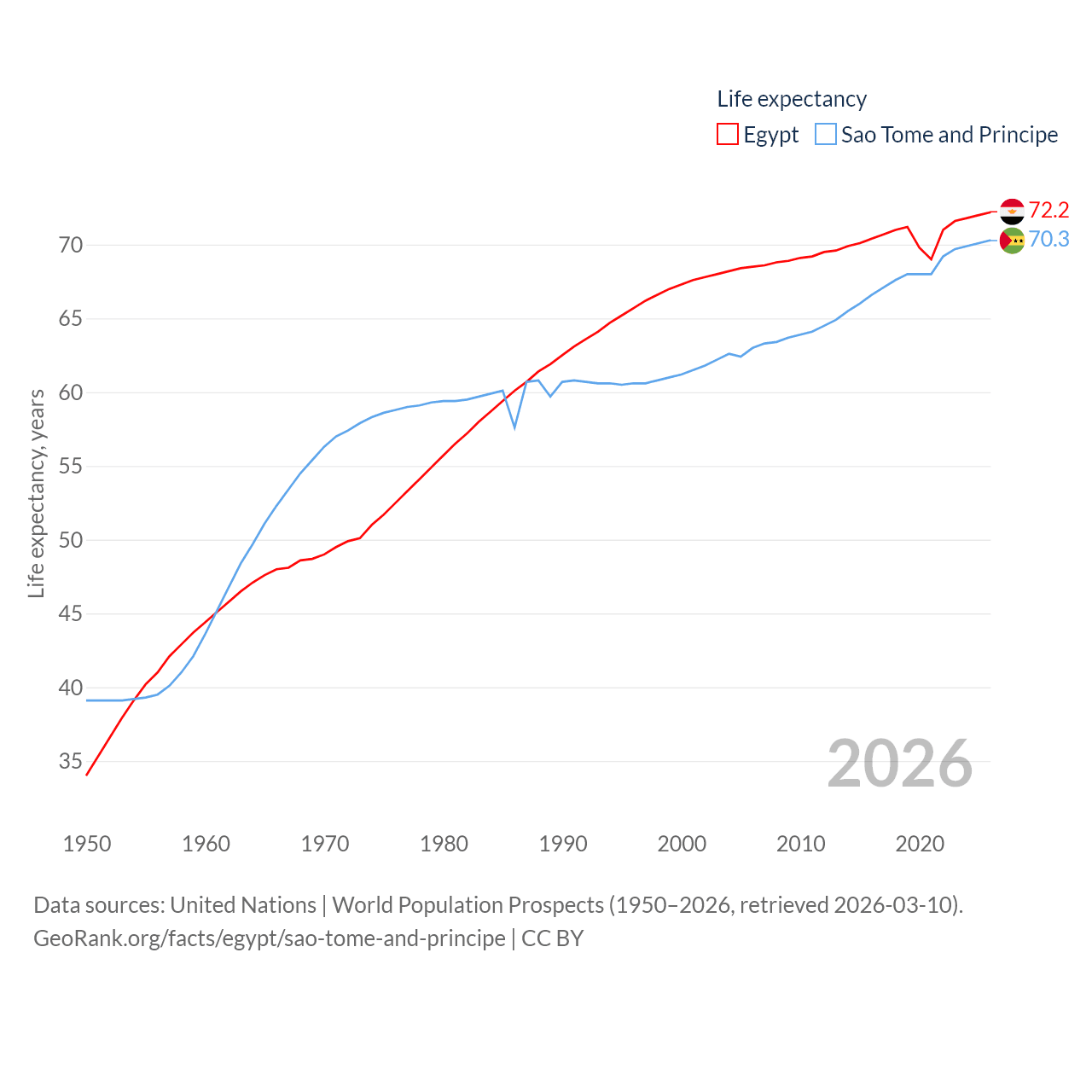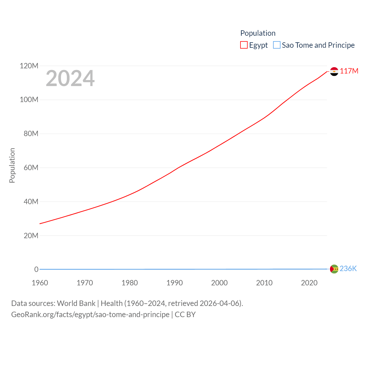 Egypt has a population of 117M (ranked 13/197), compared with 236K in Sao Tome and Principe (ranked 176/197). Egypt's land area is 384,345 sq mi versus 371 sq mi for Sao Tome and Principe (ranked 29th vs. 172nd).
