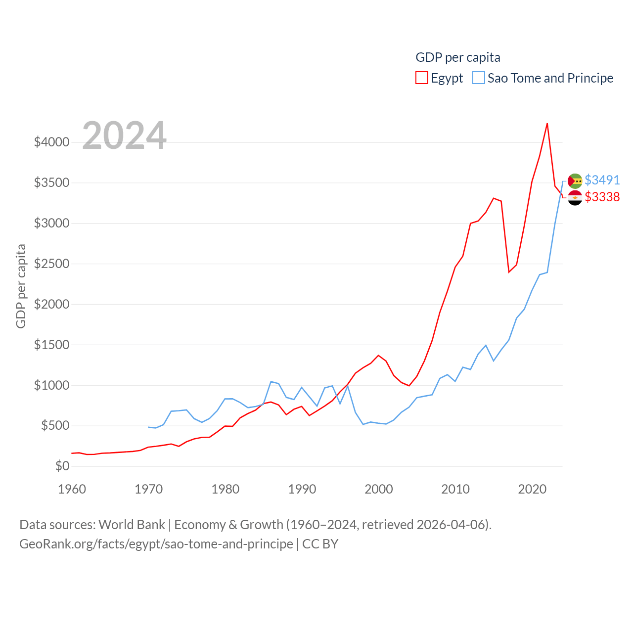 By GDP, Egypt ranks 41/197 ($389B) and Sao Tome and Principe ranks 189/197 ($822M). By GDP per capita, Egypt ranks 138/197 ($3,338), while Sao Tome and Principe ranks 134/197 ($3,491).