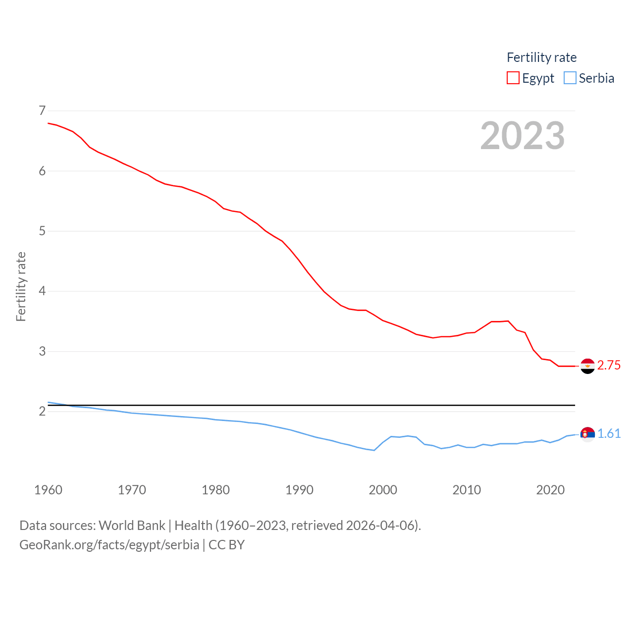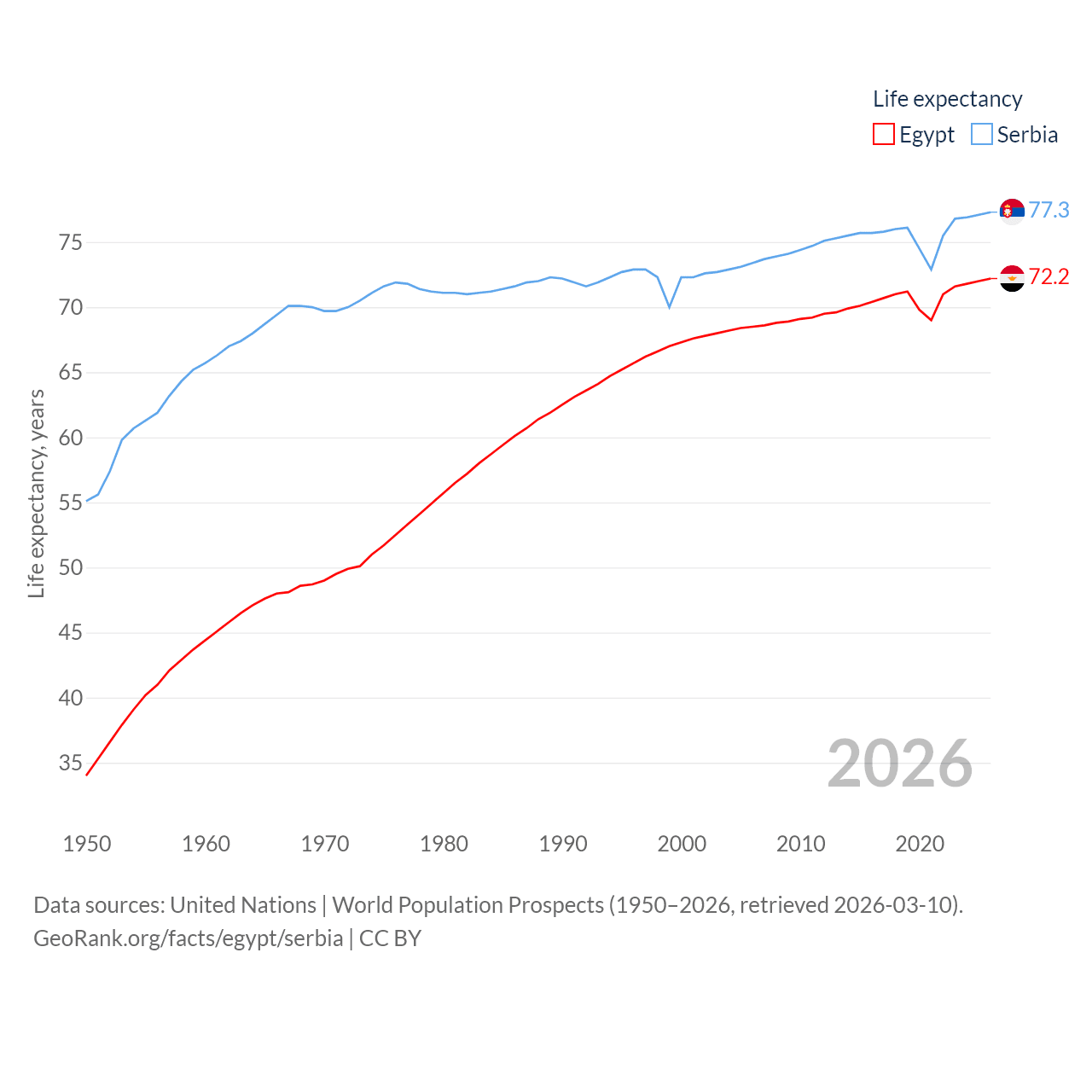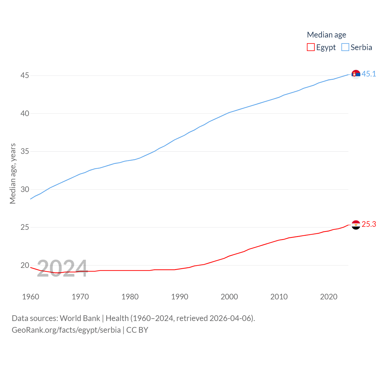 Egypt has a population of 117M (ranked 13/197), compared with 6.59M in Serbia (ranked 109/197). Egypt's land area is 384,345 sq mi versus 32,467 sq mi for Serbia (ranked 29th vs. 111th).
