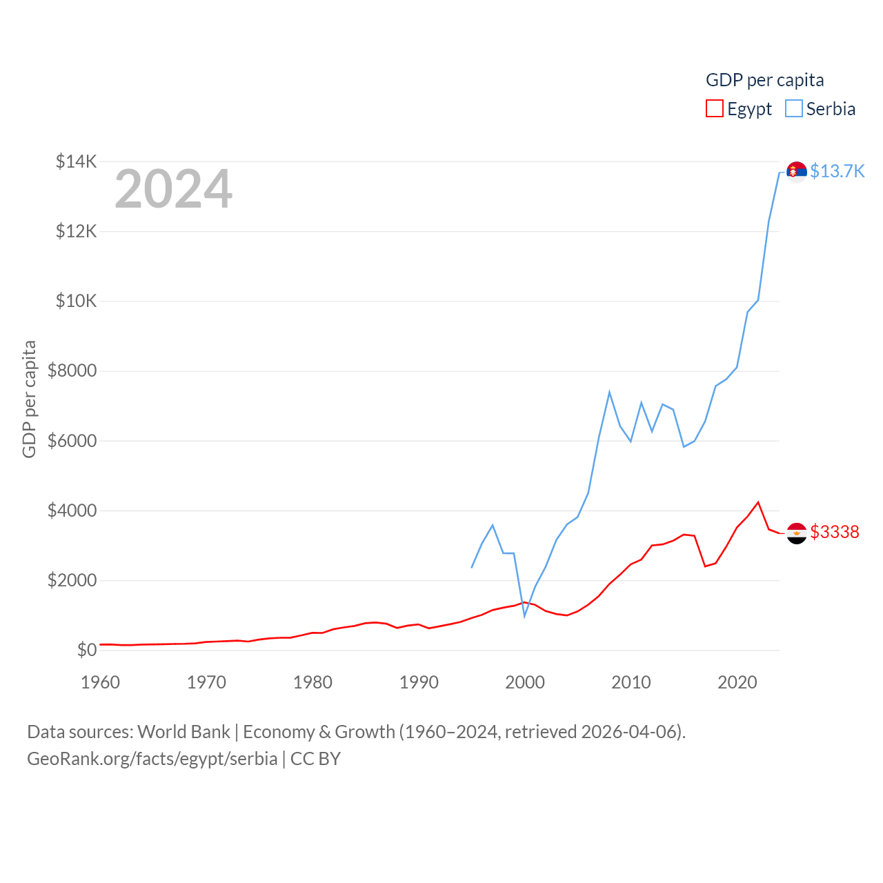 By GDP, Egypt ranks 41/197 ($389B) and Serbia ranks 76/197 ($90.1B). By GDP per capita, Egypt ranks 138/197 ($3,338), while Serbia ranks 73/197 ($13,679).