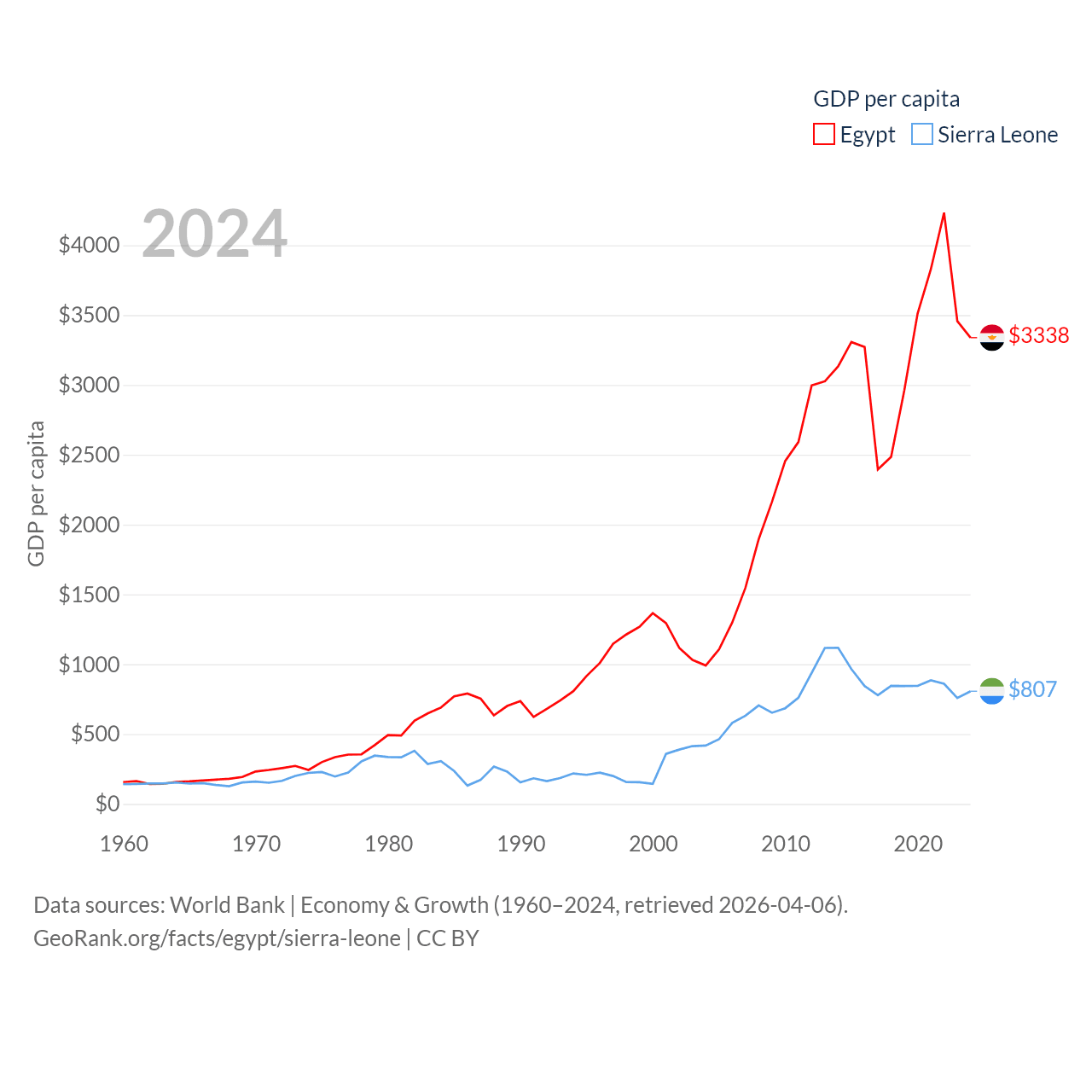 By GDP, Egypt ranks 41/197 ($389B) and Sierra Leone ranks 160/197 ($6.97B). By GDP per capita, Egypt ranks 138/197 ($3,338), while Sierra Leone ranks 186/197 ($807).