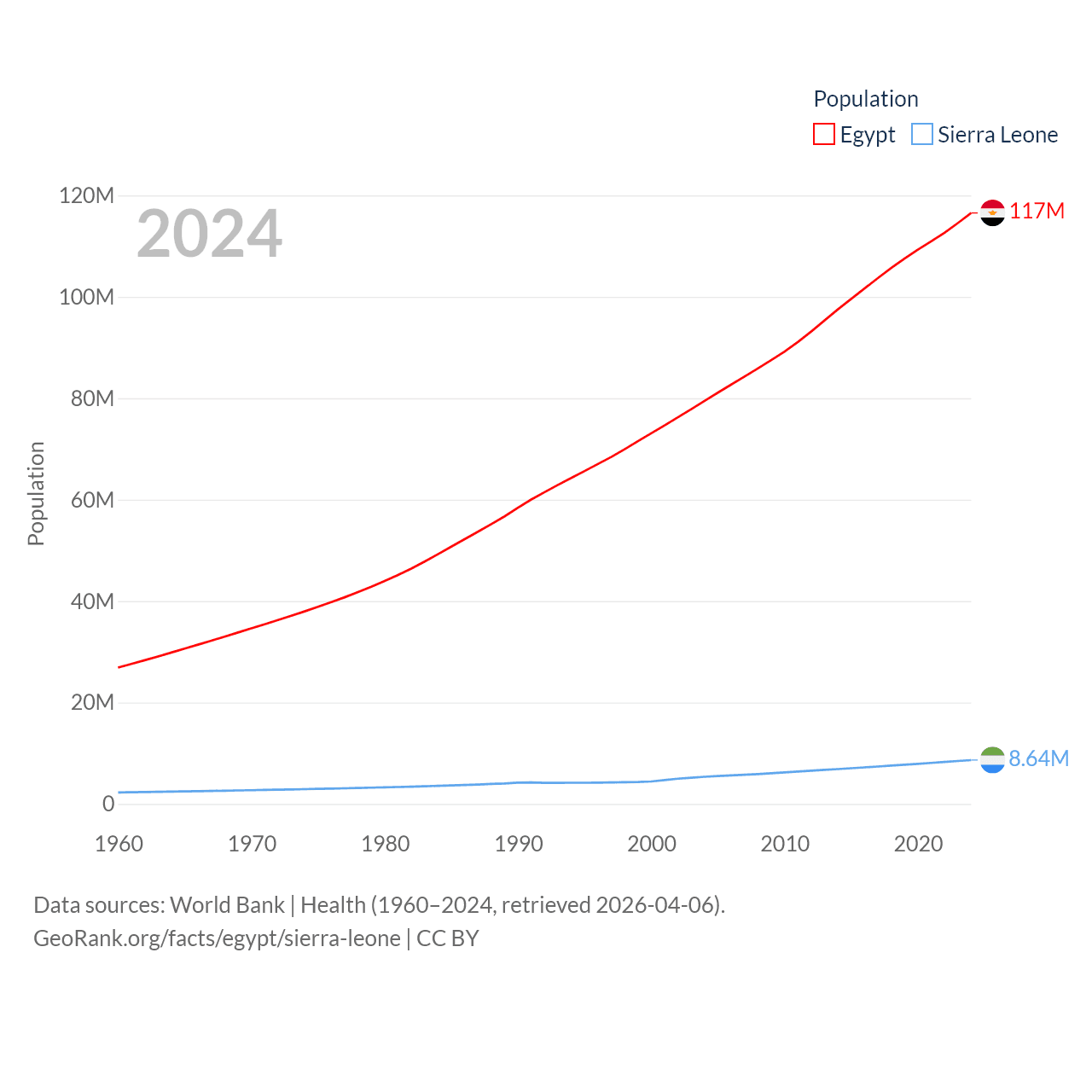Egypt has a population of 117M (ranked 13/197), compared with 8.64M in Sierra Leone (ranked 102/197). Egypt's land area is 384,345 sq mi versus 27,869 sq mi for Sierra Leone (ranked 29th vs. 116th).