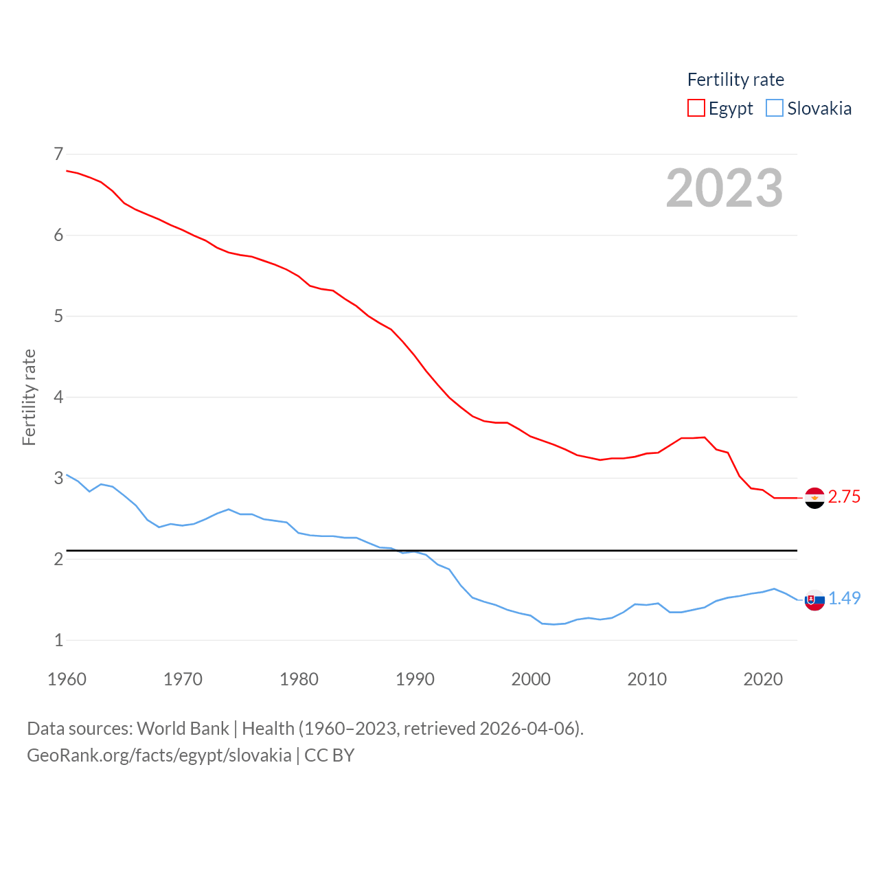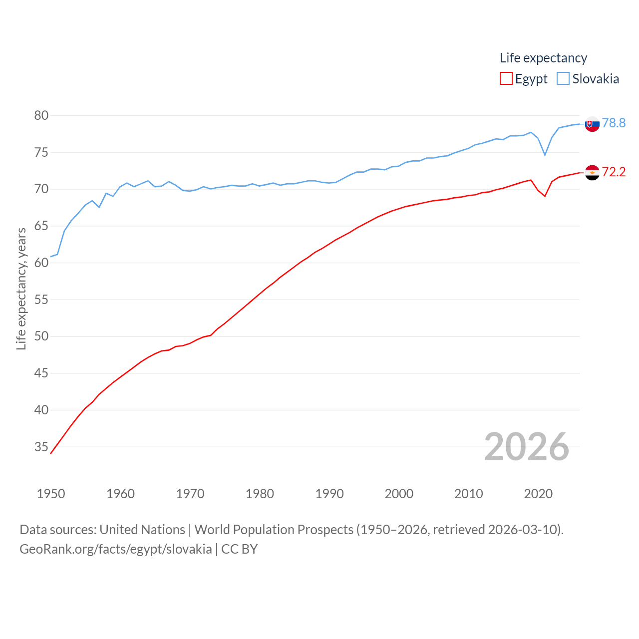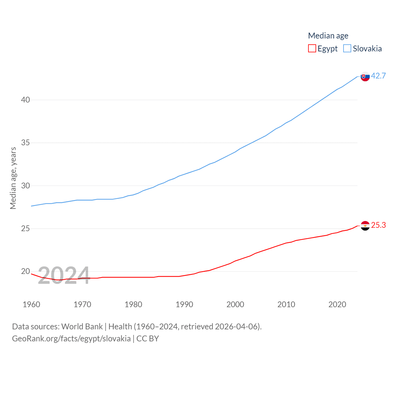 Egypt has a population of 117M (ranked 13/197), compared with 5.42M in Slovakia (ranked 119/197). Egypt's land area is 384,345 sq mi versus 18,564 sq mi for Slovakia (ranked 29th vs. 128th).