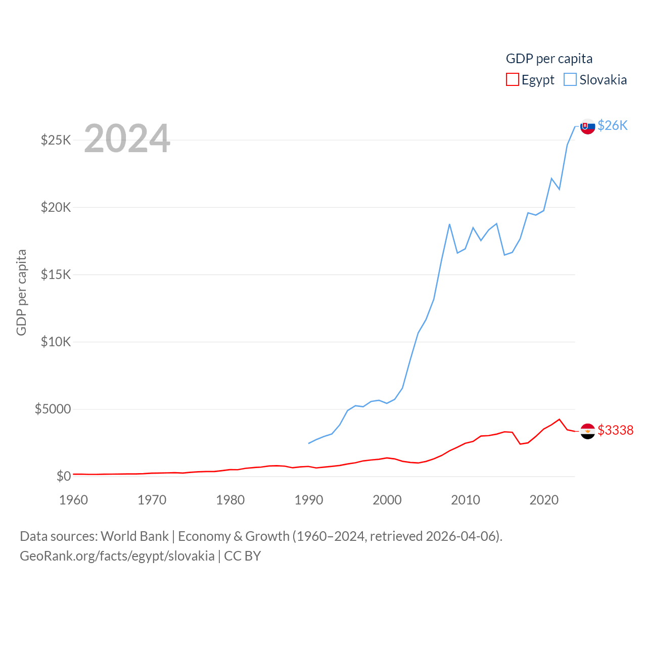 By GDP, Egypt ranks 41/197 ($389B) and Slovakia ranks 61/197 ($141B). By GDP per capita, Egypt ranks 138/197 ($3,338), while Slovakia ranks 47/197 ($25,993).