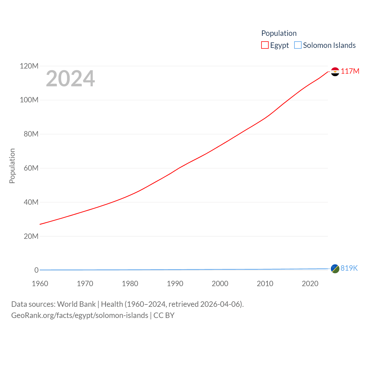 Egypt has a population of 117M (ranked 13/197), compared with 819K in The Solomon Islands (ranked 162/197). Egypt's land area is 384,345 sq mi versus 10,807 sq mi for The Solomon Islands (ranked 29th vs. 141st).