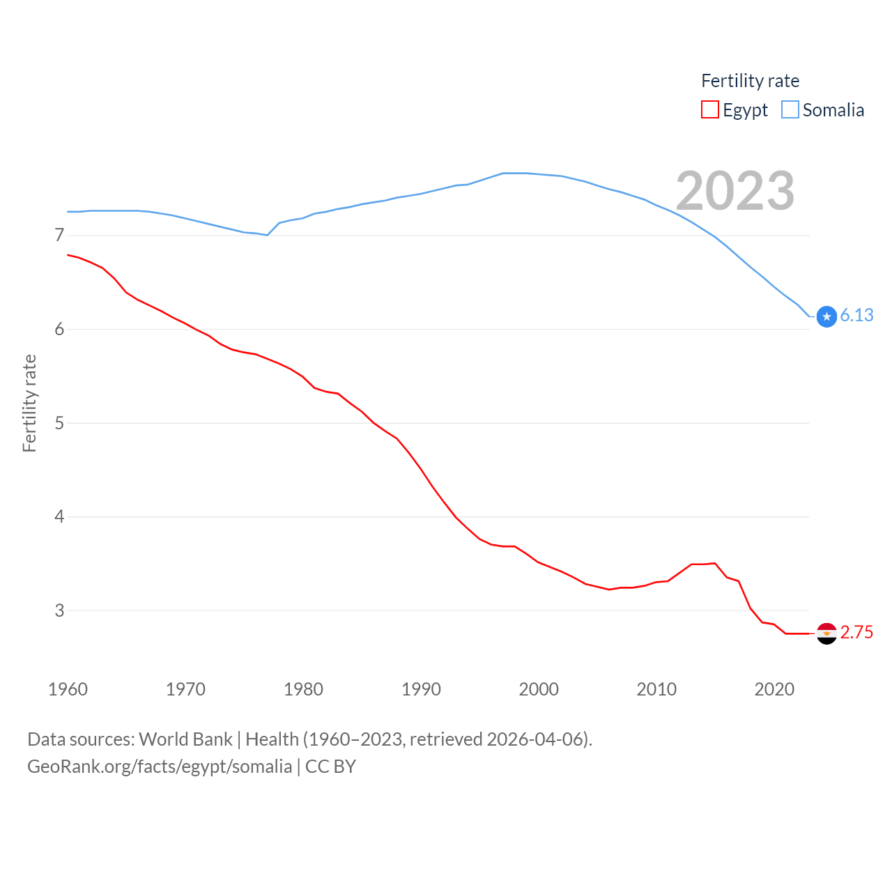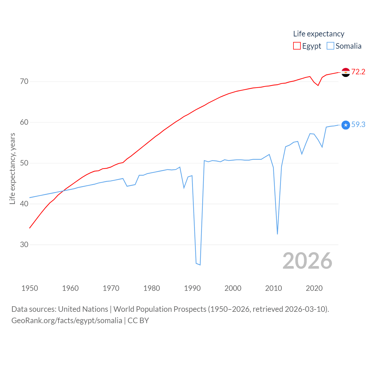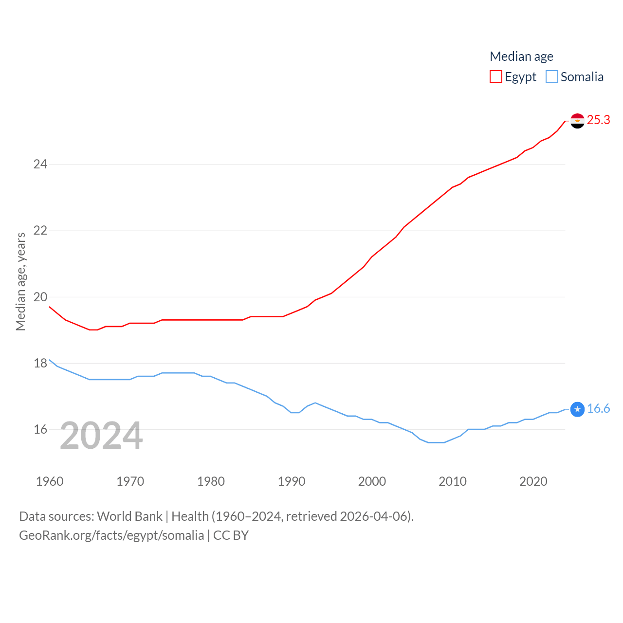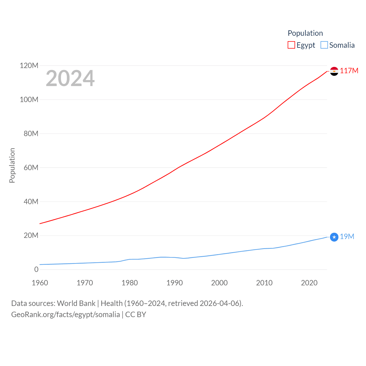 Egypt has a population of 117M (ranked 13/197), compared with 19M in Somalia (ranked 68/197). Egypt's land area is 384,345 sq mi versus 242,217 sq mi for Somalia (ranked 29th vs. 42nd).