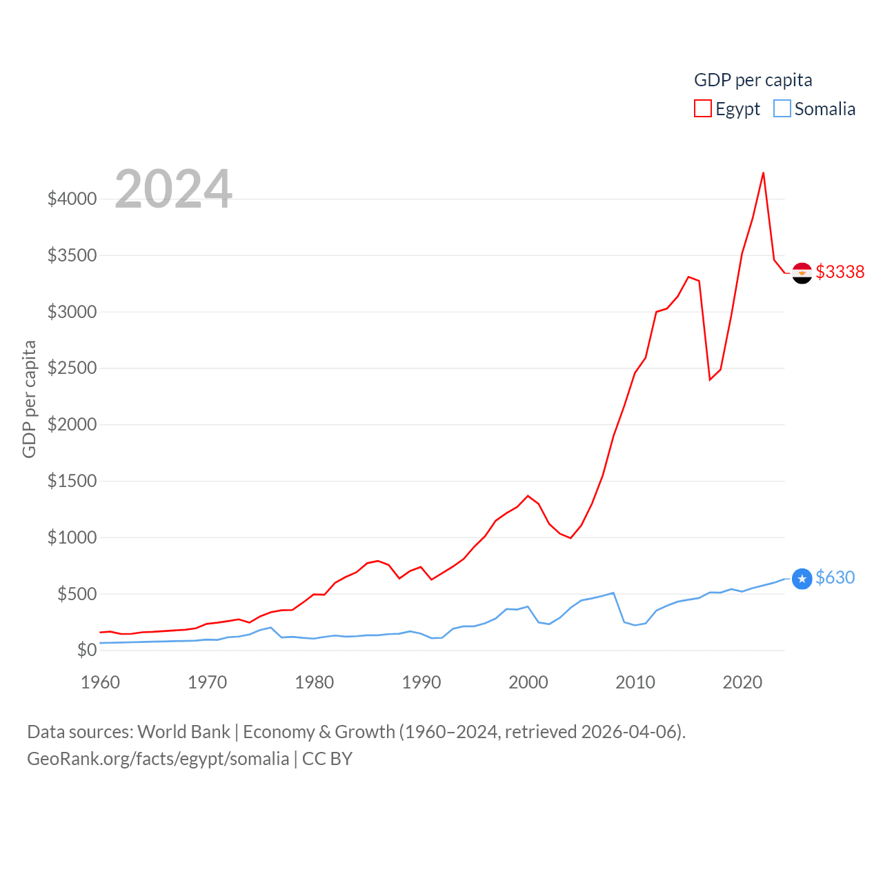 By GDP, Egypt ranks 41/197 ($389B) and Somalia ranks 150/197 ($12B). By GDP per capita, Egypt ranks 138/197 ($3,338), while Somalia ranks 192/197 ($630).