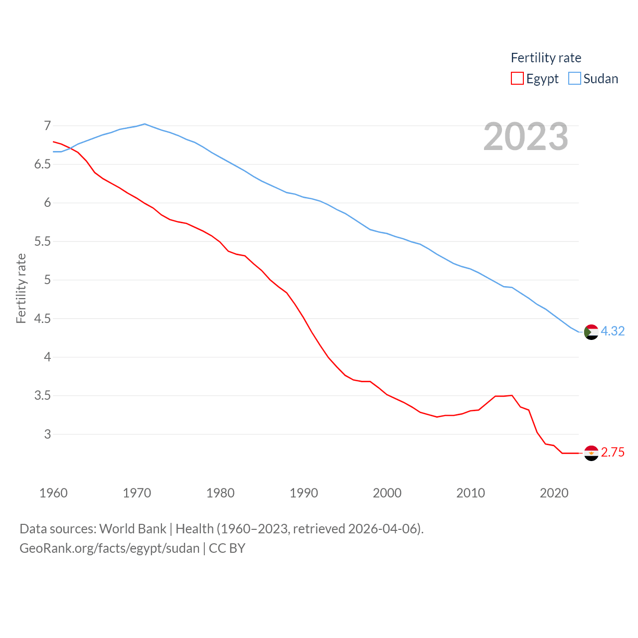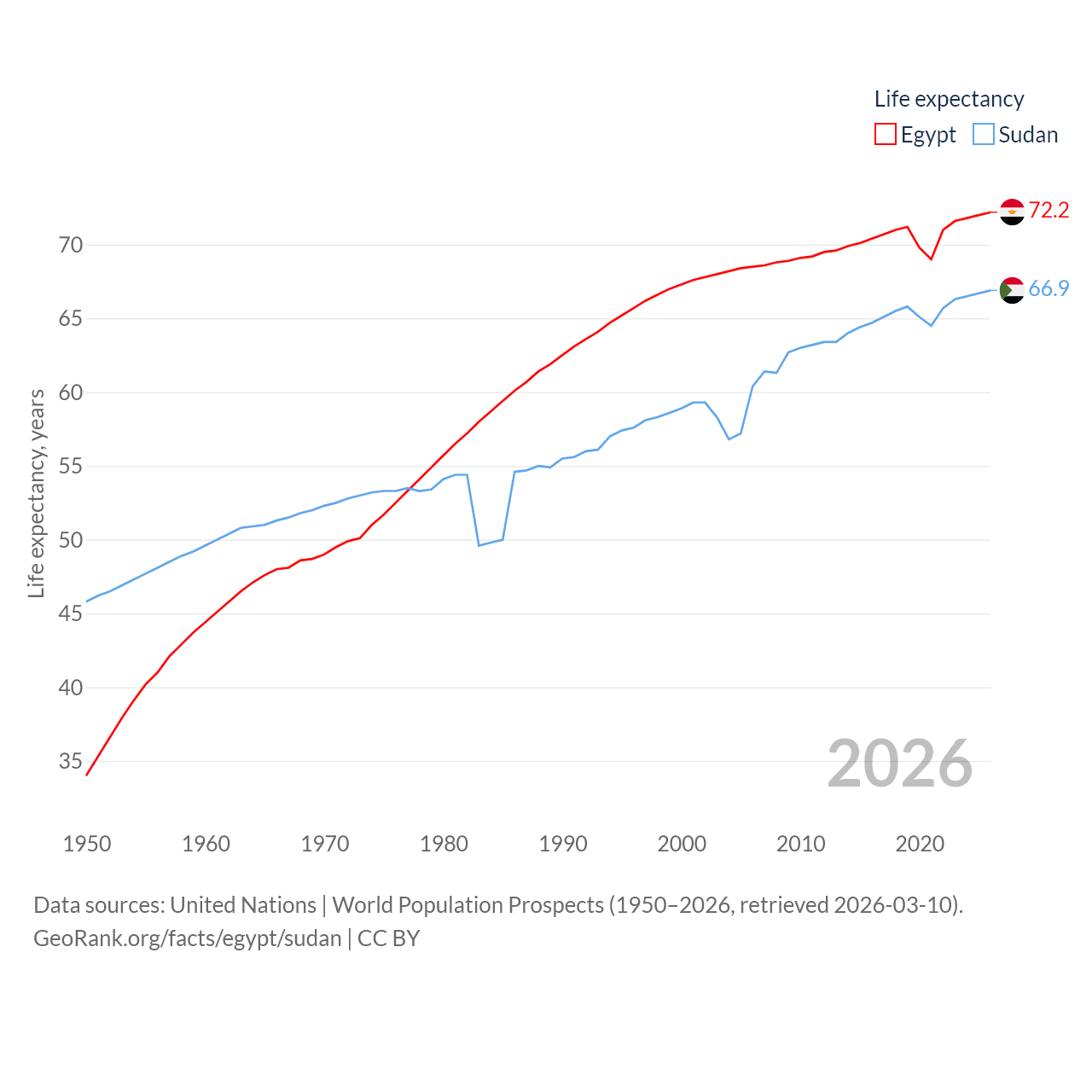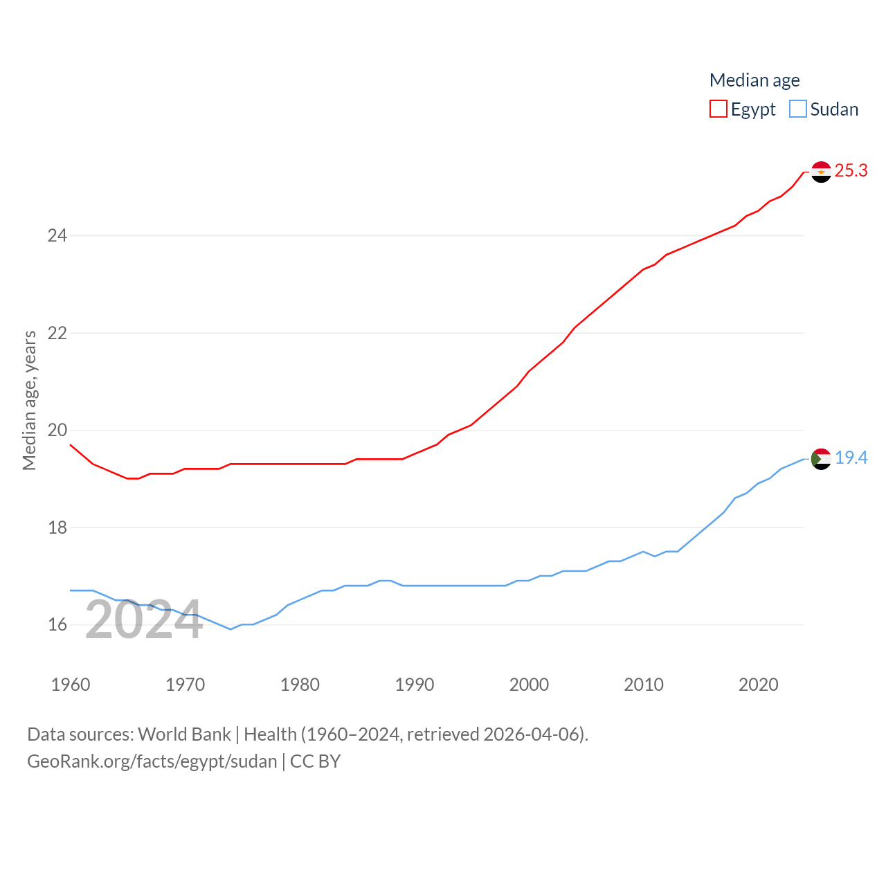 Egypt has a population of 117M (ranked 13/197), compared with 50.4M in Sudan (ranked 30/197). Egypt's land area is 384,345 sq mi versus 721,239 sq mi for Sudan (ranked 29th vs. 15th).