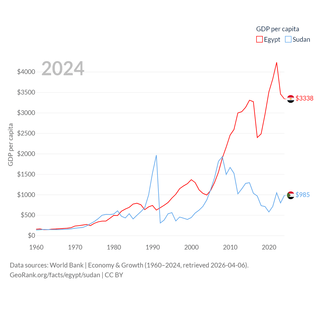 By GDP, Egypt ranks 41/197 ($389B) and Sudan ranks 94/197 ($49.7B). By GDP per capita, Egypt ranks 138/197 ($3,338), while Sudan ranks 179/197 ($985).
