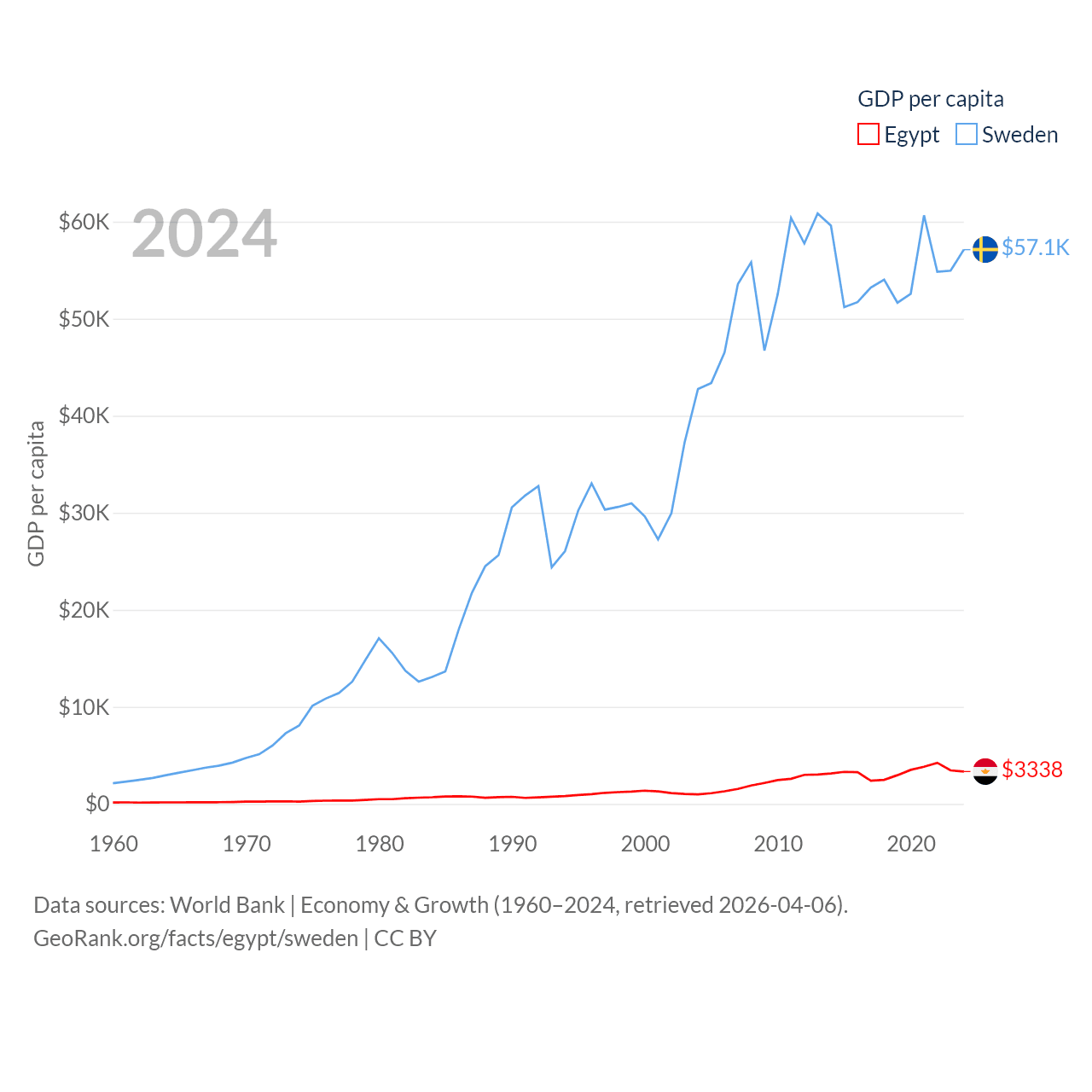 By GDP, Egypt ranks 41/197 ($389B) and Sweden ranks 26/197 ($604B). By GDP per capita, Egypt ranks 138/197 ($3,338), while Sweden ranks 17/197 ($57,117).
