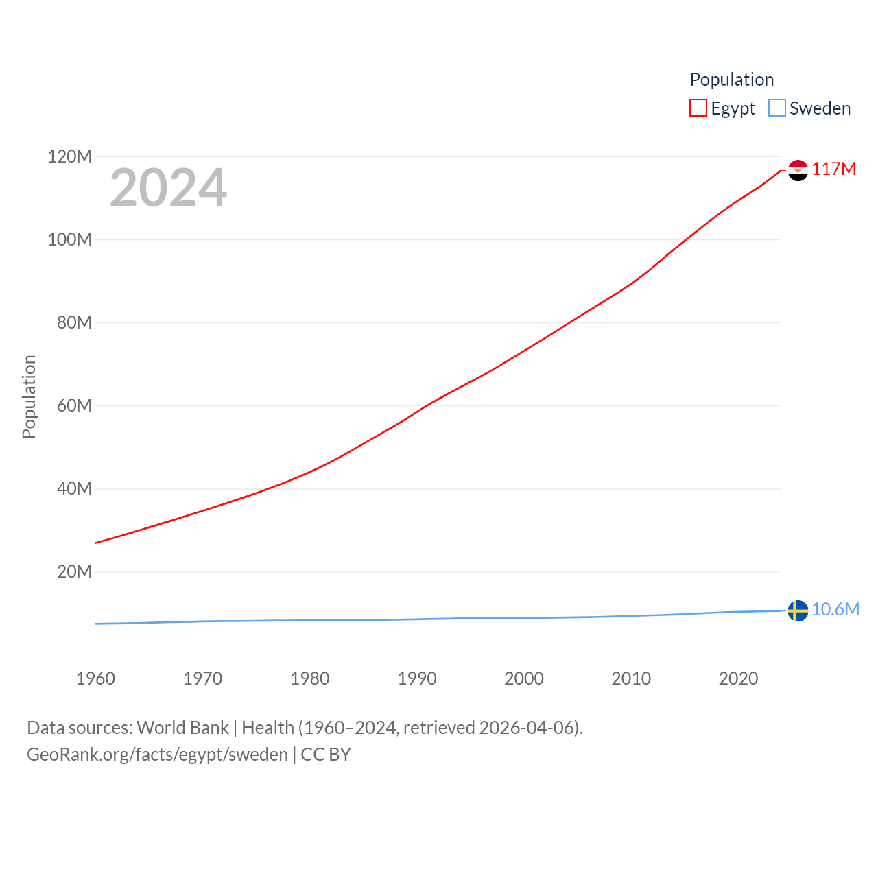 Egypt has a population of 117M (ranked 13/197), compared with 10.6M in Sweden (ranked 93/197). Egypt's land area is 384,345 sq mi versus 157,248 sq mi for Sweden (ranked 29th vs. 58th).