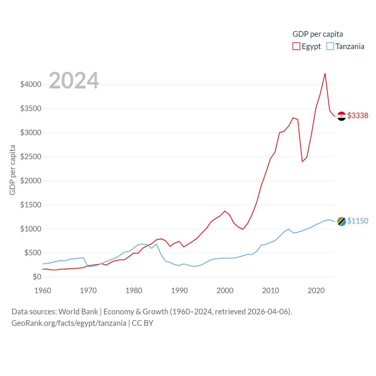 By GDP, Egypt ranks 41/197 ($389B) and Tanzania ranks 82/197 ($78.8B). By GDP per capita, Egypt ranks 138/197 ($3,338), while Tanzania ranks 170/197 ($1,150).