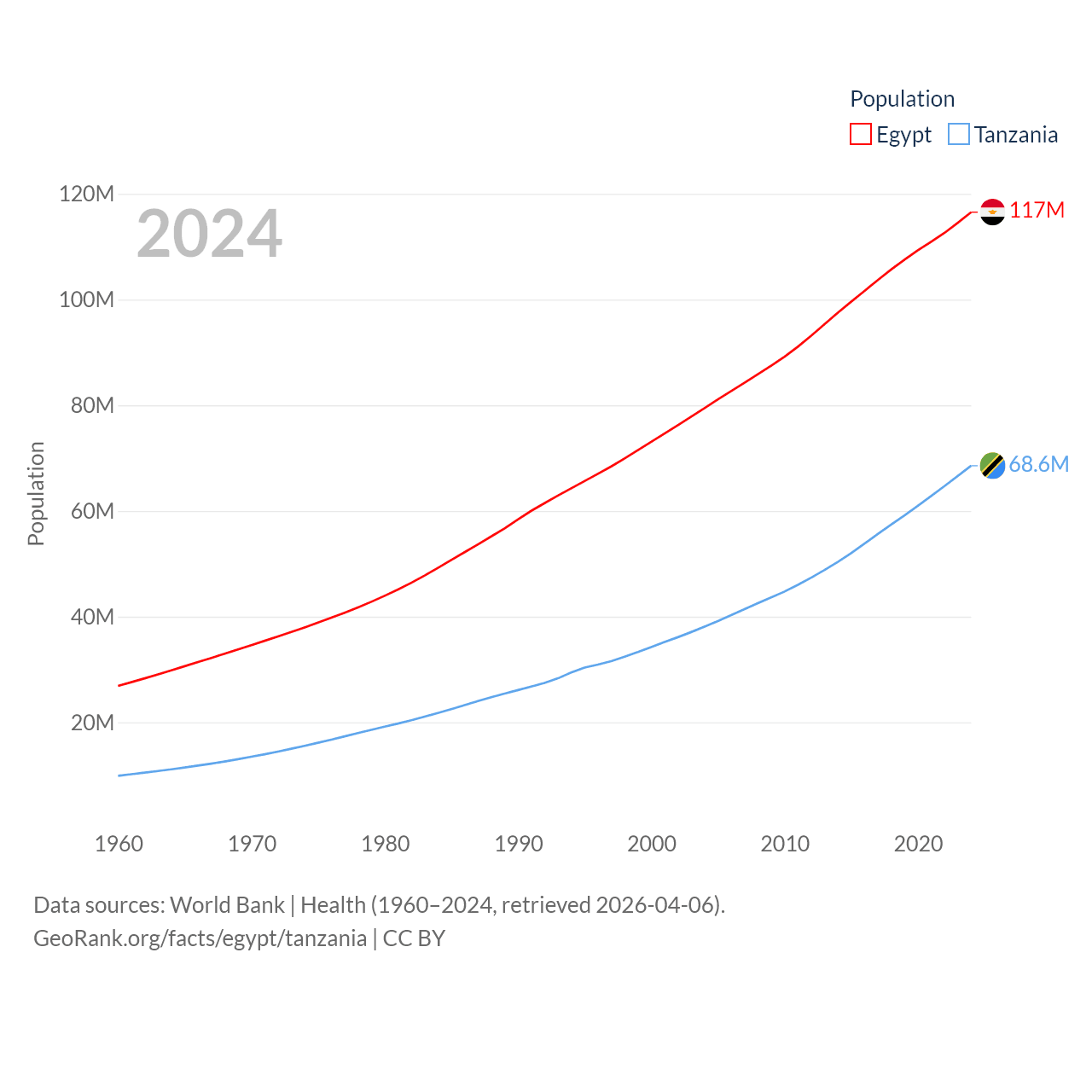 Egypt has a population of 117M (ranked 13/197), compared with 68.6M in Tanzania (ranked 22/197). Egypt's land area is 384,345 sq mi versus 342,009 sq mi for Tanzania (ranked 29th vs. 31st).
