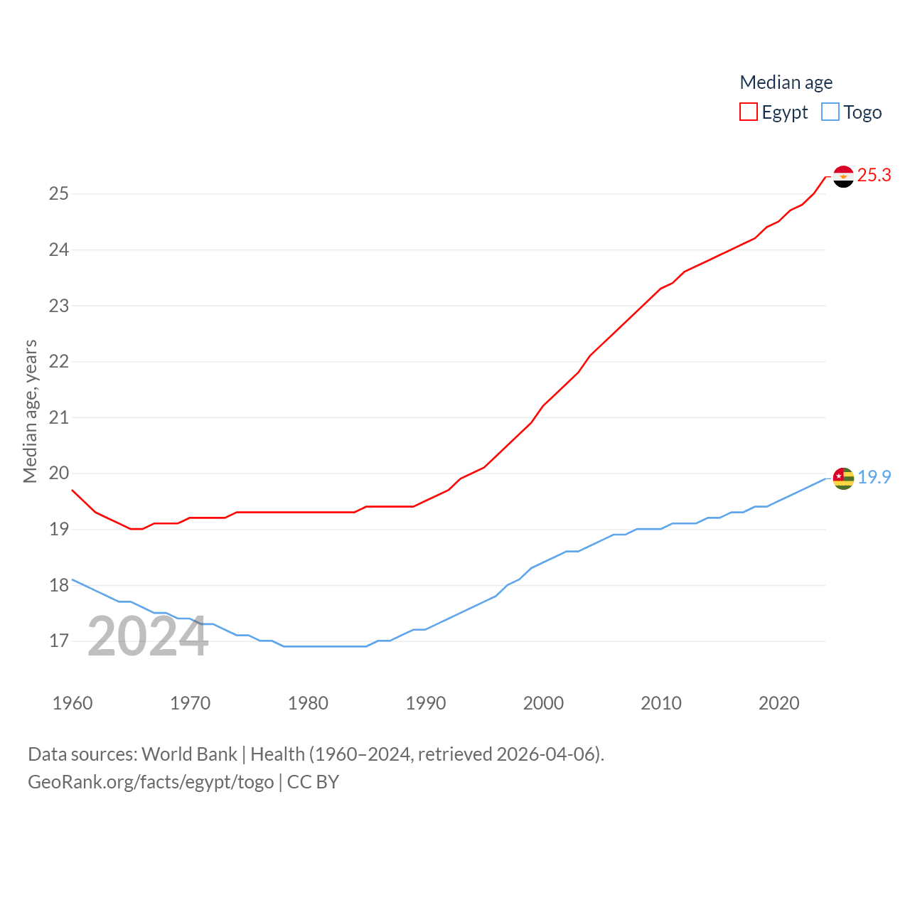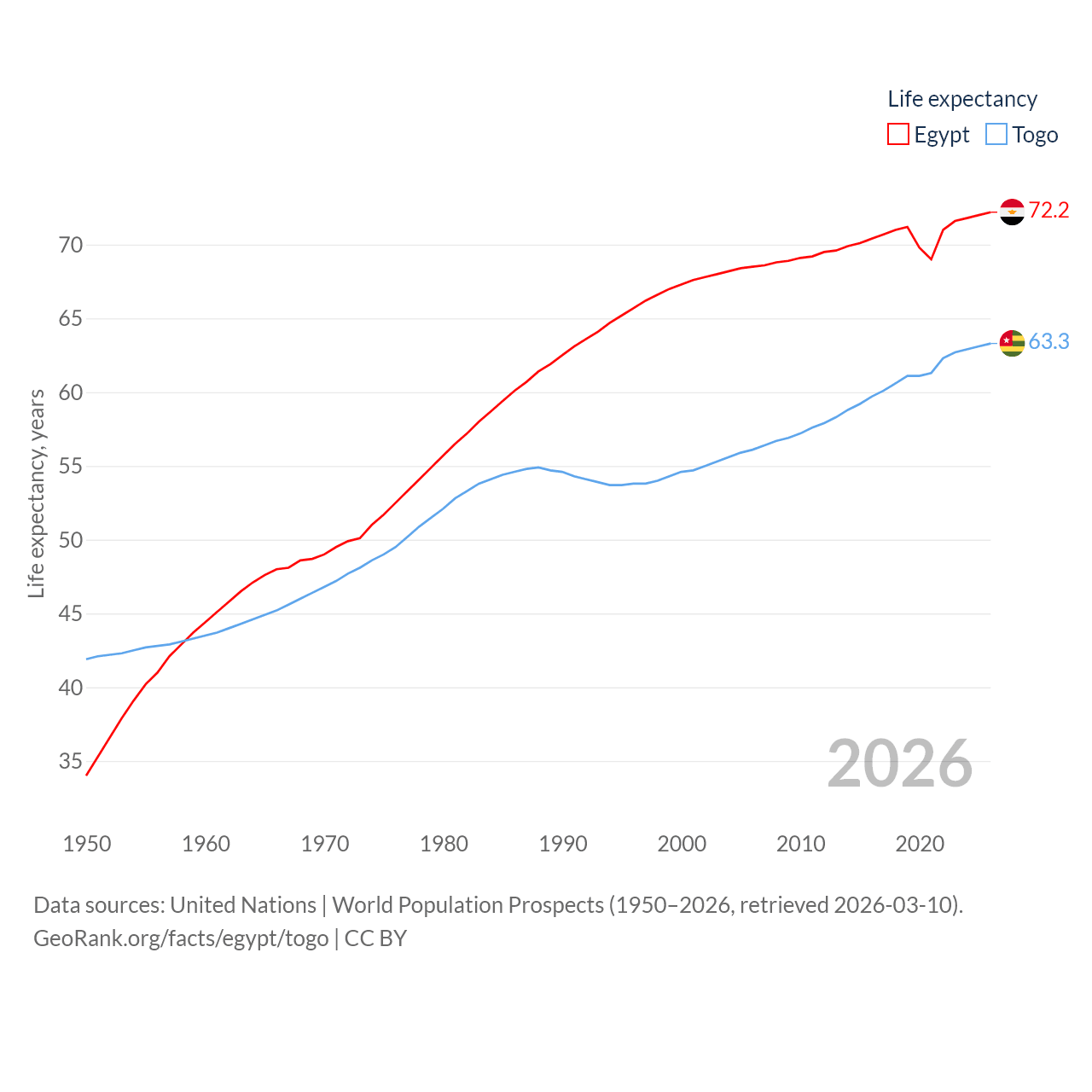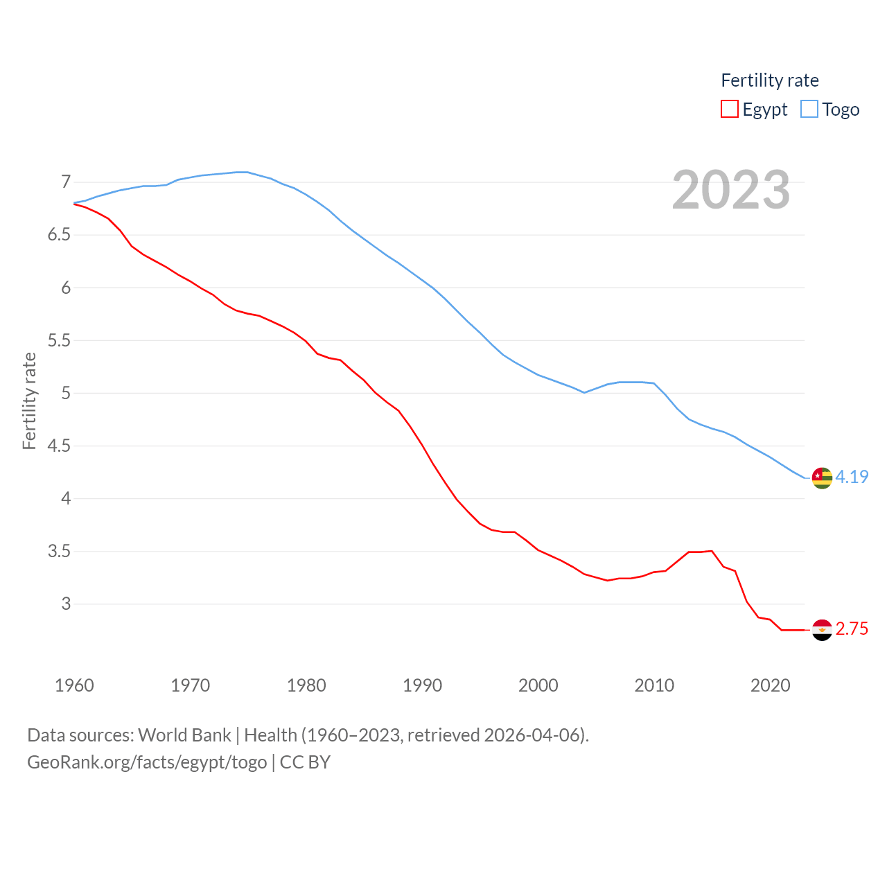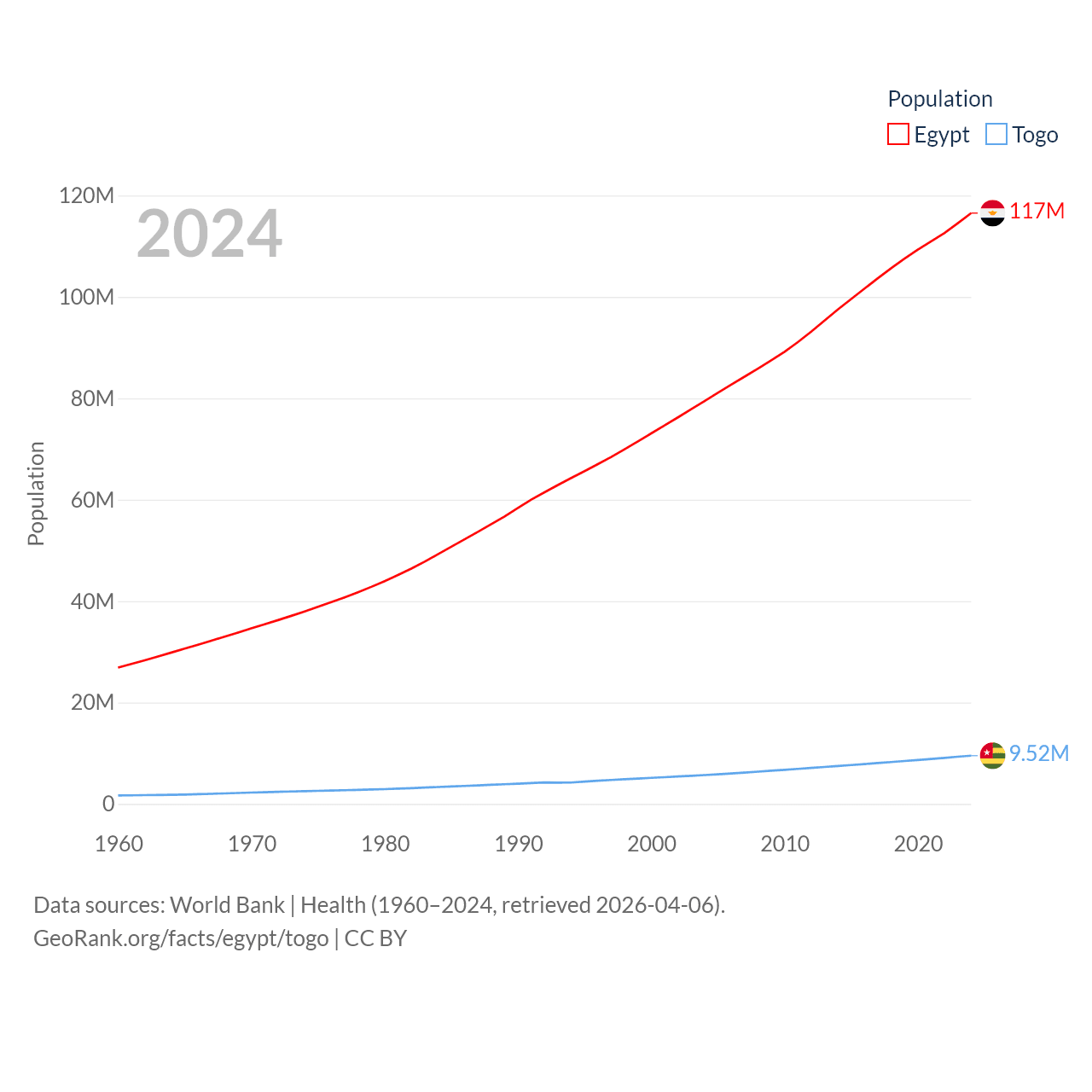 Egypt has a population of 117M (ranked 13/197), compared with 9.52M in Togo (ranked 98/197). Egypt's land area is 384,345 sq mi versus 21,000 sq mi for Togo (ranked 29th vs. 124th).