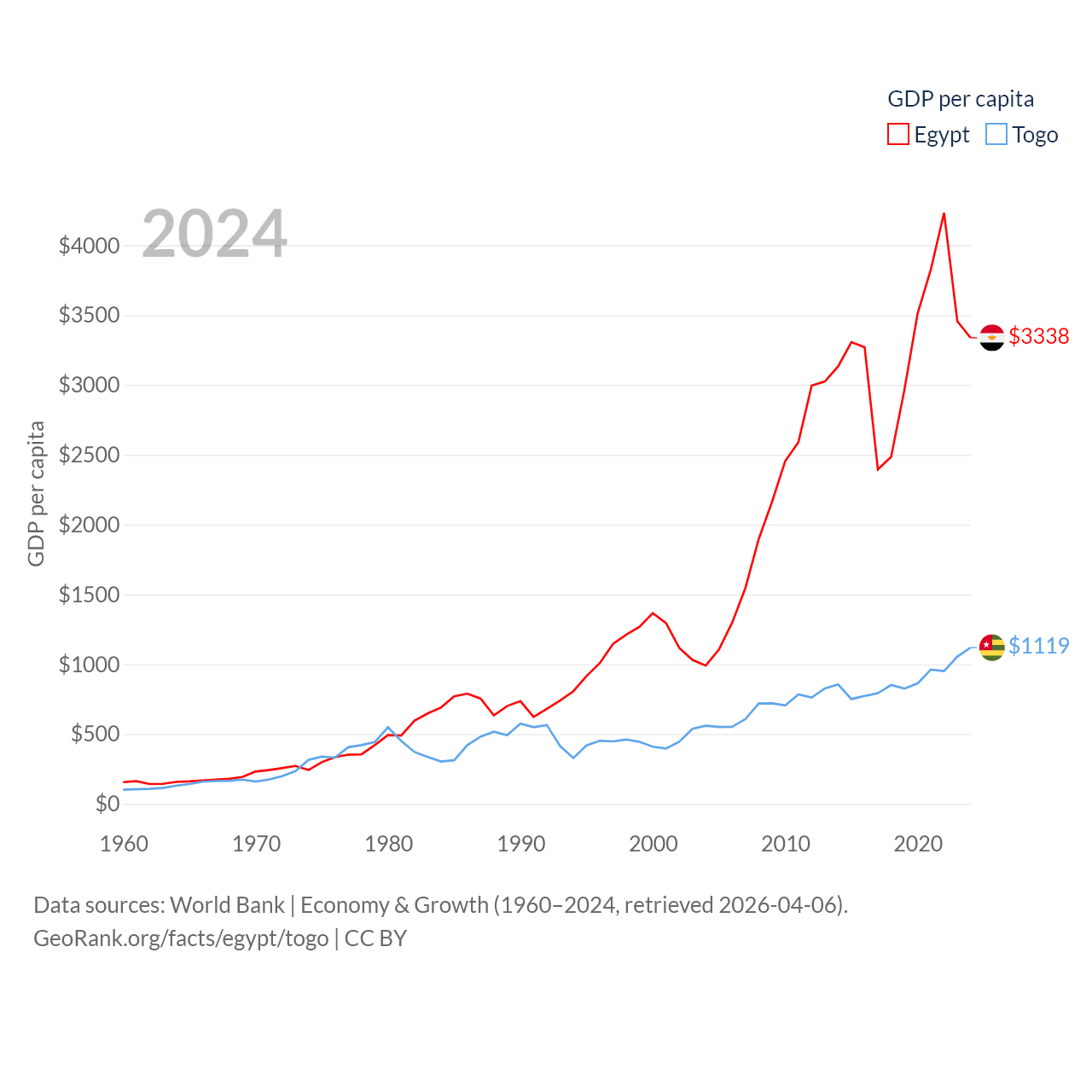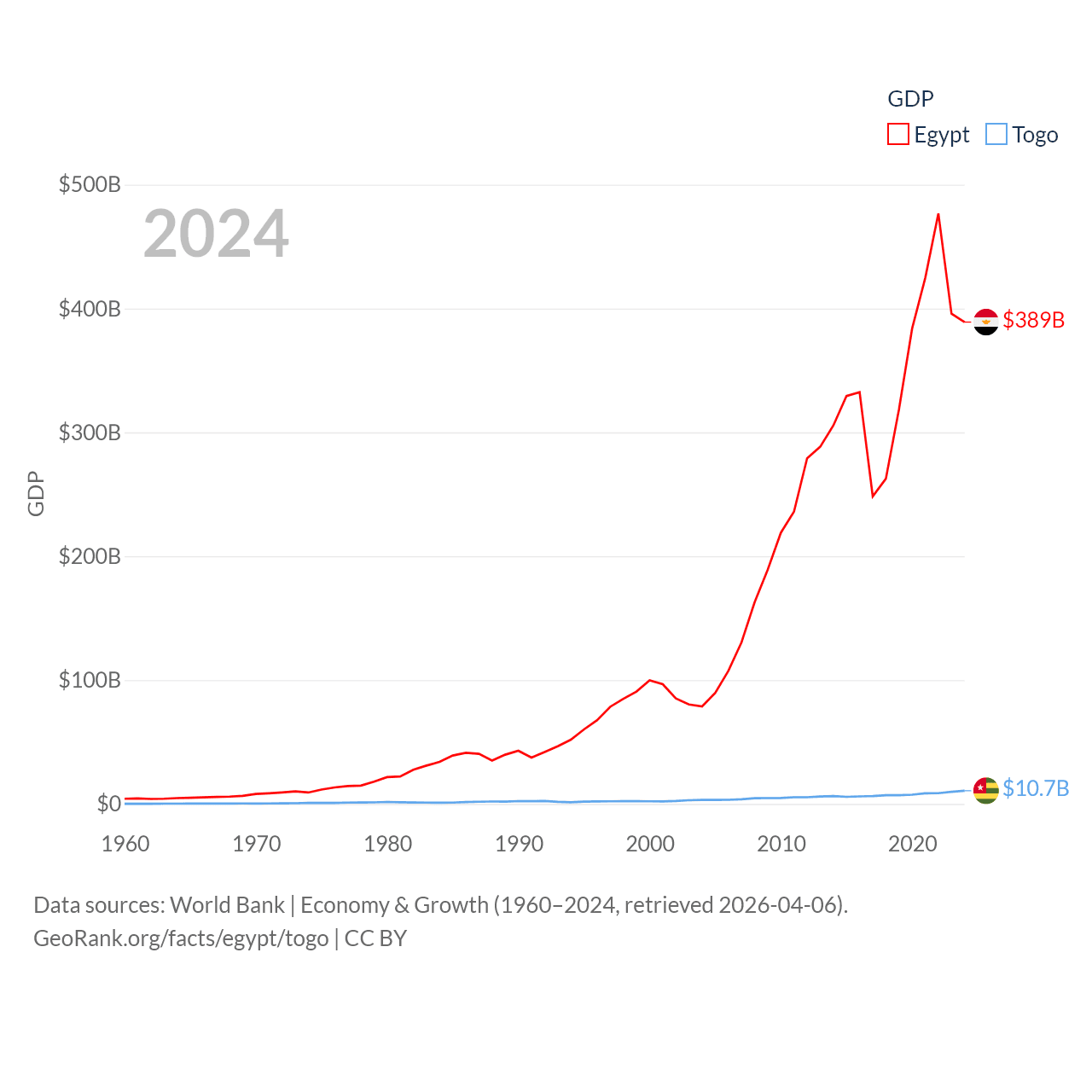 By GDP, Egypt ranks 41/197 ($389B) and Togo ranks 154/197 ($10.7B). By GDP per capita, Egypt ranks 138/197 ($3,338), while Togo ranks 172/197 ($1,119).
