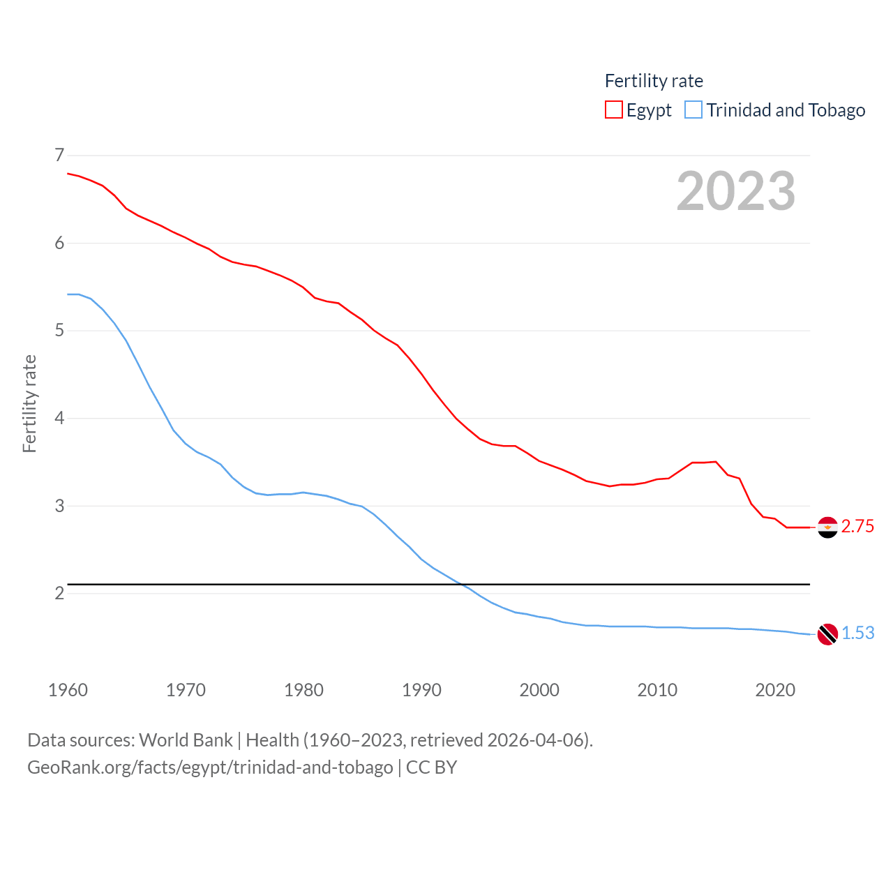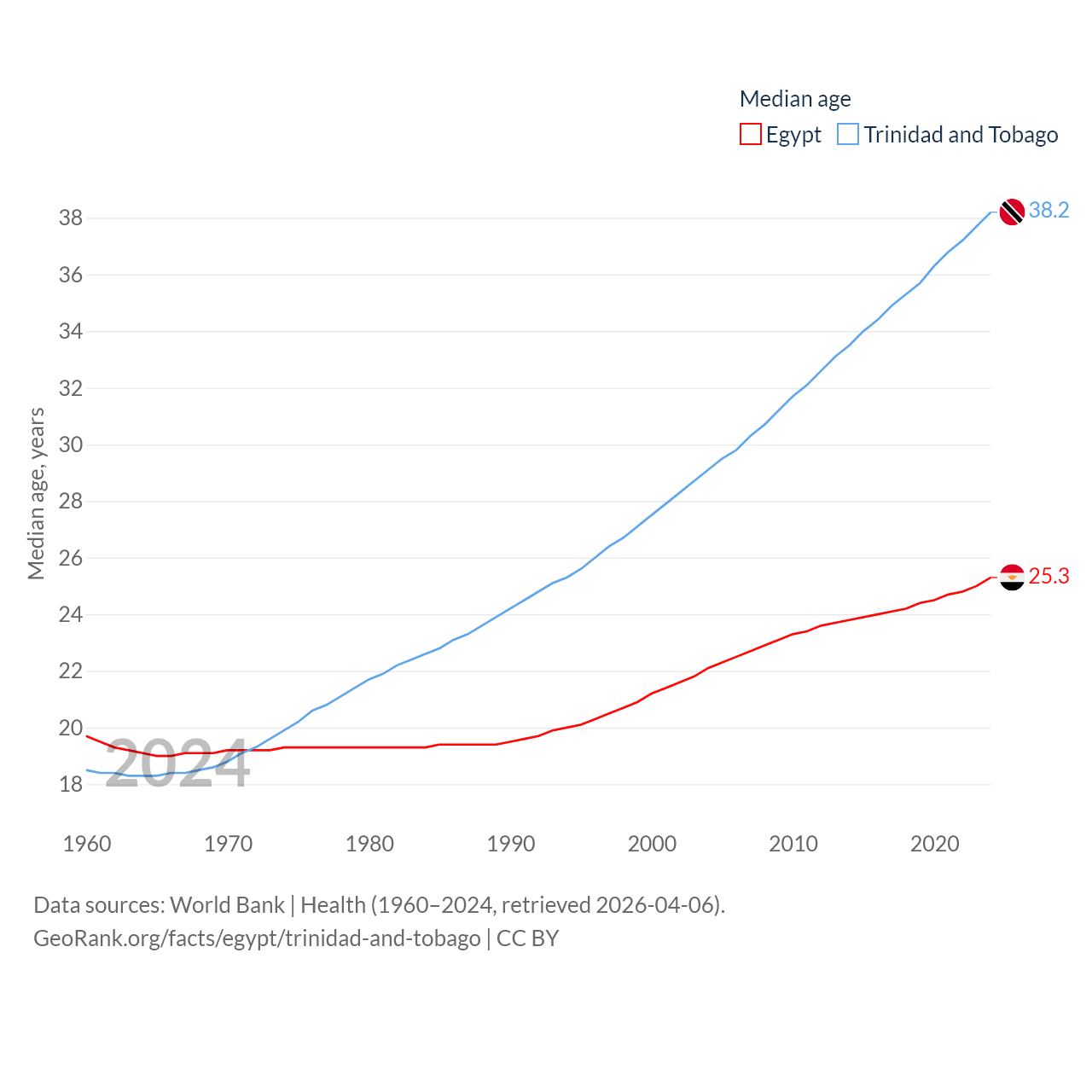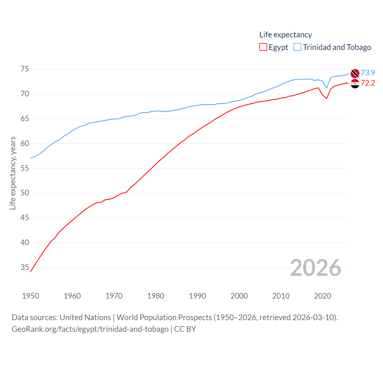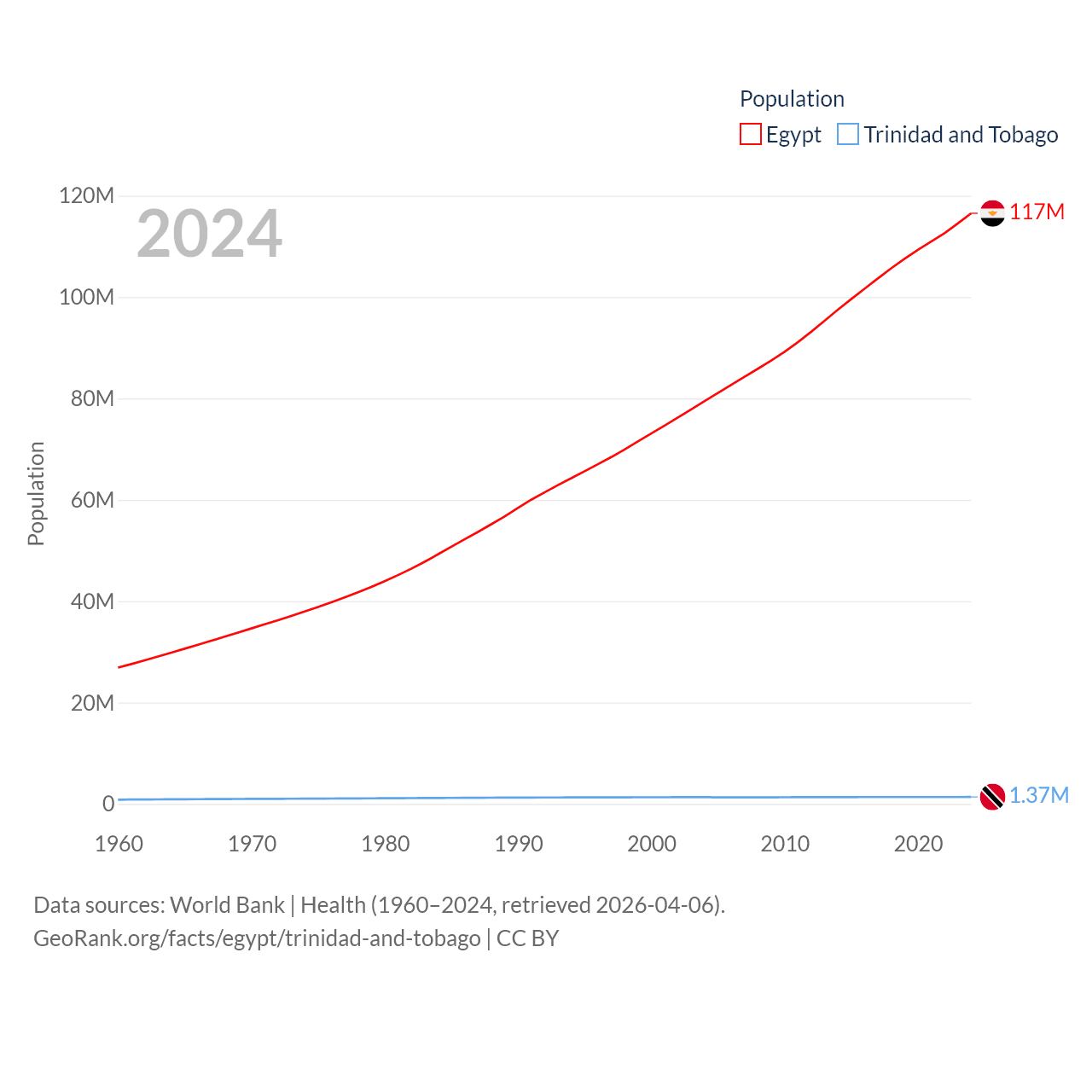 Egypt has a population of 117M (ranked 13/197), compared with 1.37M in Trinidad and Tobago (ranked 154/197). Egypt's land area is 384,345 sq mi versus 1,981 sq mi for Trinidad and Tobago (ranked 29th vs. 166th).