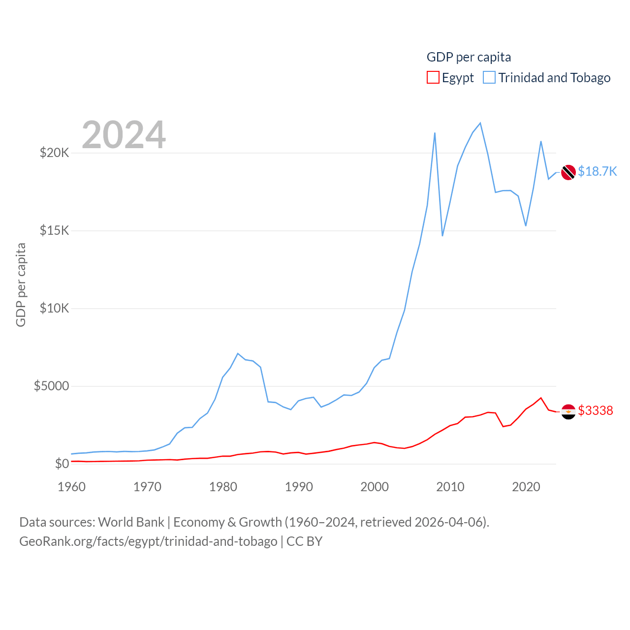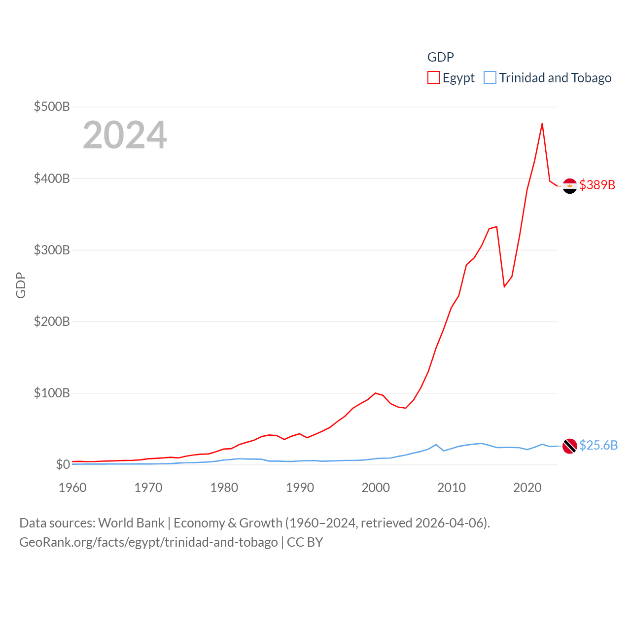 By GDP, Egypt ranks 41/197 ($389B) and Trinidad and Tobago ranks 115/197 ($25.6B). By GDP per capita, Egypt ranks 138/197 ($3,338), while Trinidad and Tobago ranks 61/197 ($18,733).