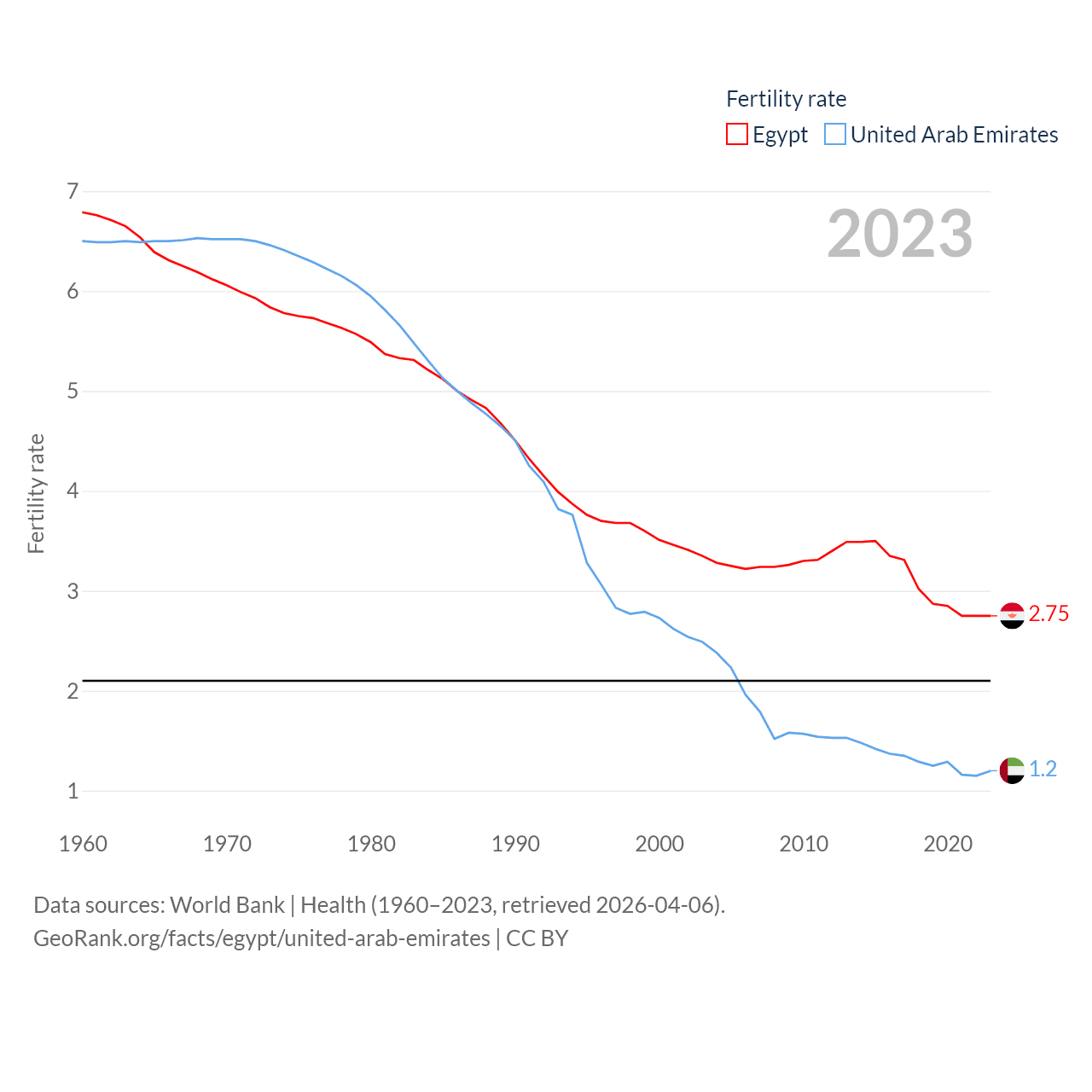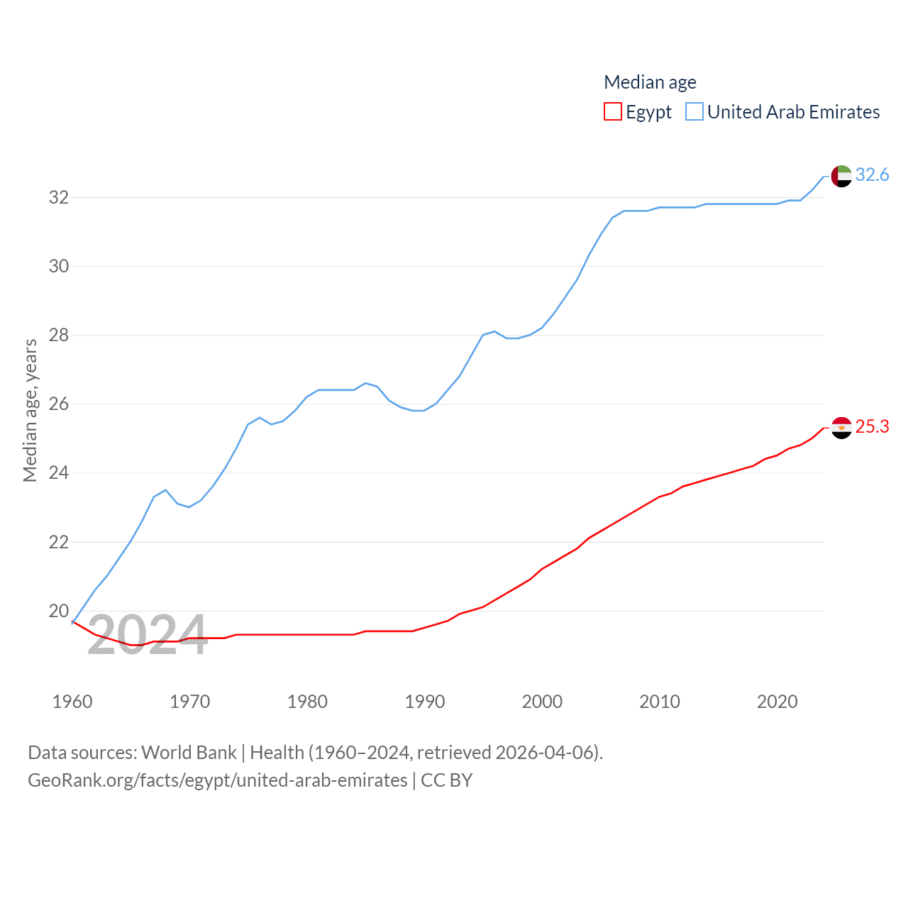 Egypt has a population of 117M (ranked 13/197), compared with 11M in The United Arab Emirates (ranked 86/197). Egypt's land area is 384,345 sq mi versus 27,421 sq mi for The United Arab Emirates (ranked 29th vs. 117th).