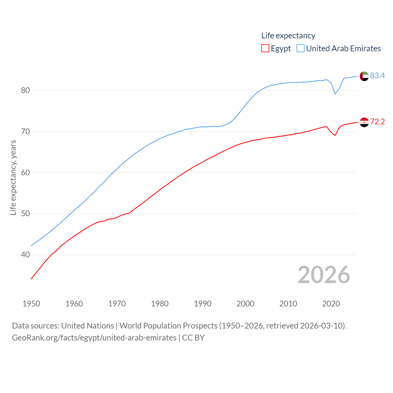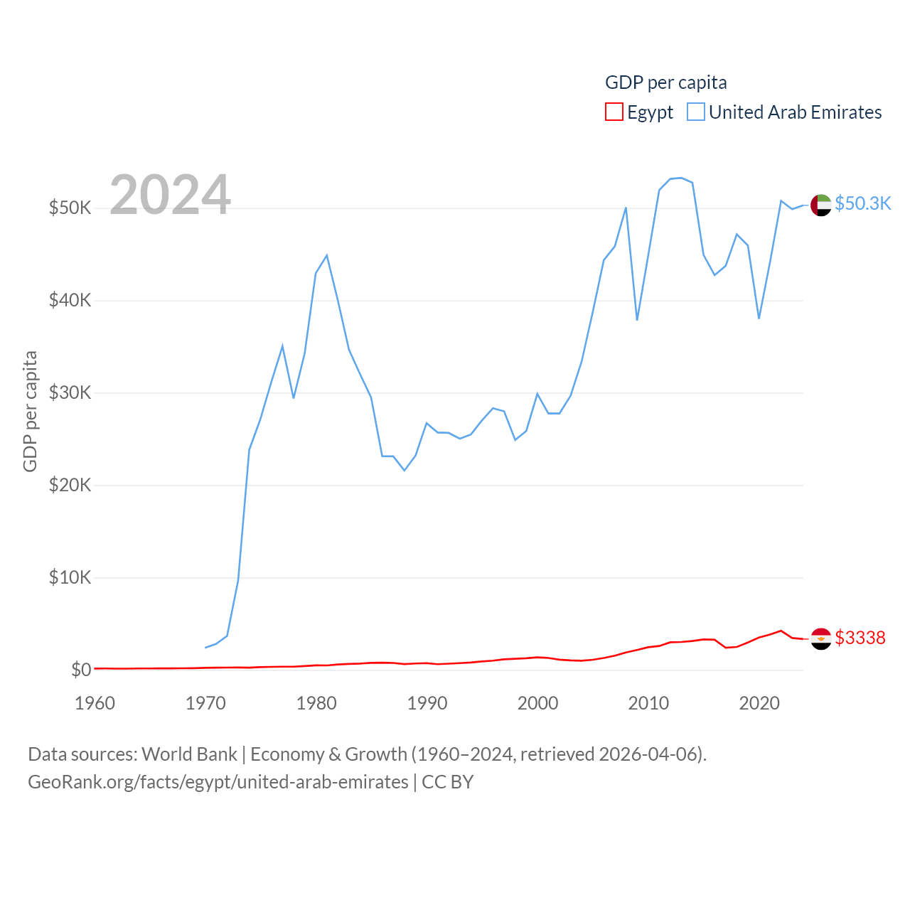 By GDP, Egypt ranks 41/197 ($389B) and The United Arab Emirates ranks 27/197 ($552B). By GDP per capita, Egypt ranks 138/197 ($3,338), while The United Arab Emirates ranks 24/197 ($50,274).