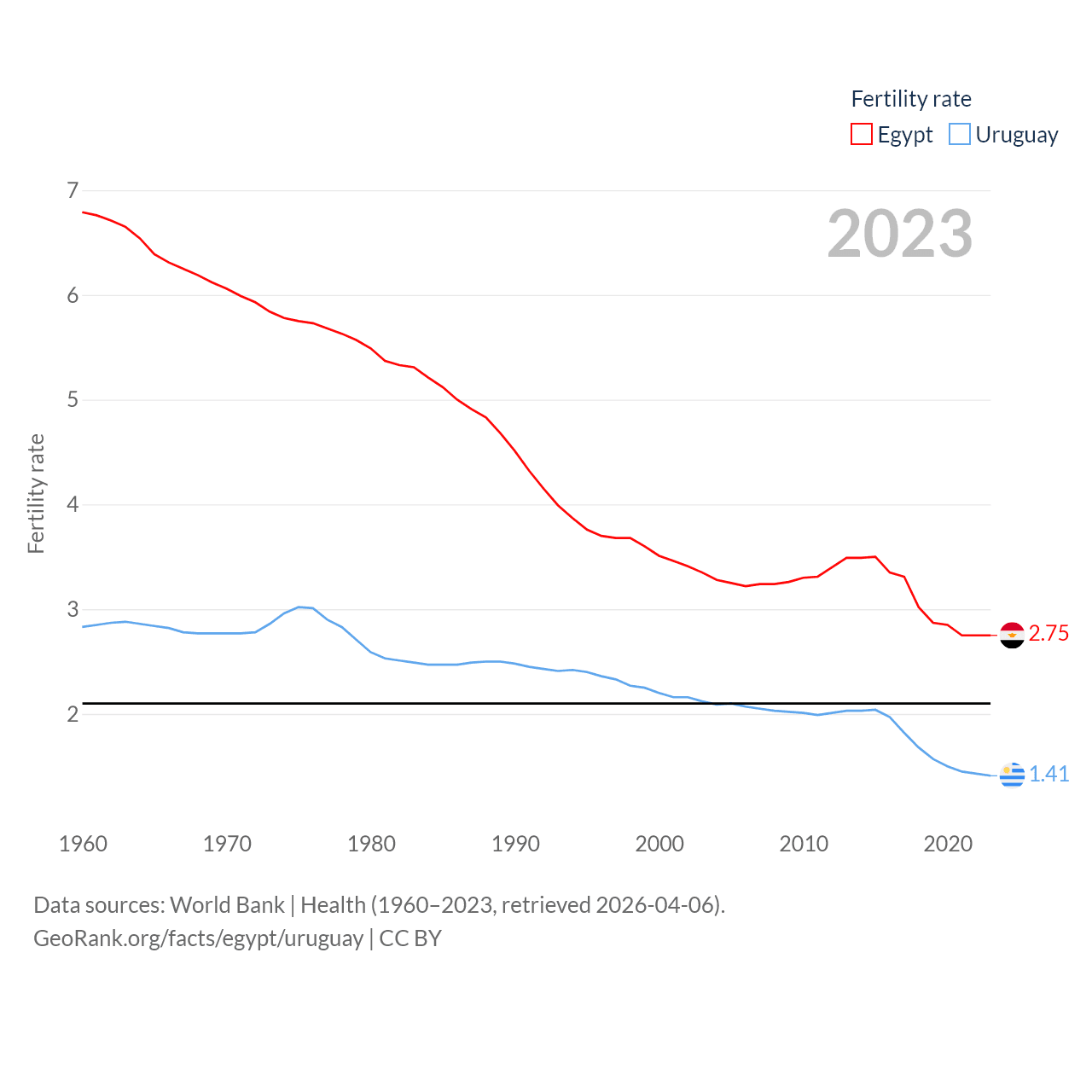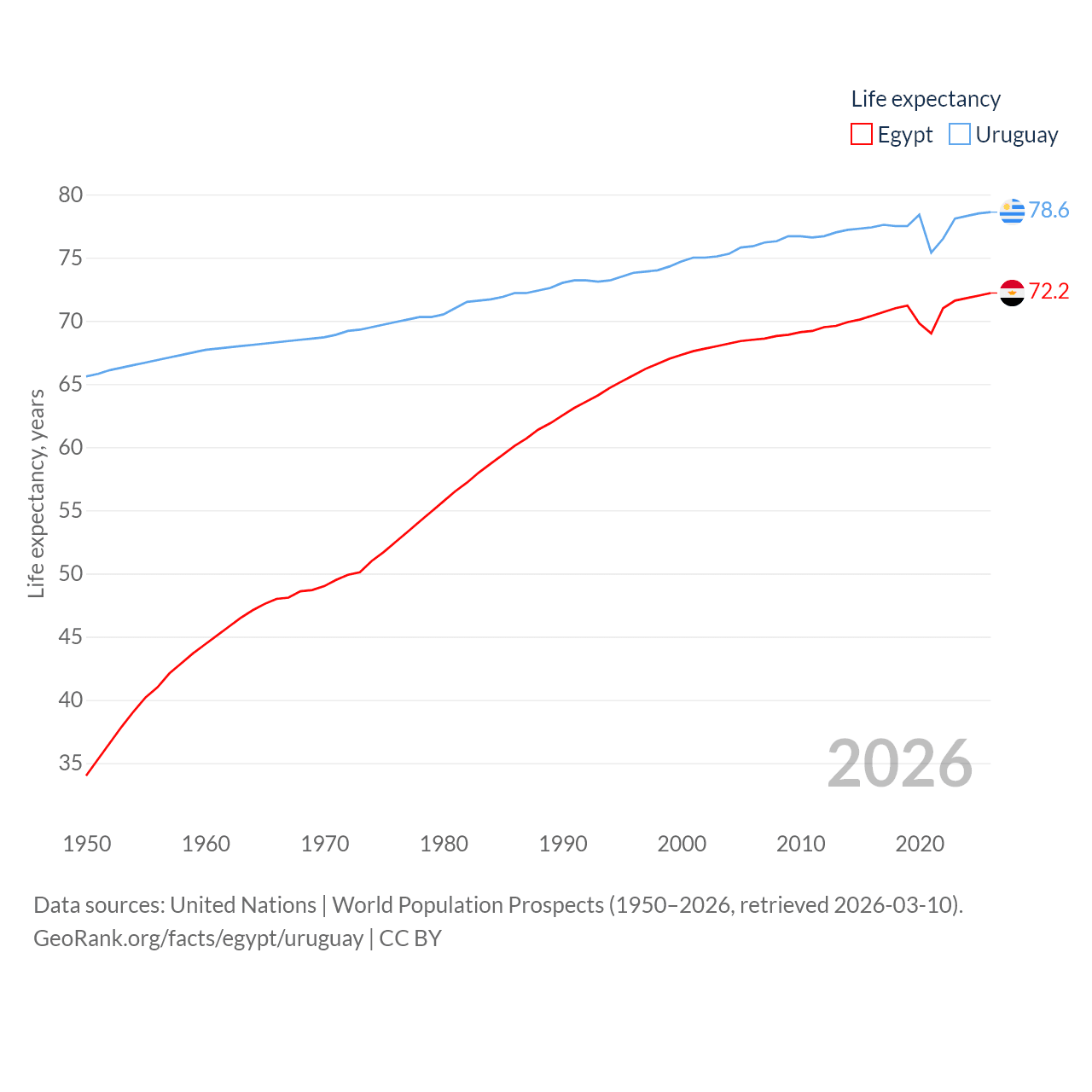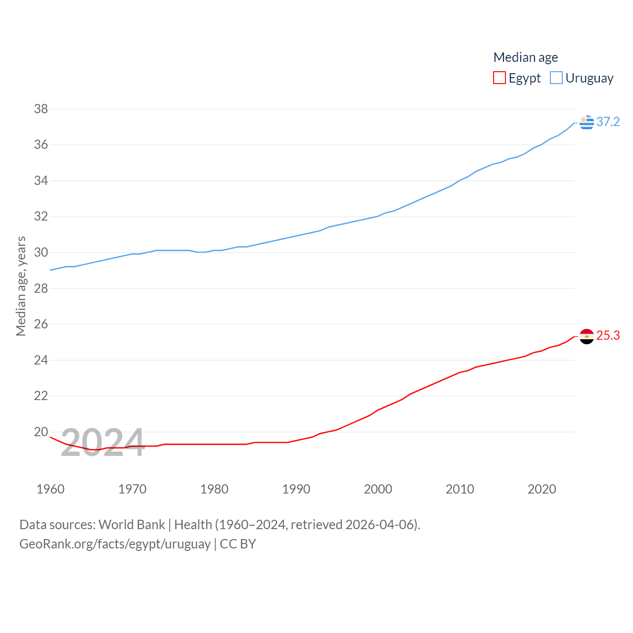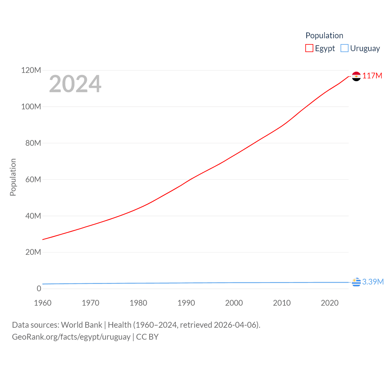 Egypt has a population of 117M (ranked 13/197), compared with 3.39M in Uruguay (ranked 133/197). Egypt's land area is 384,345 sq mi versus 67,576 sq mi for Uruguay (ranked 29th vs. 89th).