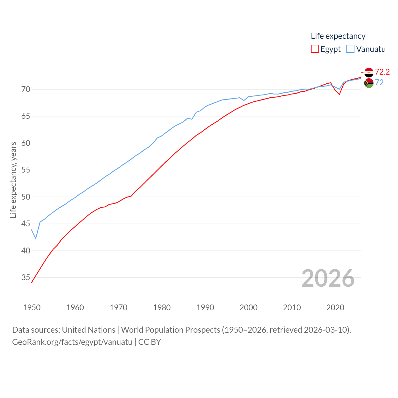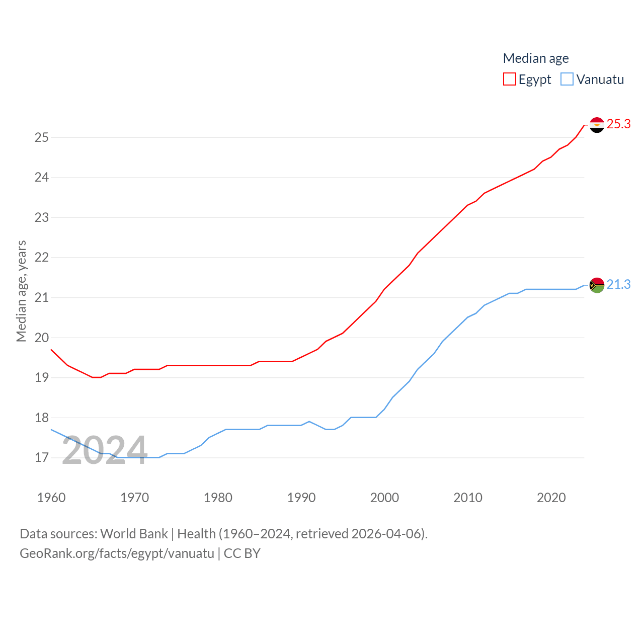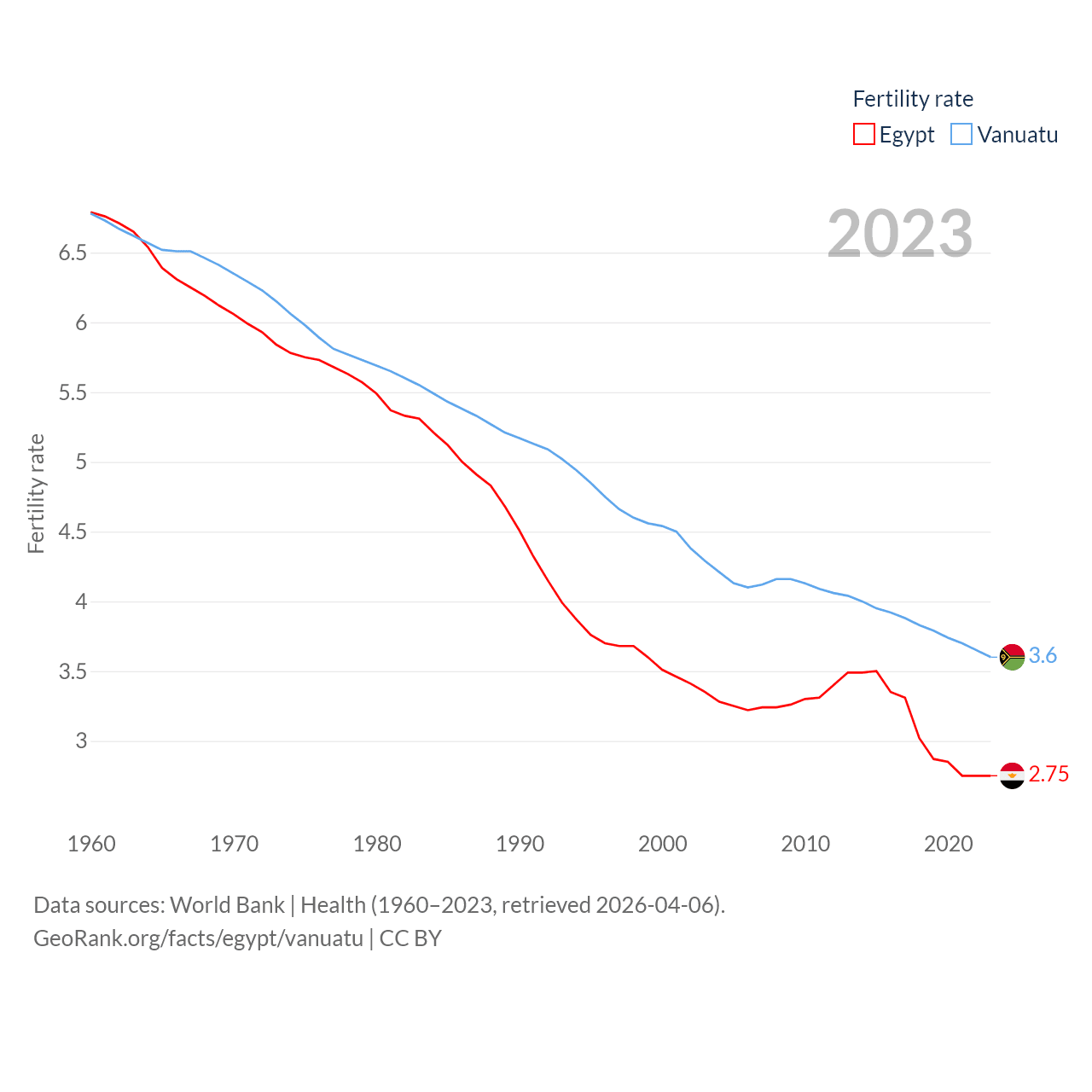 Egypt has a population of 117M (ranked 13/197), compared with 328K in Vanuatu (ranked 174/197). Egypt's land area is 384,345 sq mi versus 4,707 sq mi for Vanuatu (ranked 29th vs. 157th).