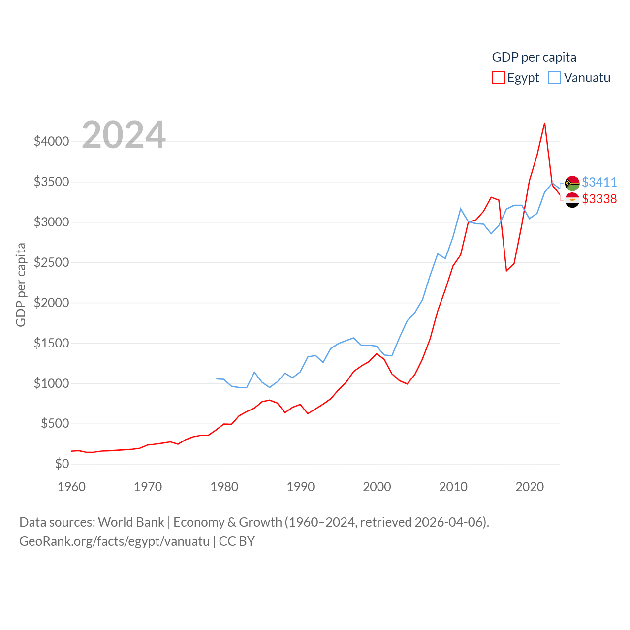 By GDP, Egypt ranks 41/197 ($389B) and Vanuatu ranks 188/197 ($1.12B). By GDP per capita, Egypt ranks 138/197 ($3,338), while Vanuatu ranks 137/197 ($3,411).
