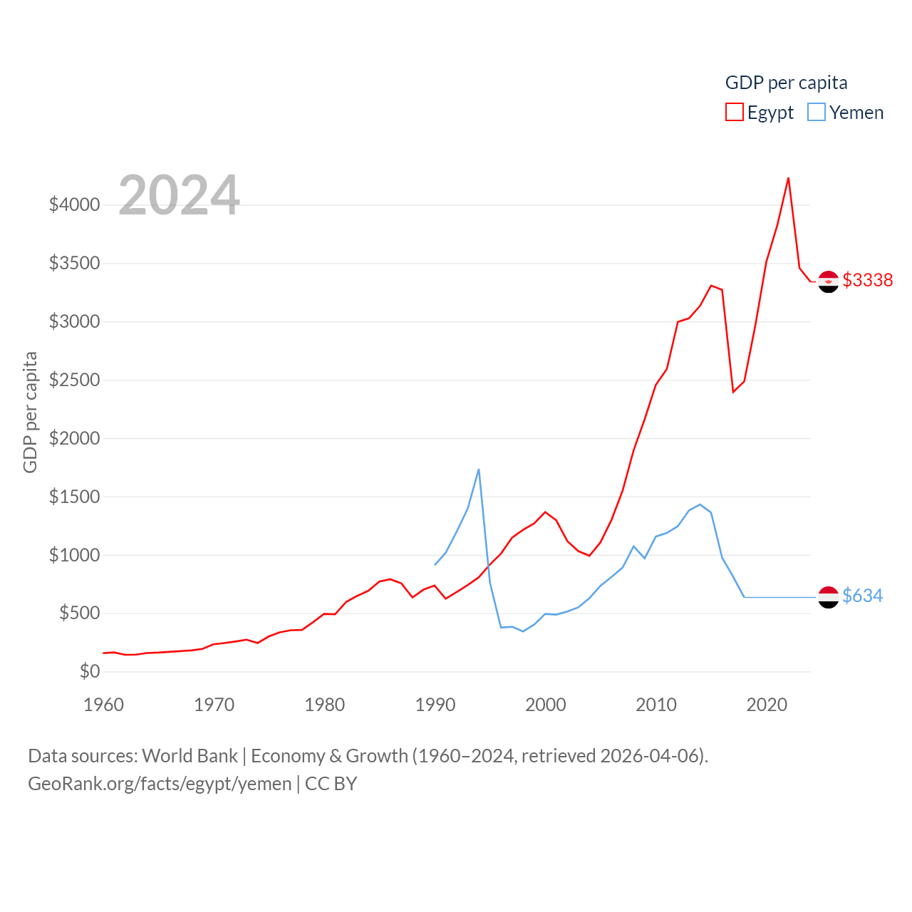 By GDP, Egypt ranks 41/197 ($389B) and Yemen ranks 125/197 ($21.6B). By GDP per capita, Egypt ranks 138/197 ($3,338), while Yemen ranks 191/197 ($634).