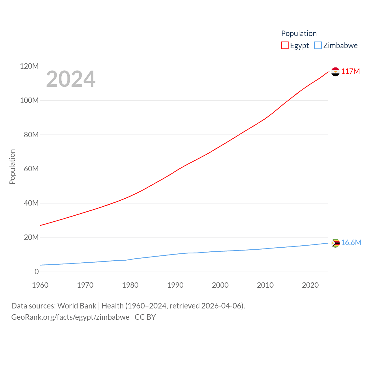 Egypt has a population of 117M (ranked 13/197), compared with 16.6M in Zimbabwe (ranked 74/197). Egypt's land area is 384,345 sq mi versus 149,364 sq mi for Zimbabwe (ranked 29th vs. 60th).