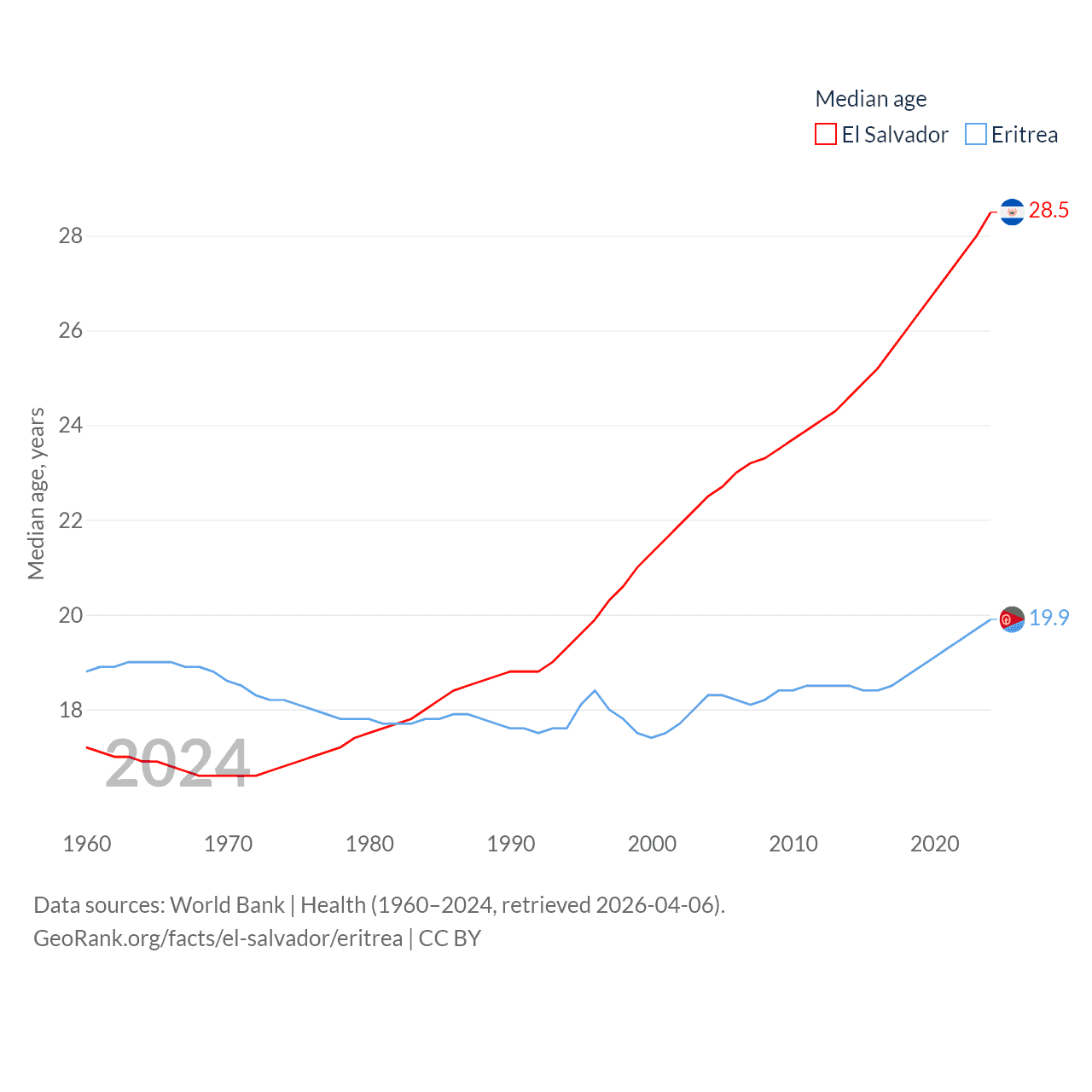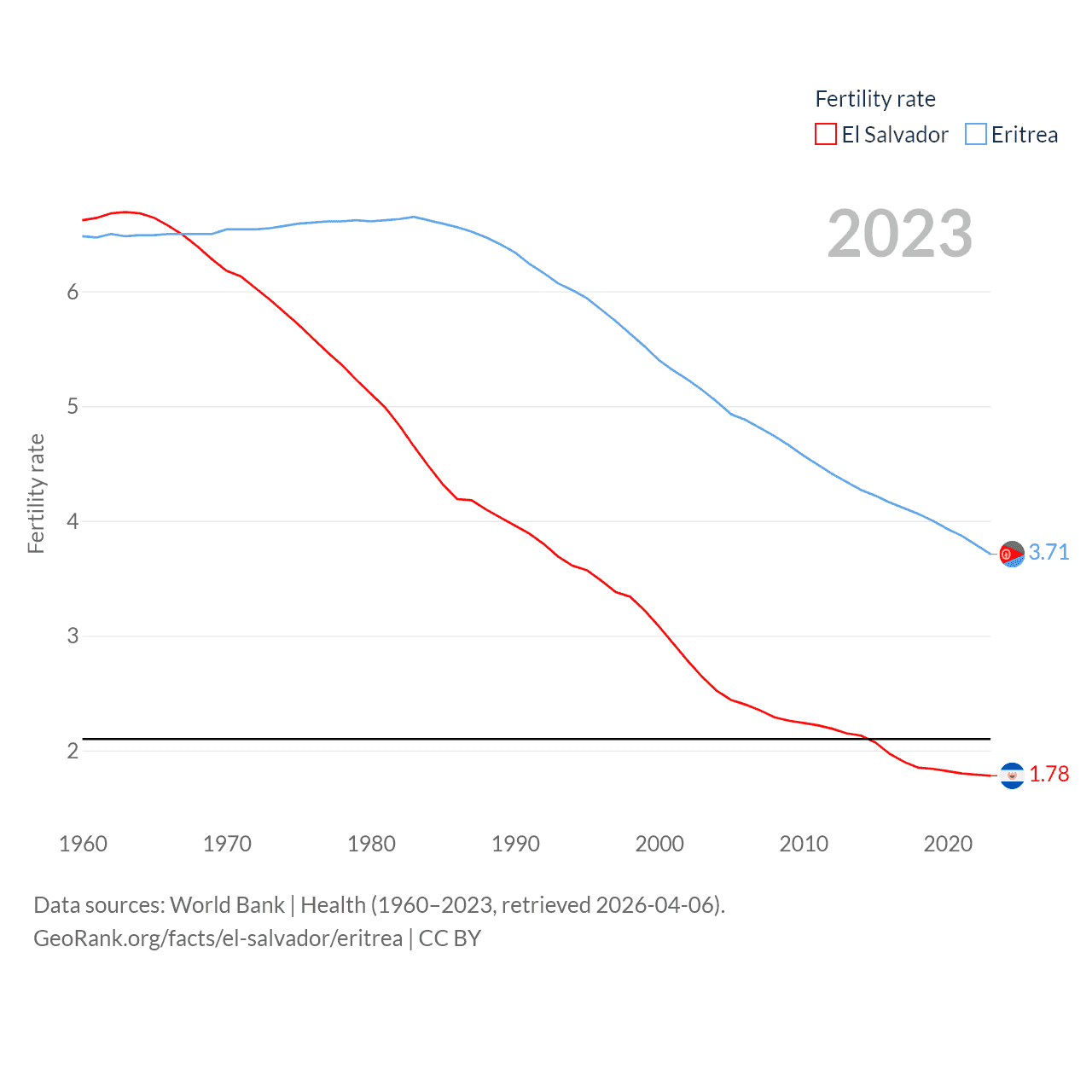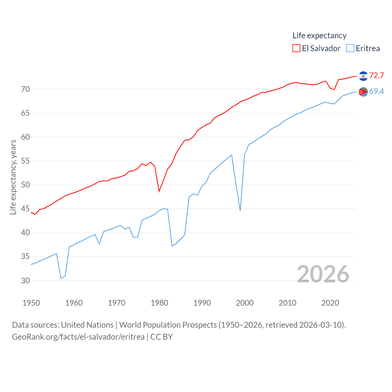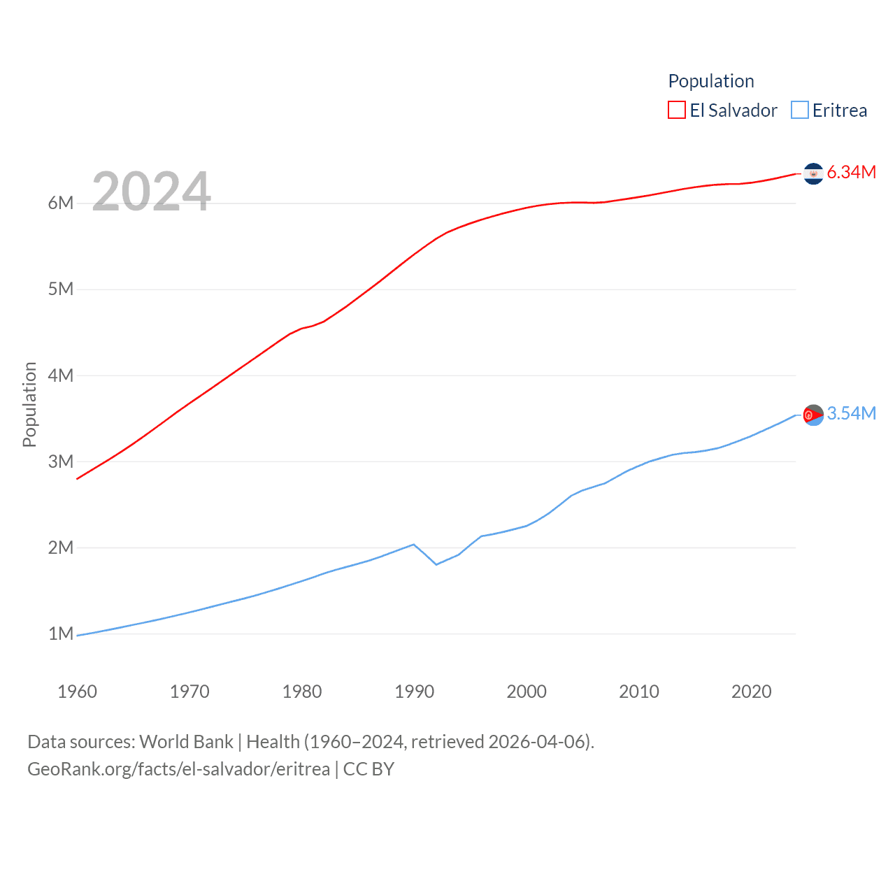 El Salvador has a population of 6.34M (ranked 111/197), compared with 3.54M in Eritrea (ranked 131/197). El Salvador's land area is 8,000 sq mi versus 46,787 sq mi for Eritrea (ranked 150th vs. 96th).