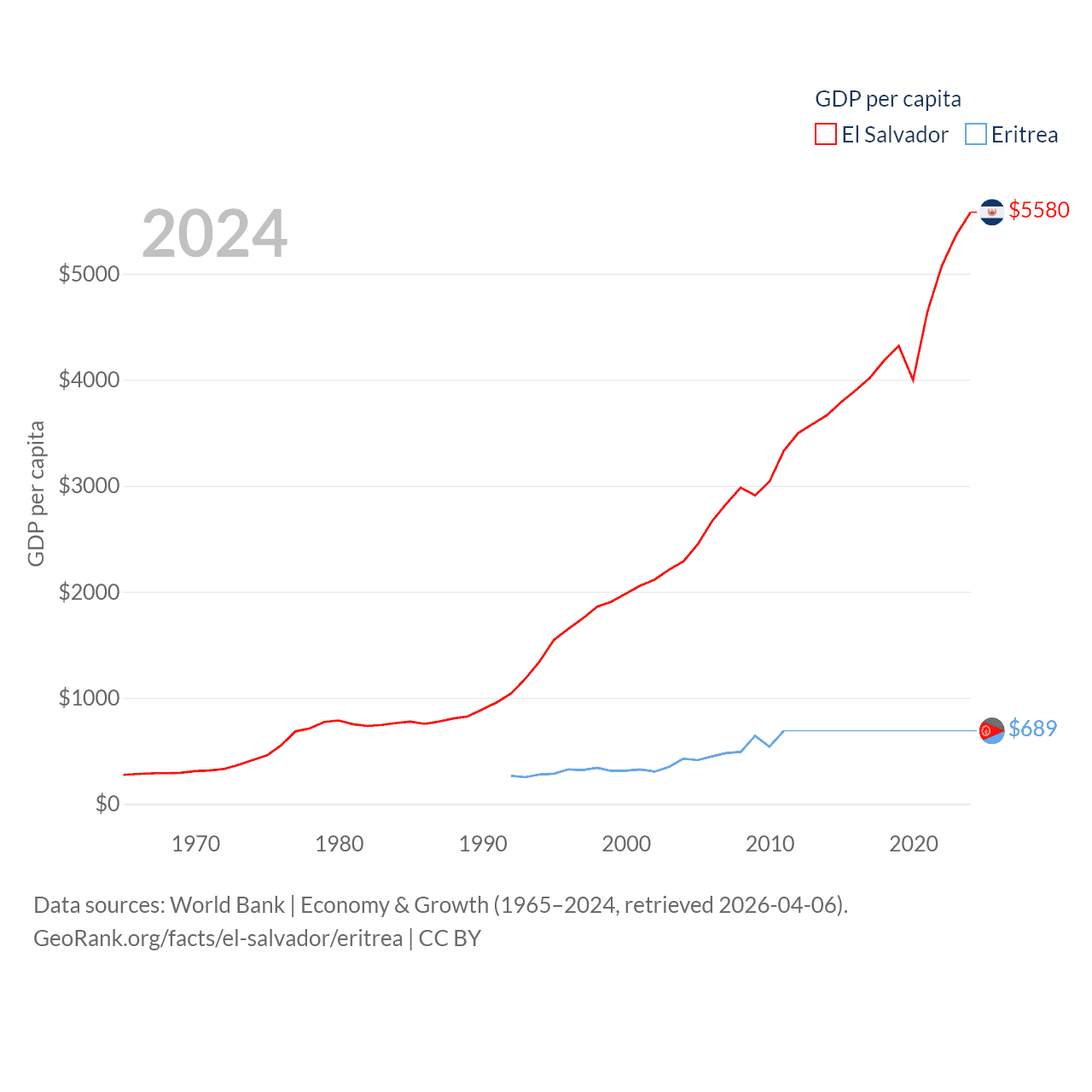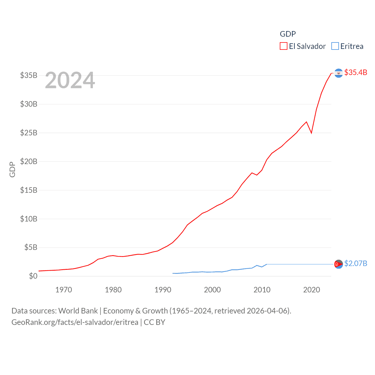 By GDP, El Salvador ranks 105/197 ($35.4B) and Eritrea ranks 179/197 ($2.07B). By GDP per capita, El Salvador ranks 116/197 ($5,580), while Eritrea ranks 188/197 ($689).